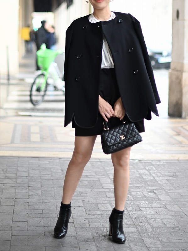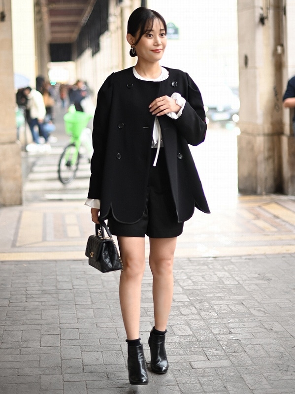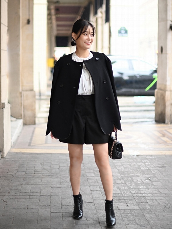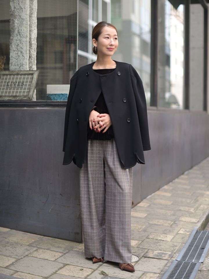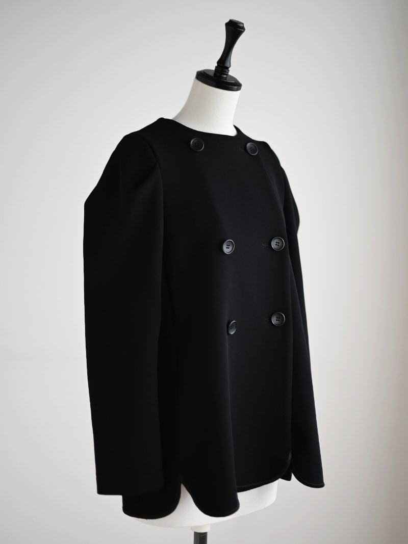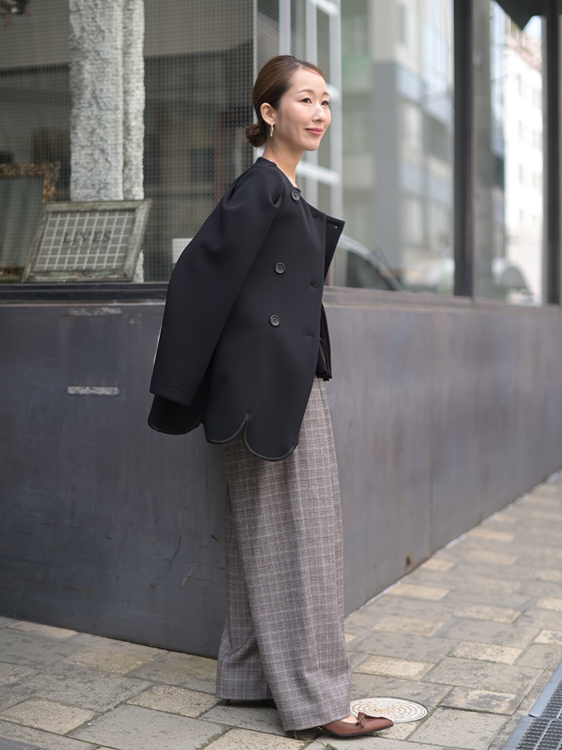 構築的なショルダーデザインで甘さ調整し品のあるジャケットに仕上げました。