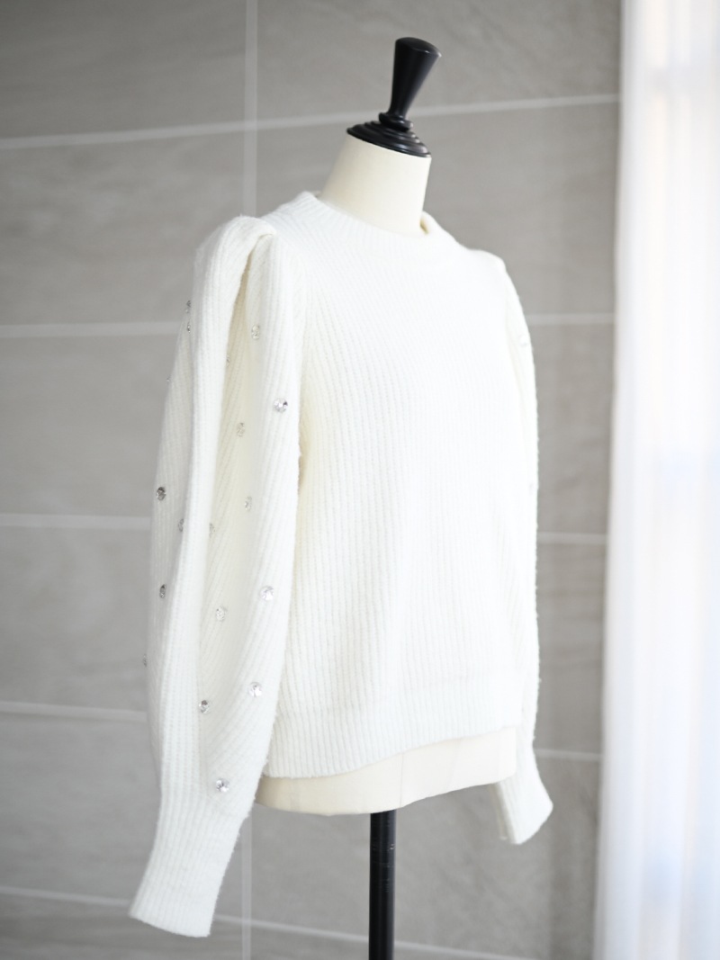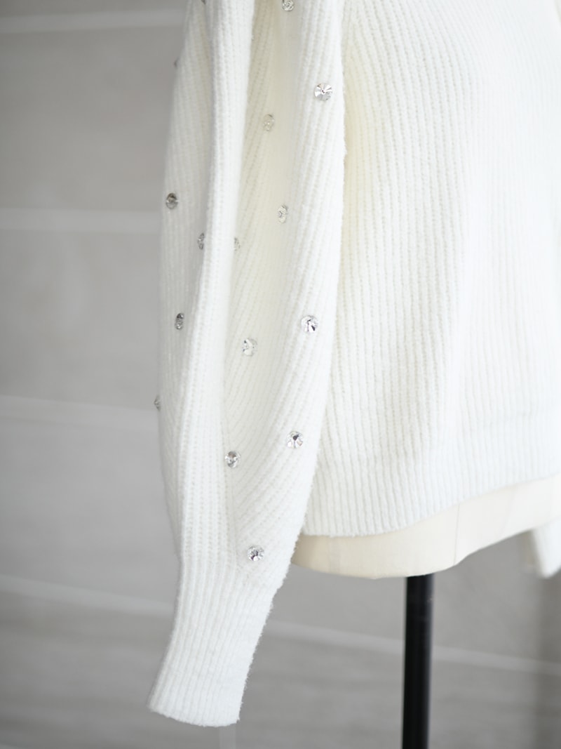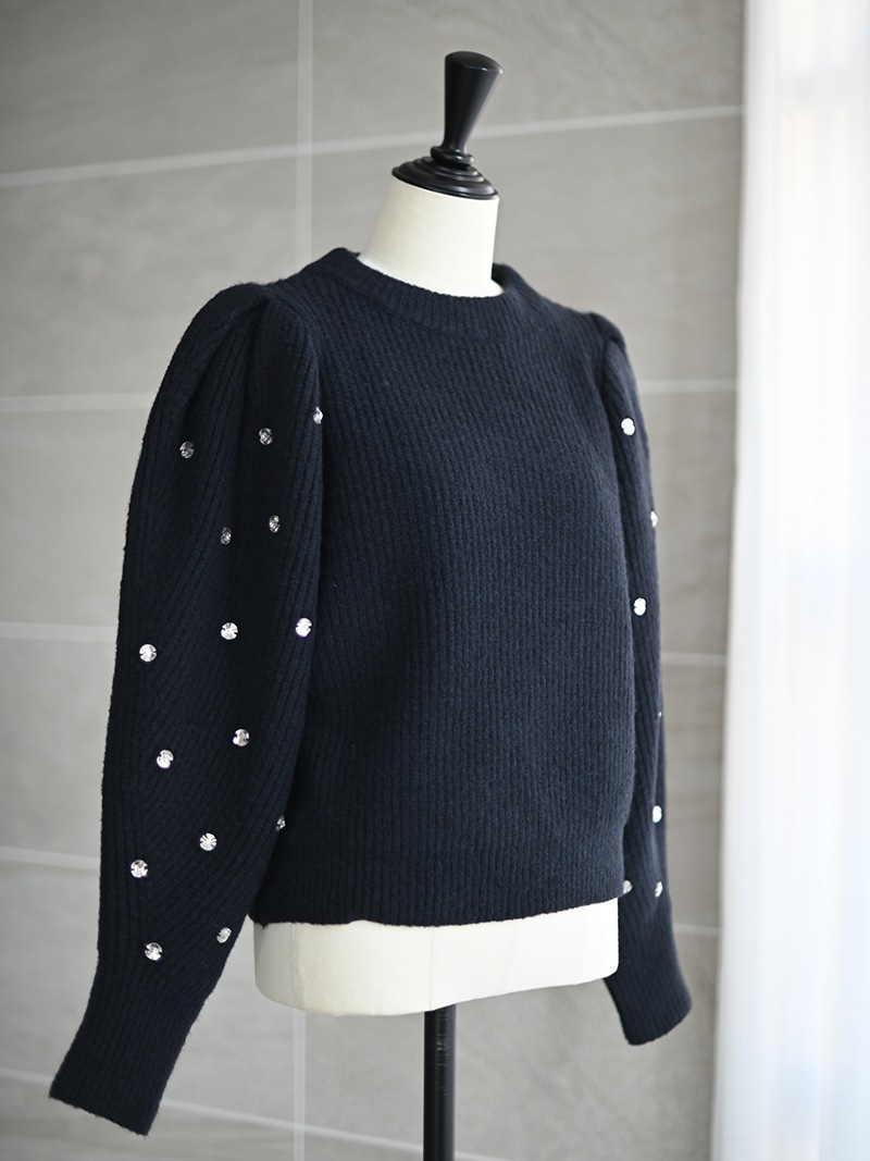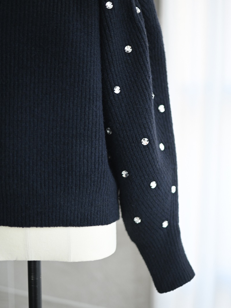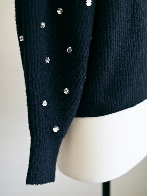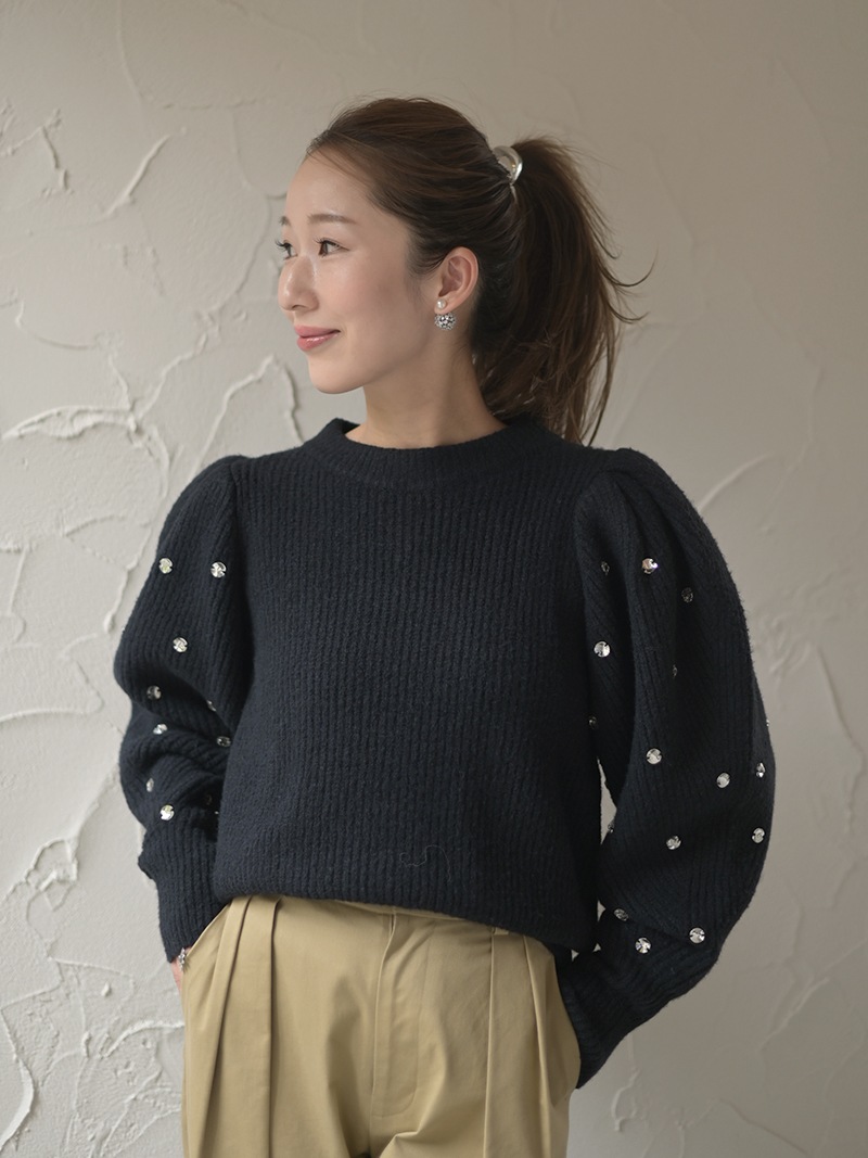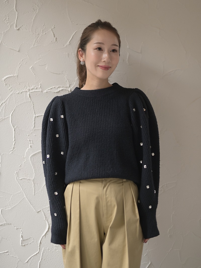 ランダムに配置した袖ビジューがポイント。暖かみのあるウール混率の糸でワイドリブに編み上げカジュアル見えするニットに仕上げました。