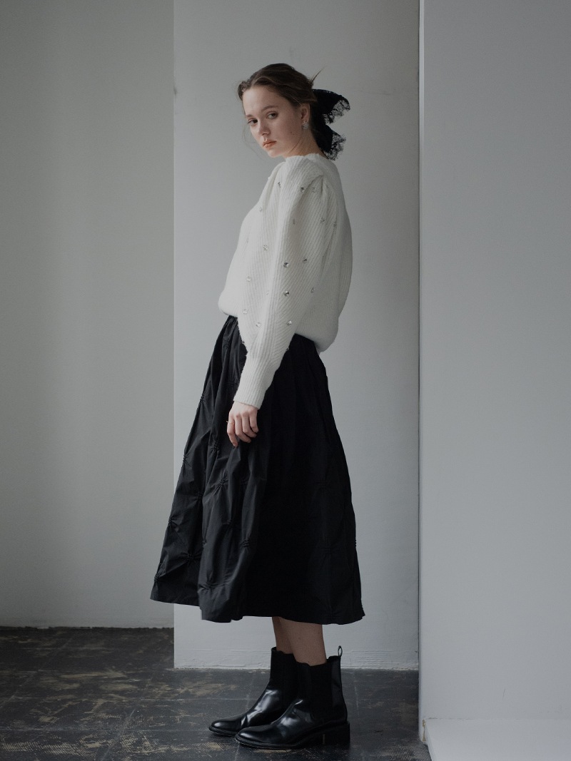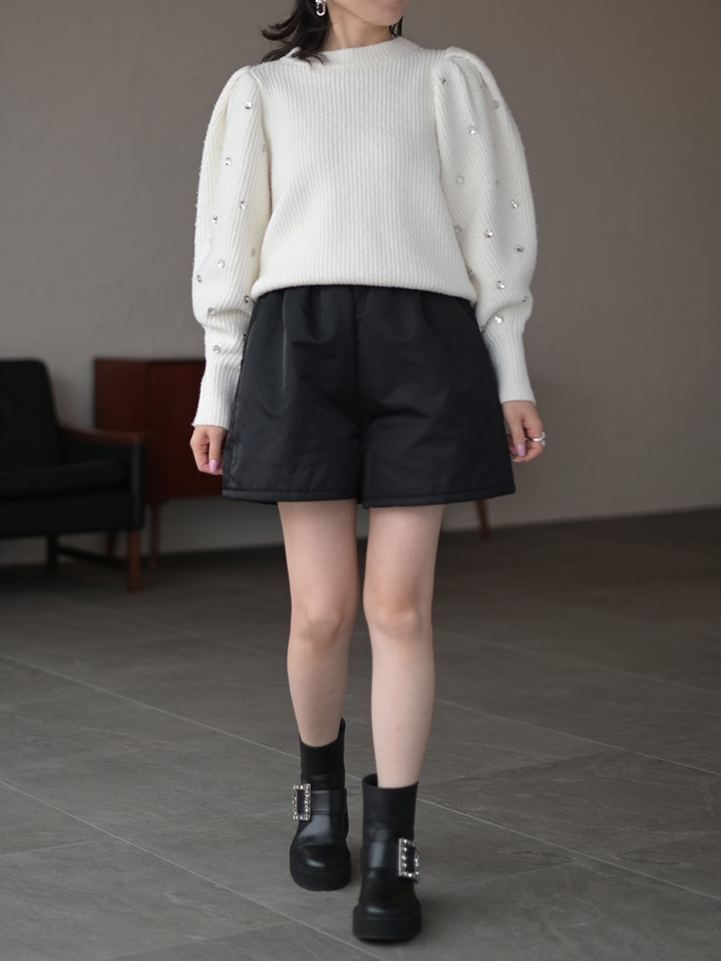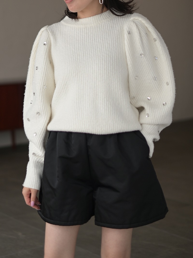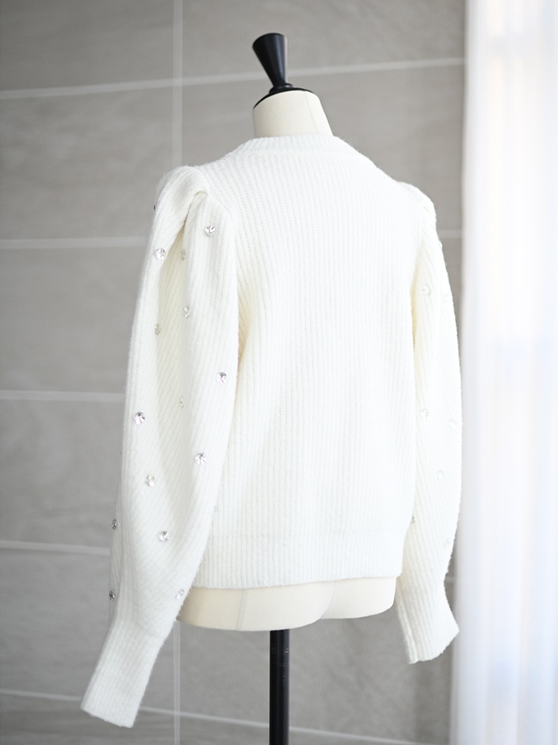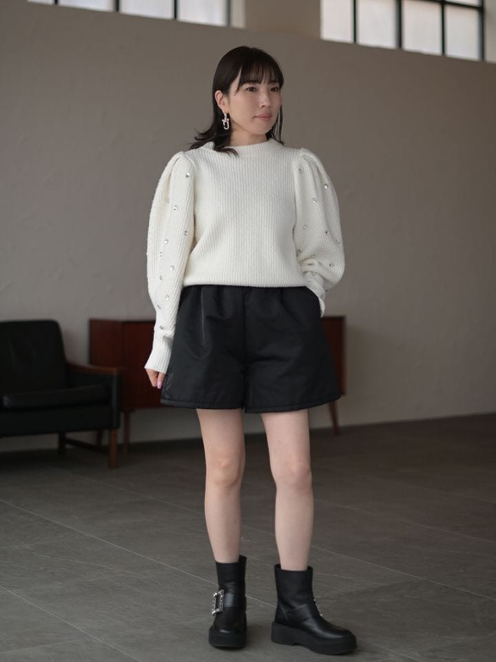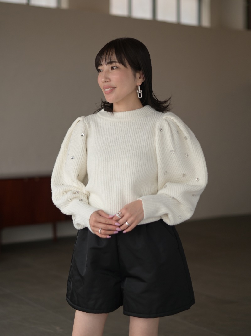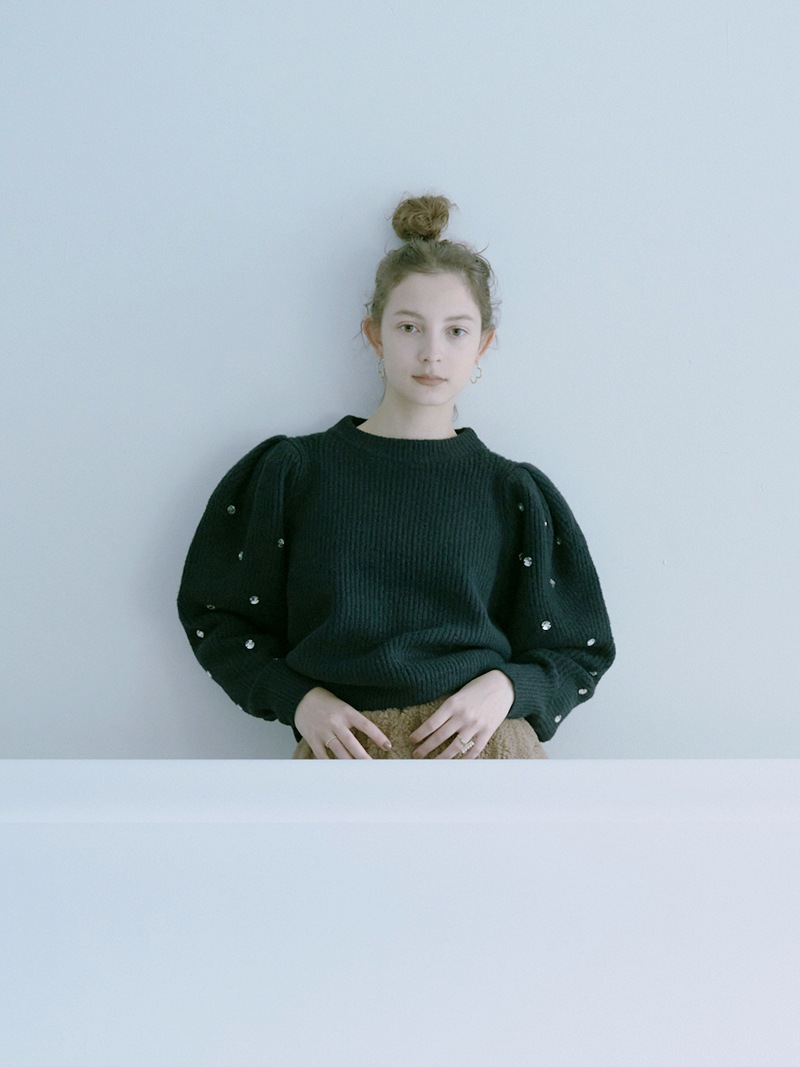 ランダムに配置した袖ビジューがポイント。暖かみのあるウール混率の糸でワイドリブに編み上げカジュアル見えするニットに仕上げました。