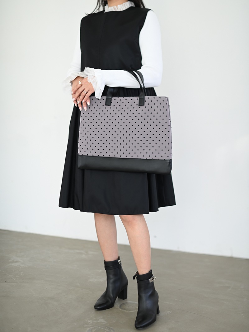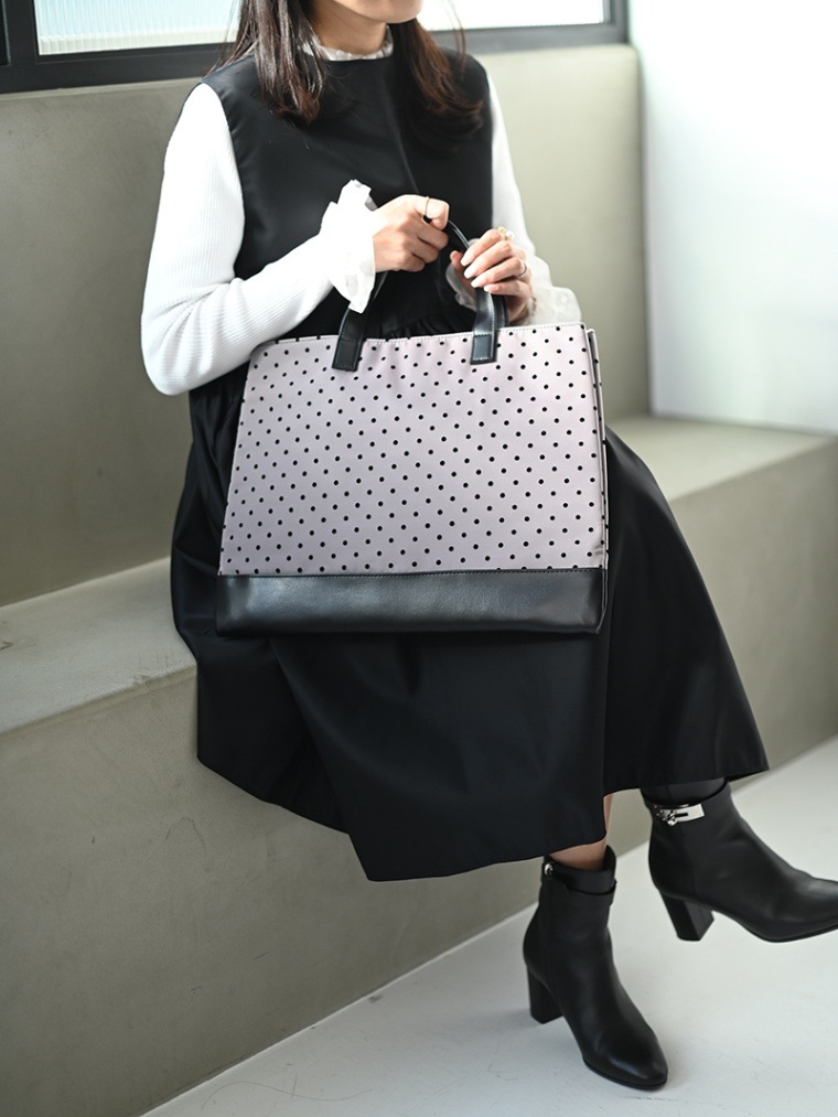 本体部分には芯地を張り合わせ型崩れしにくい仕様に。また持ち手と底部分にはフェイクレザーを使用し汚れも目立ちにくくお手入れのしやすさも。