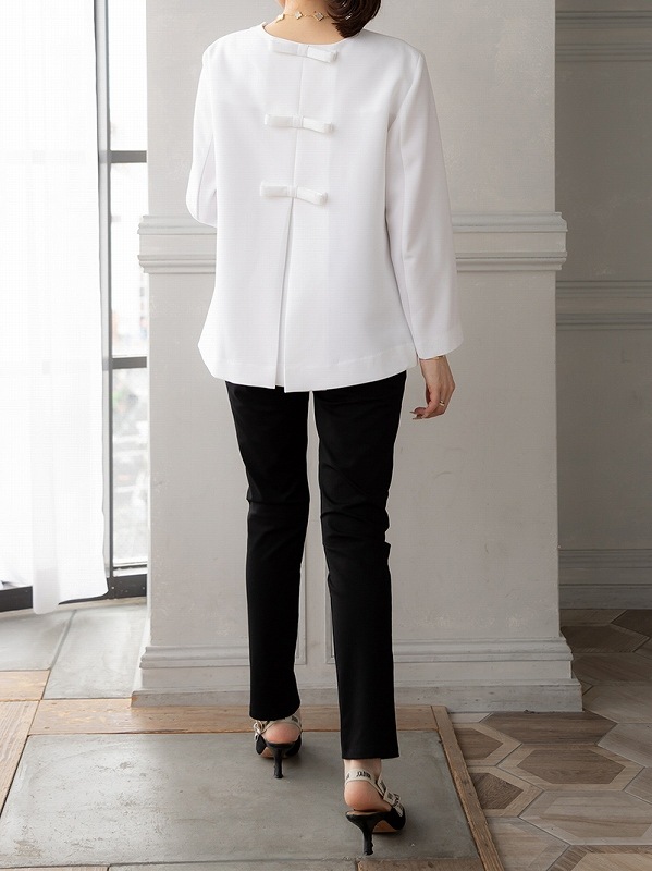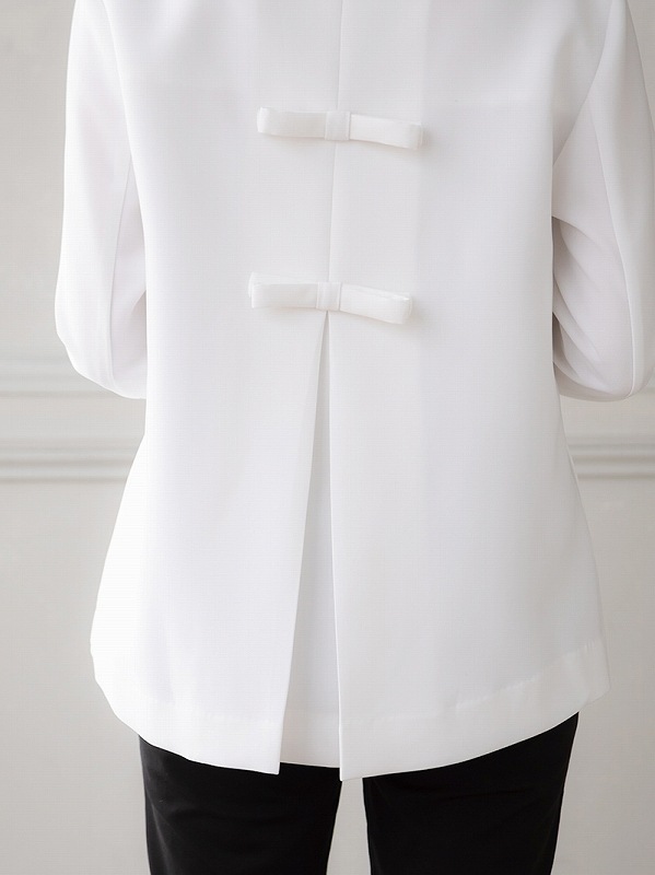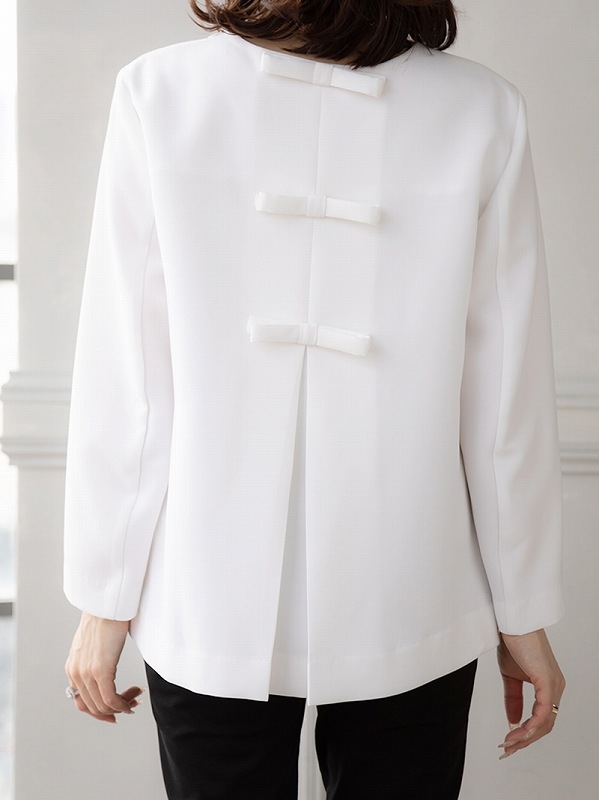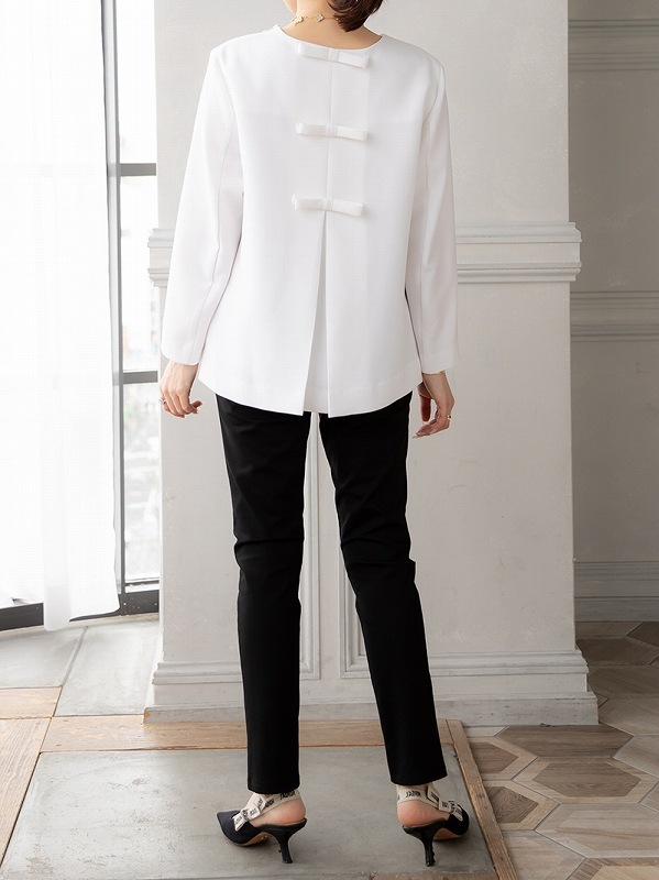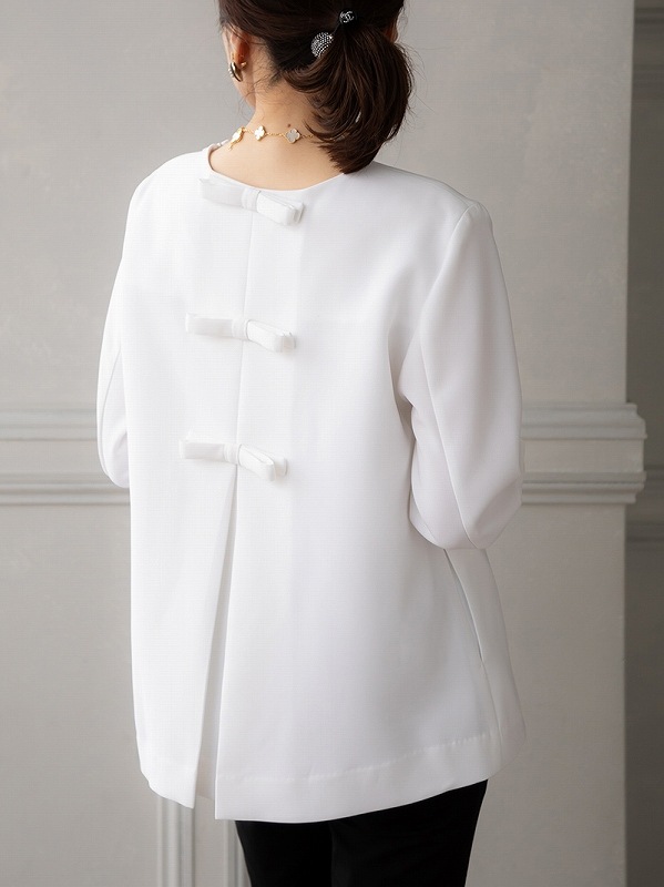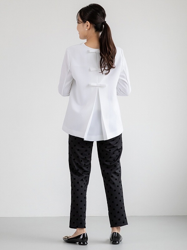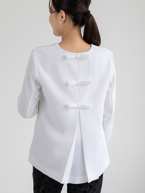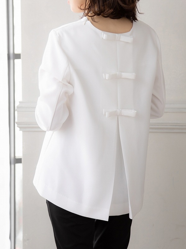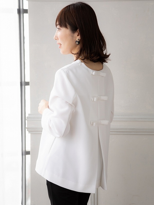 きちんと感のあるすっきりとシルエットに、バックリボンデザインで女性らしく華やかな印象をプラスしました。ダブルクロス生地を使用し着映えする程良い肉感と、軽い着心地が特徴です。