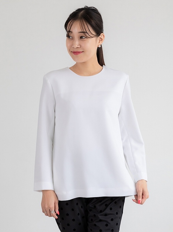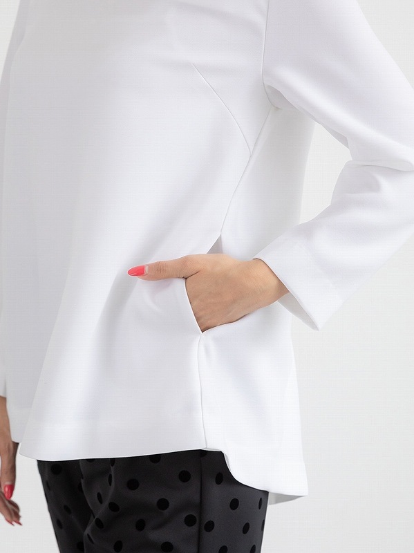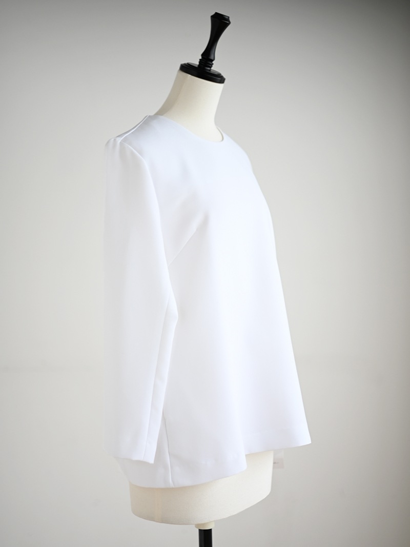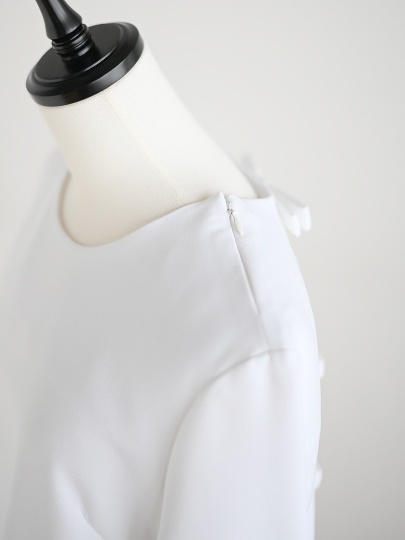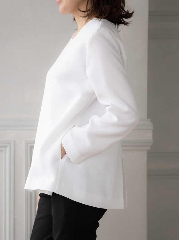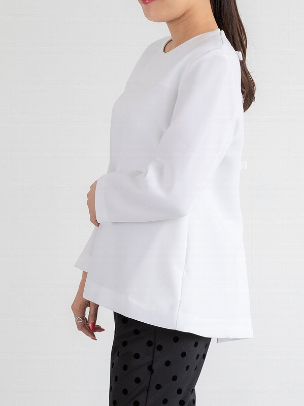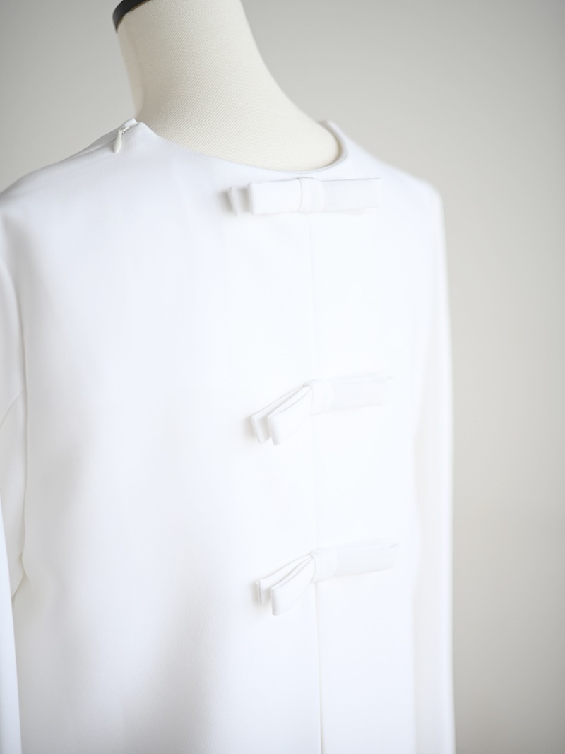 きちんと感のあるすっきりとシルエットに、バックリボンデザインで女性らしく華やかな印象をプラスしました。ダブルクロス生地を使用し着映えする程良い肉感と、軽い着心地が特徴です。