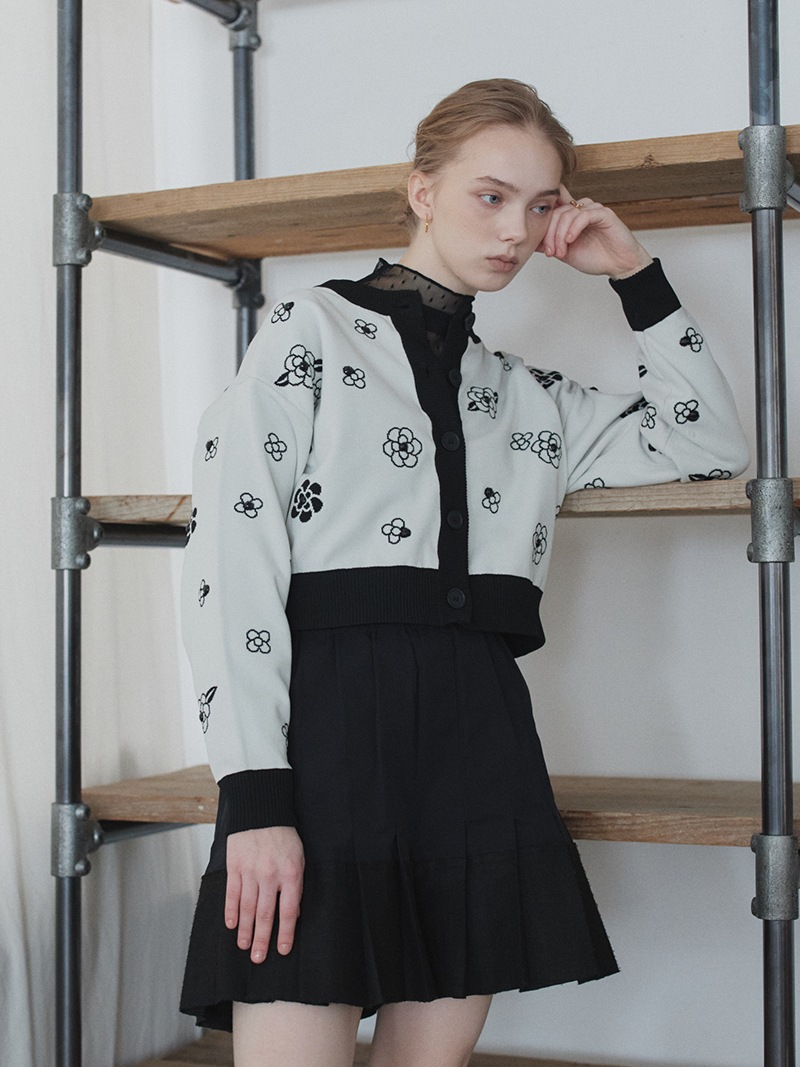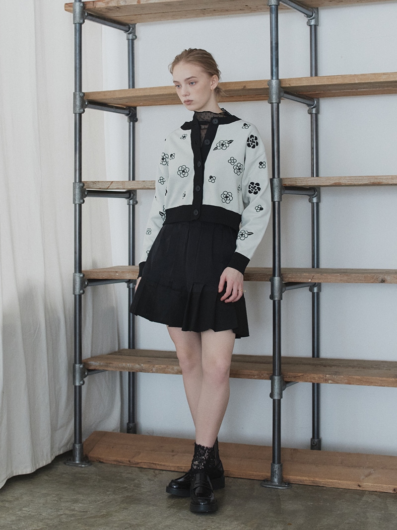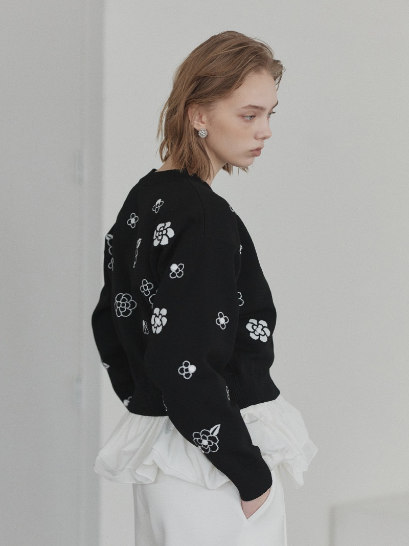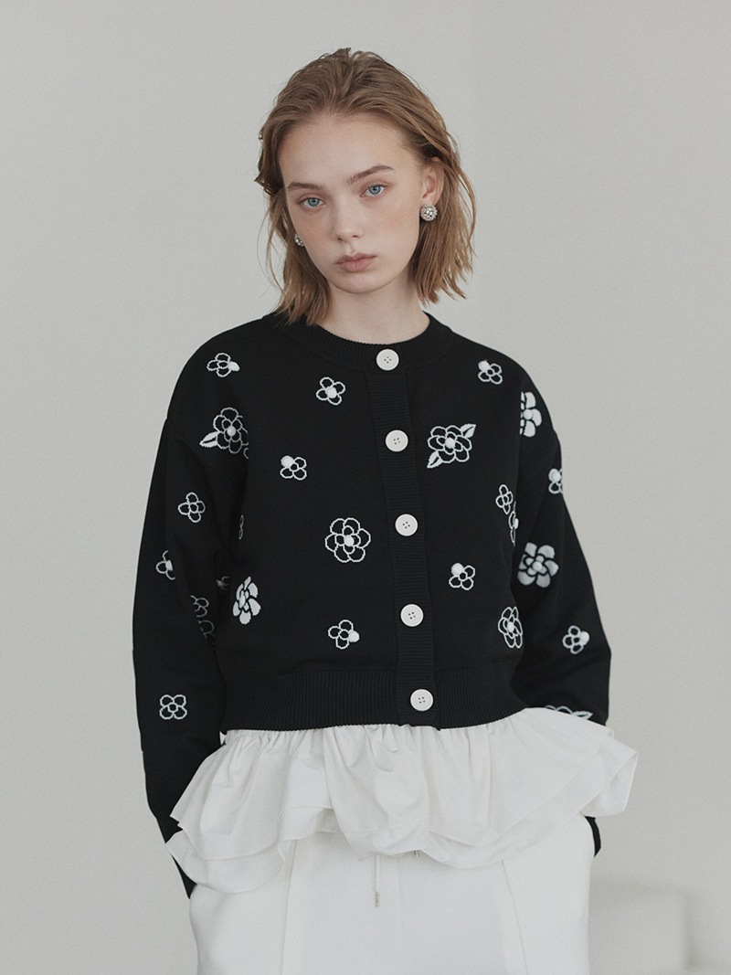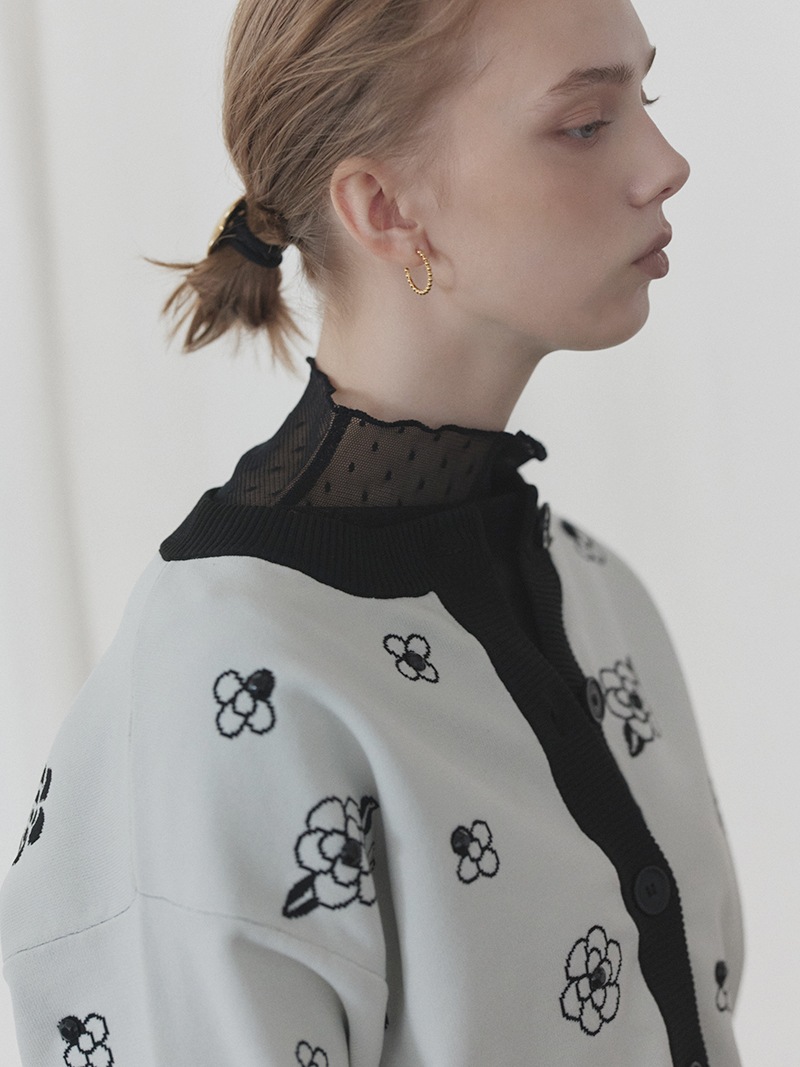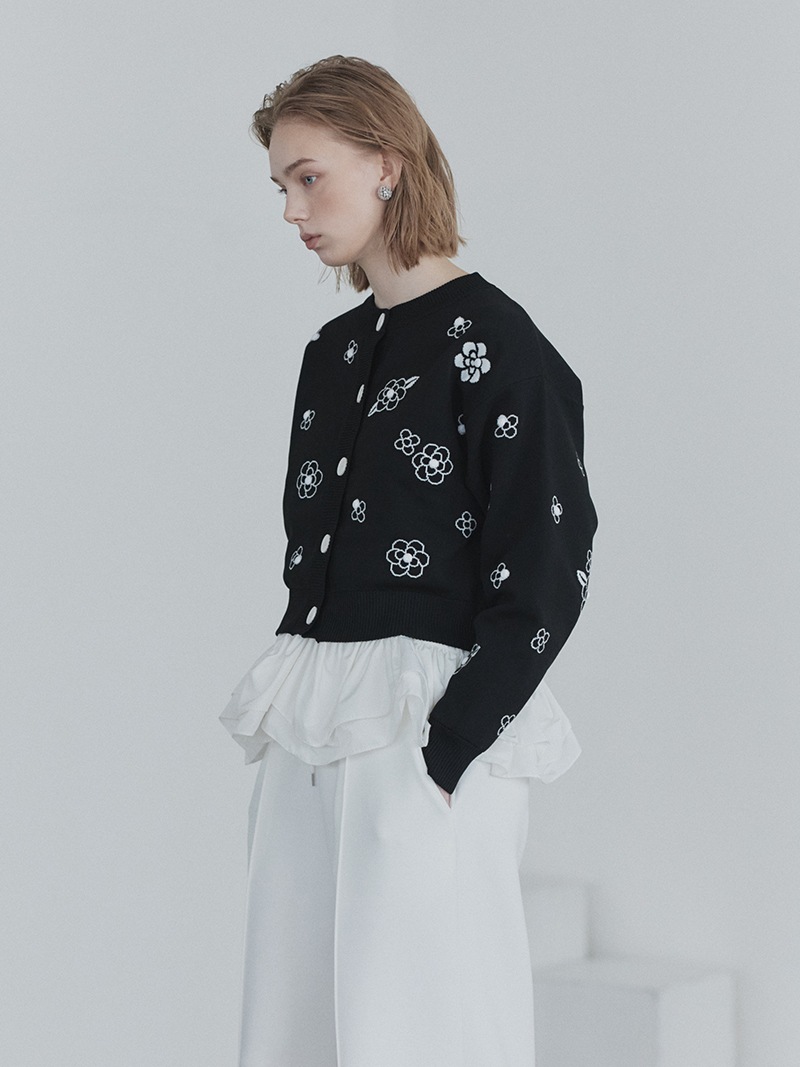 クラシカルな雰囲気漂うフラワーモチーフを散りばめたジャガード編みカーディガン。ランダムに施したビジューで立体感もプラス。