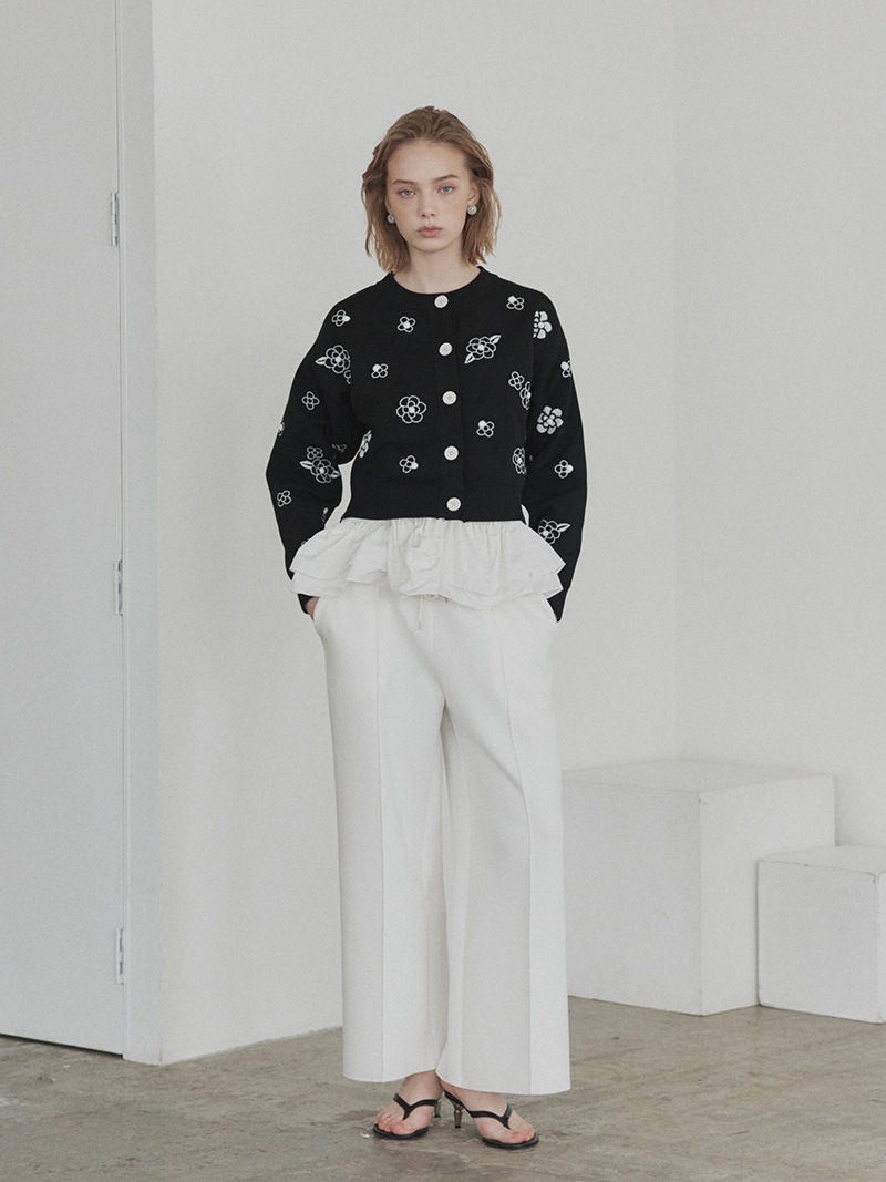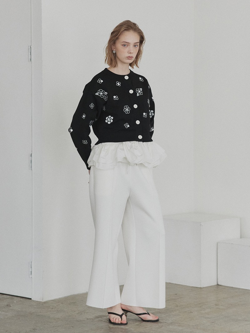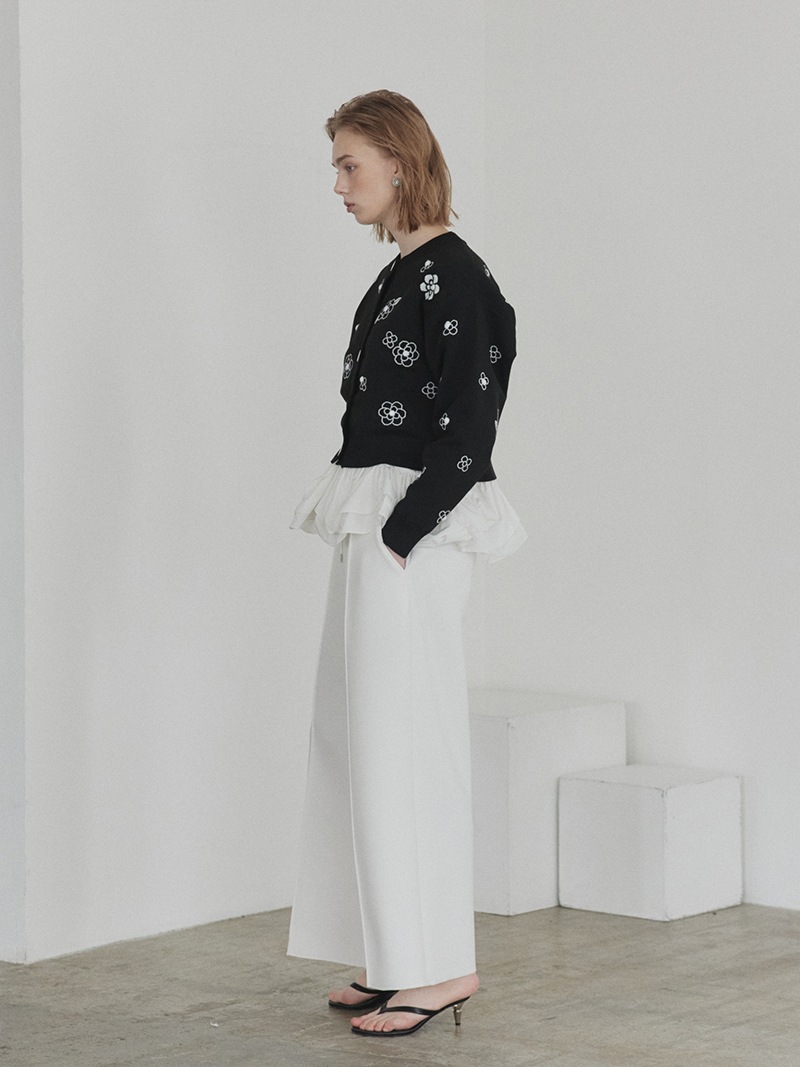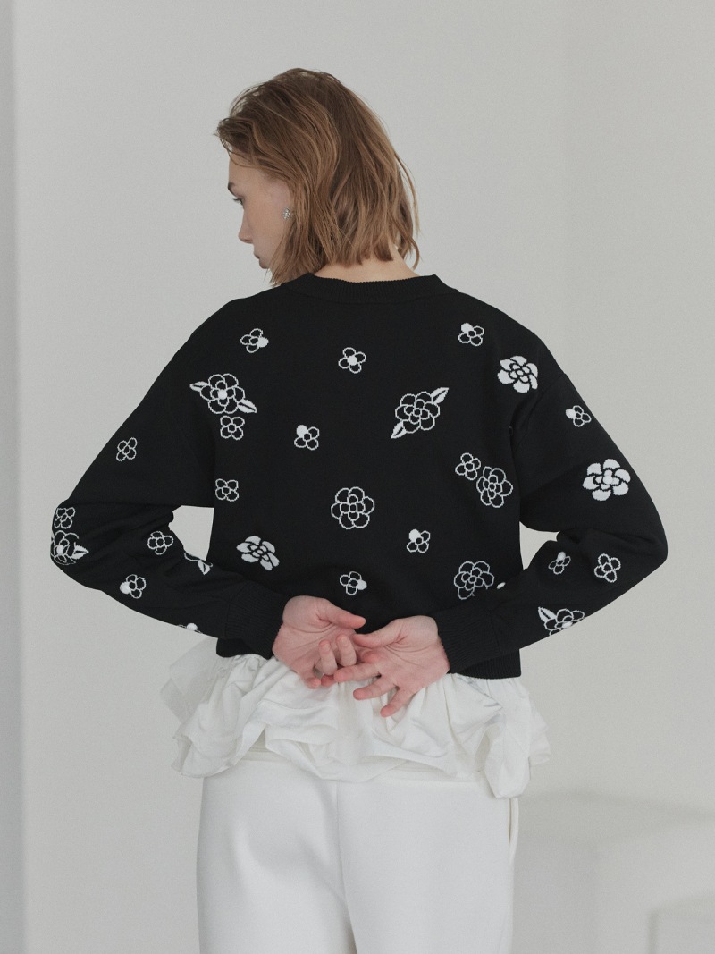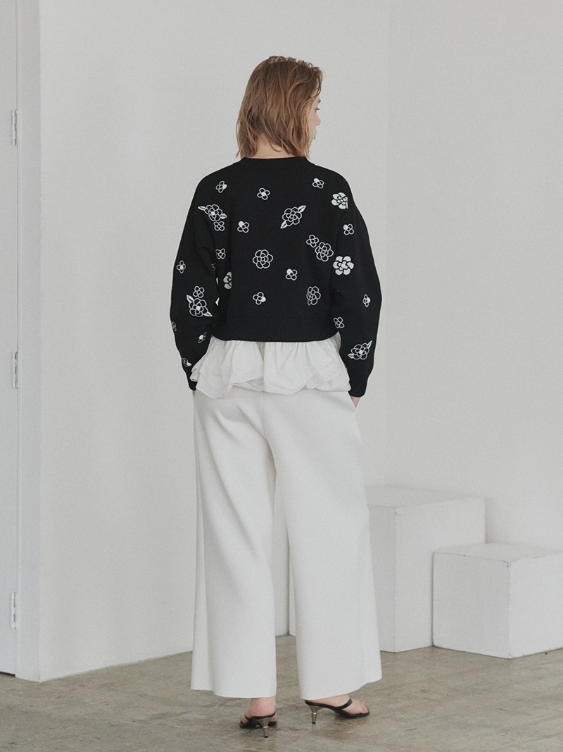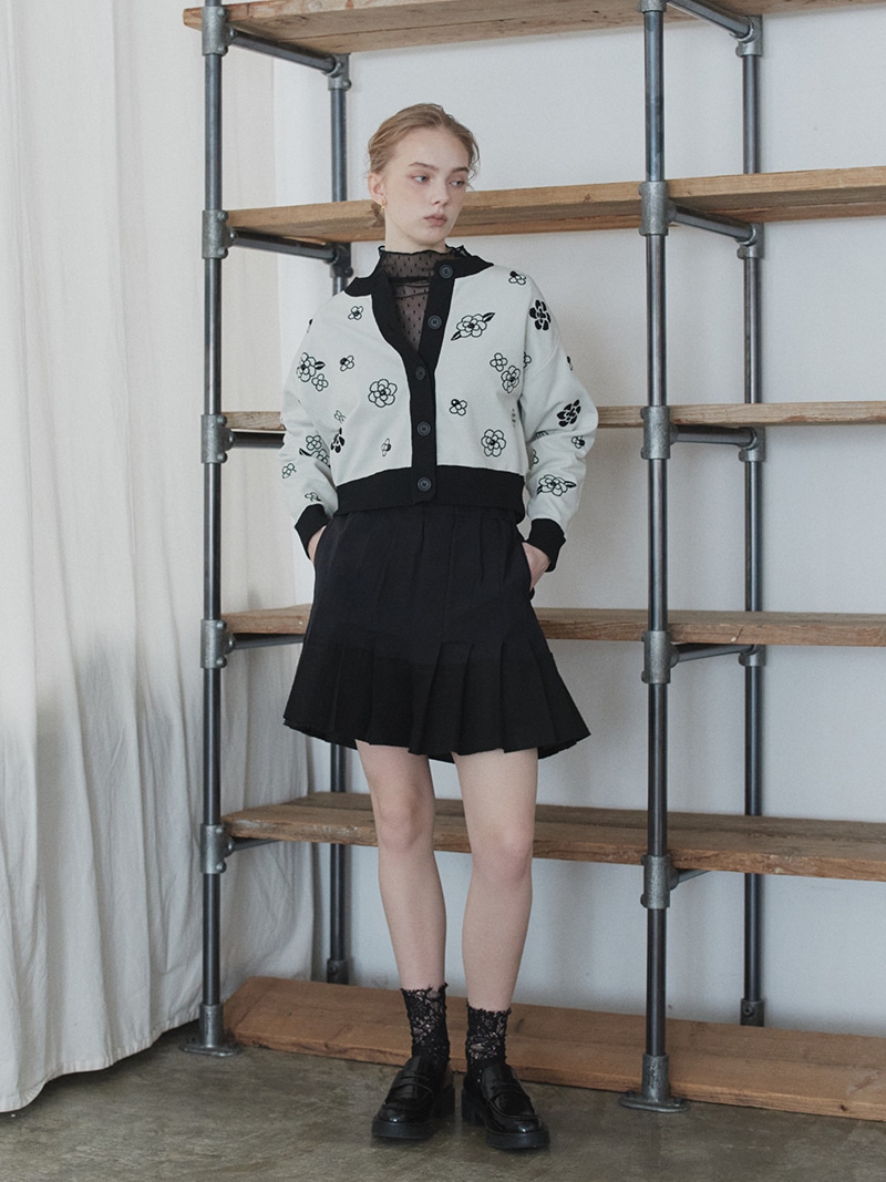 クラシカルな雰囲気漂うフラワーモチーフを散りばめたジャガード編みカーディガン。ランダムに施したビジューで立体感もプラス。