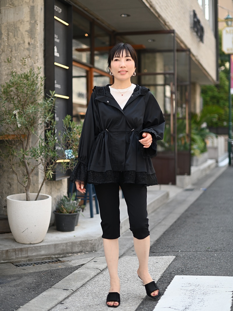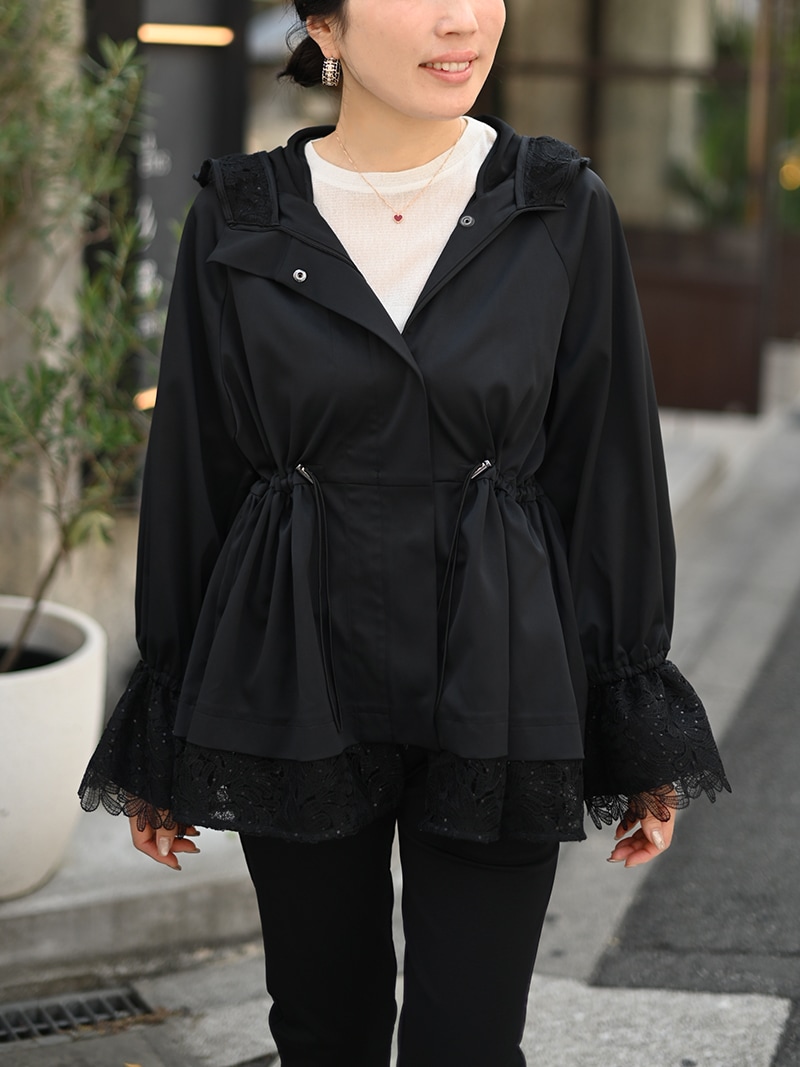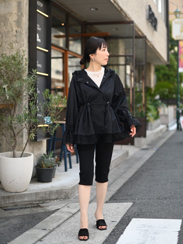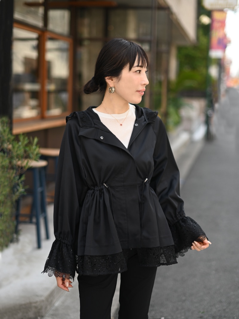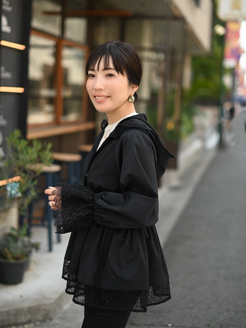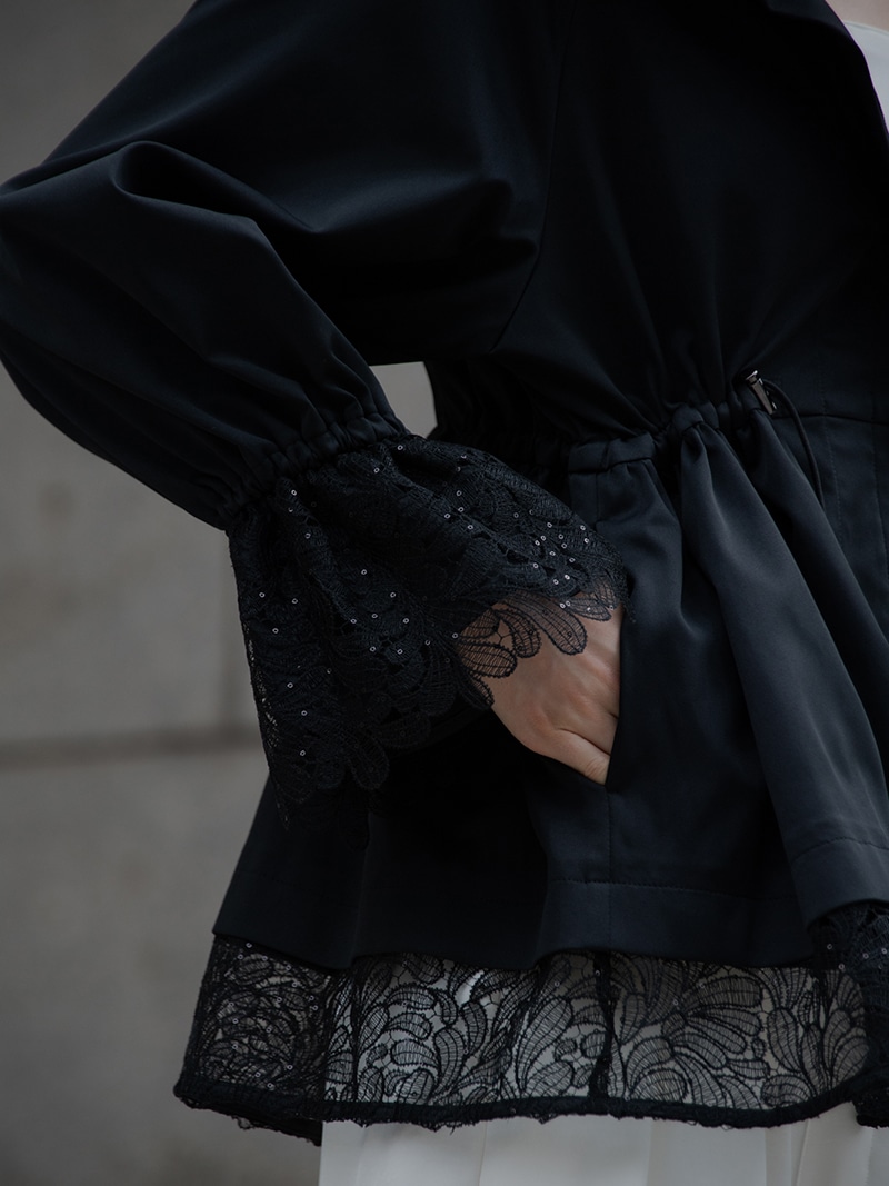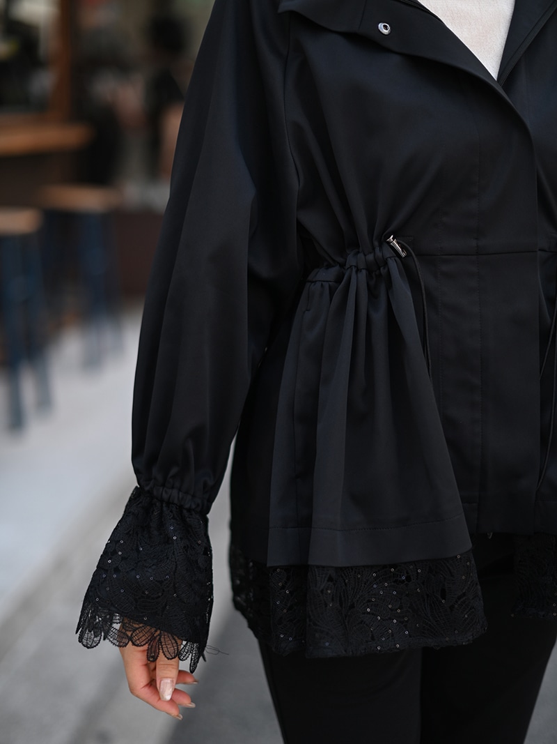 華やかで高級感のあるスパンコールレースは軽やかな透け感と繊細なきらめきをプラスし、カジュアルになりがちなライトアウターもエレガントな雰囲気に。