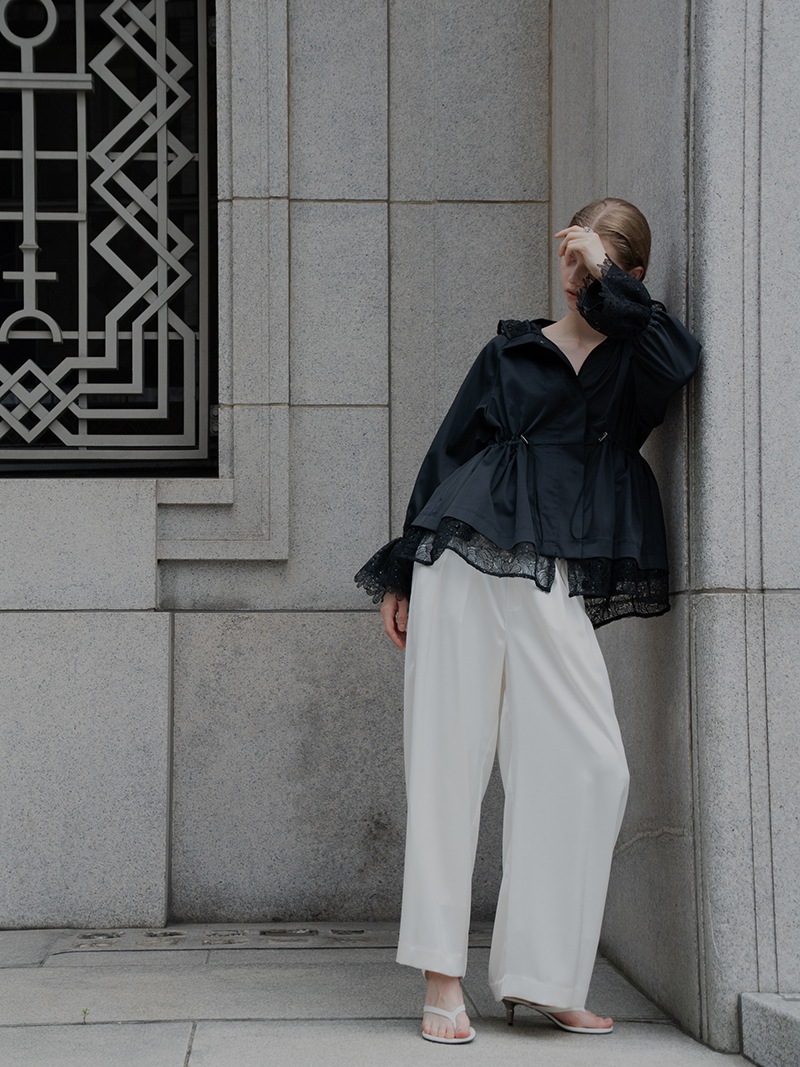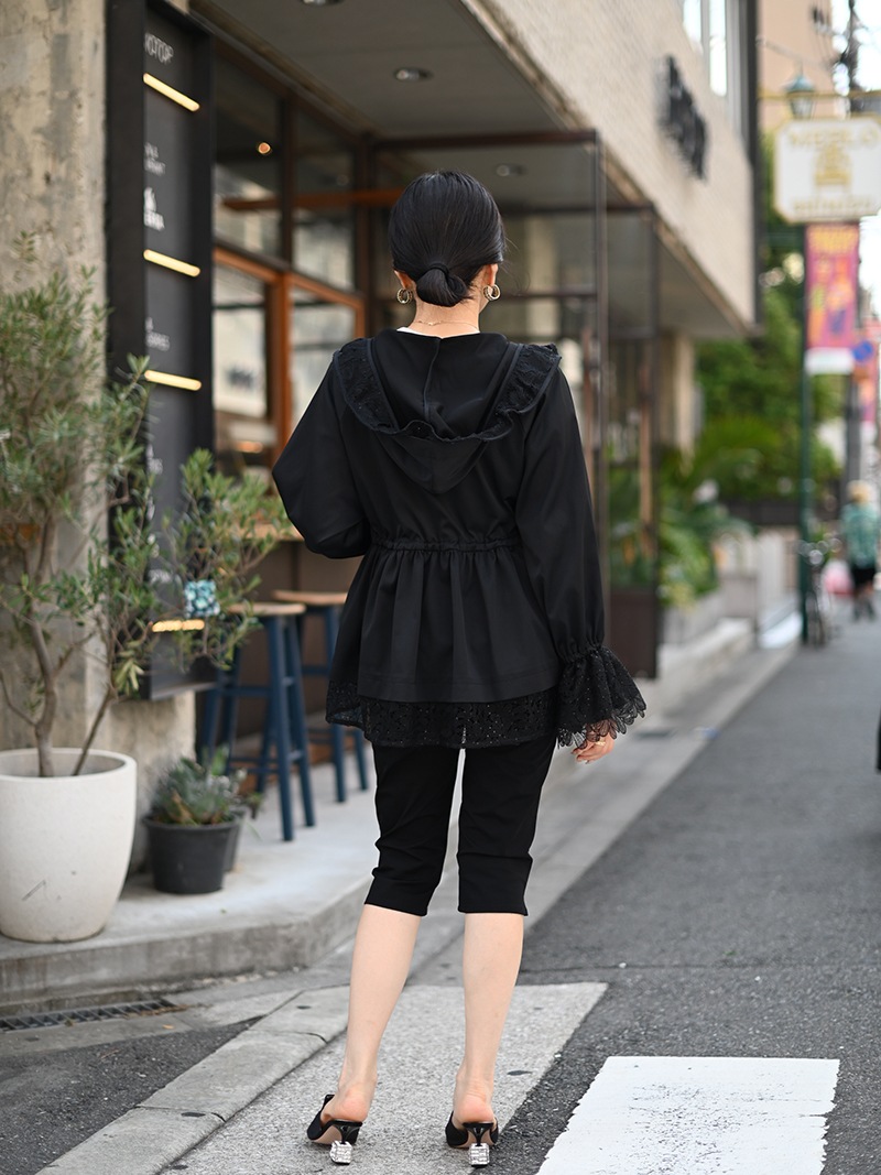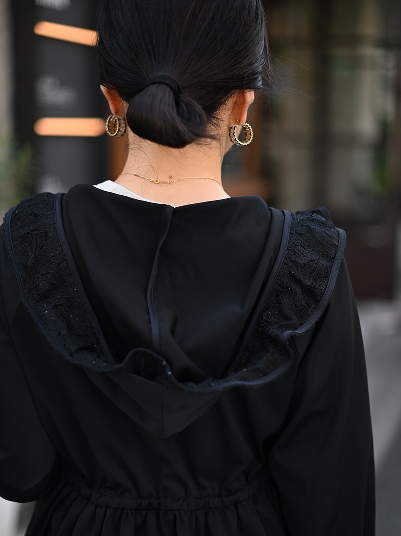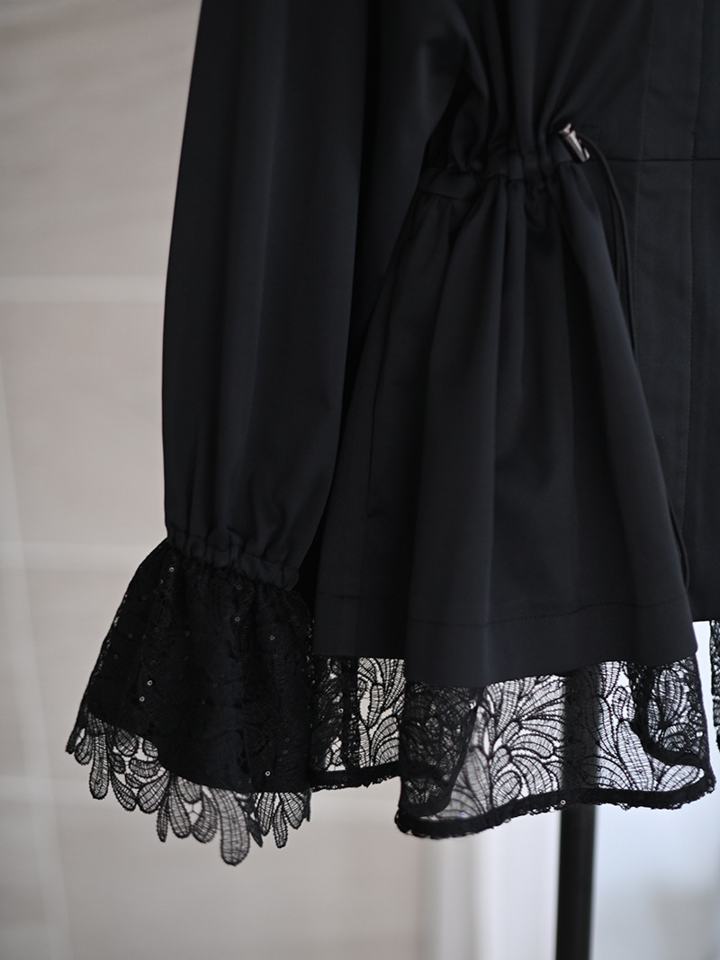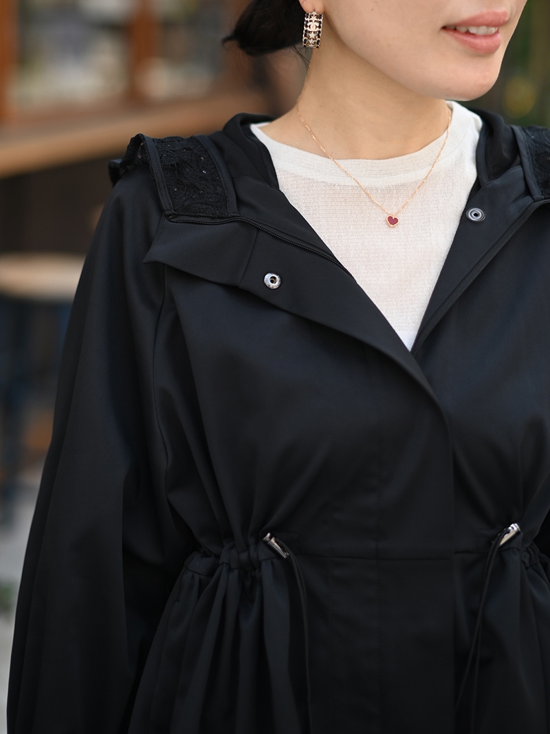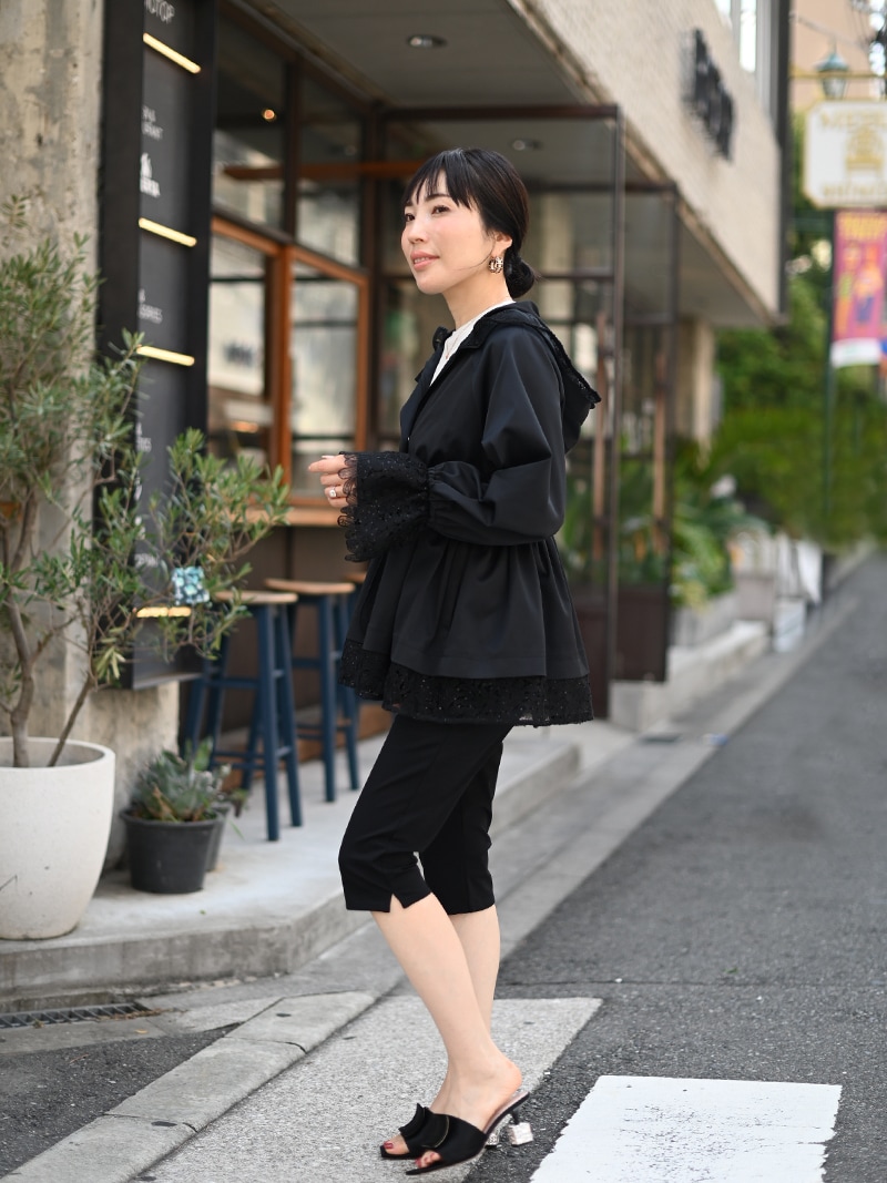 華やかで高級感のあるスパンコールレースは軽やかな透け感と繊細なきらめきをプラスし、カジュアルになりがちなライトアウターもエレガントな雰囲気に。