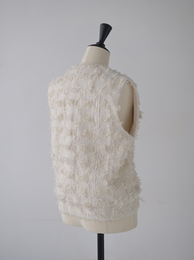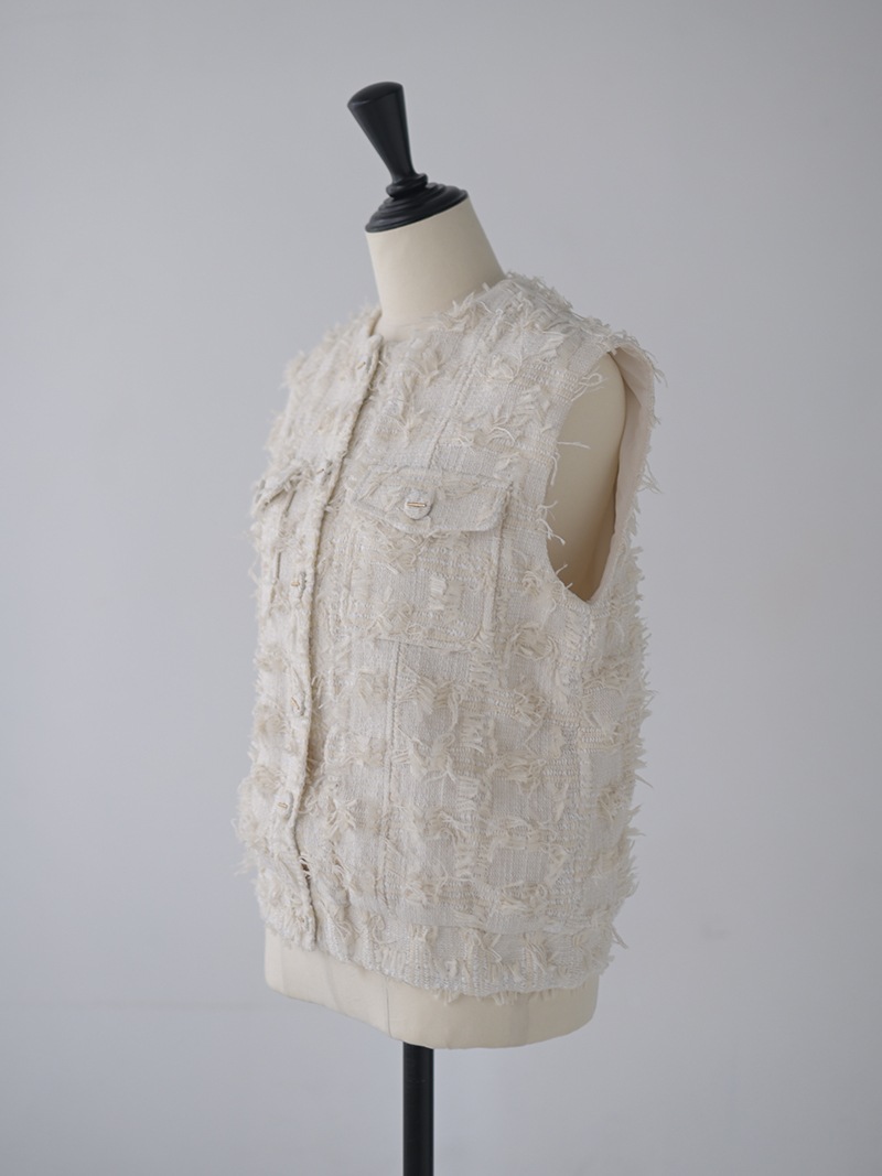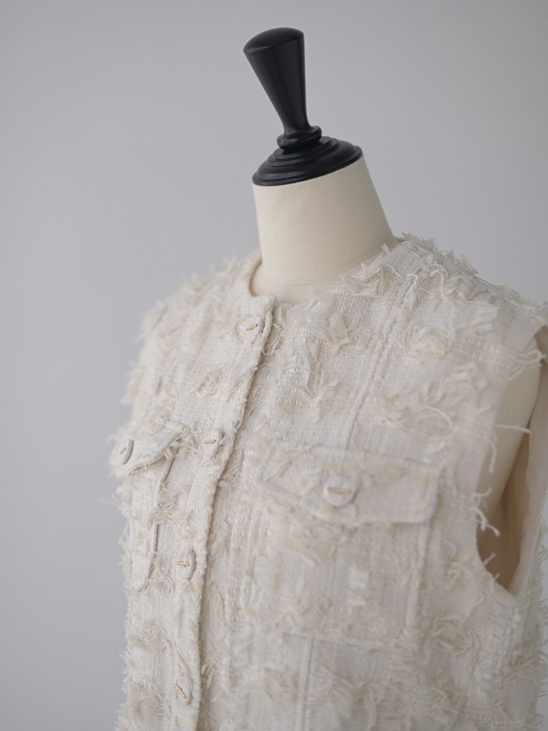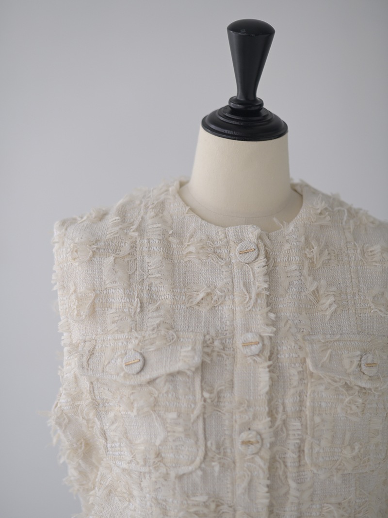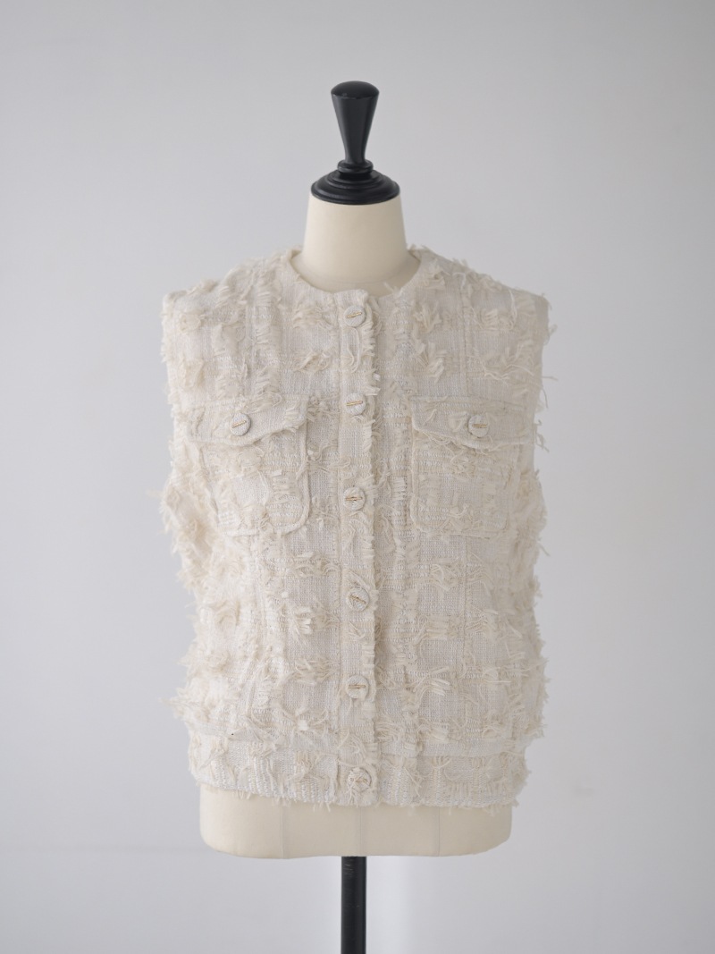 一点投入するだけで春のムードを高めてくれるツイードベスト。リボンヤーンをふんだんに織り込んだ、華やかな表情のツイードを使用。