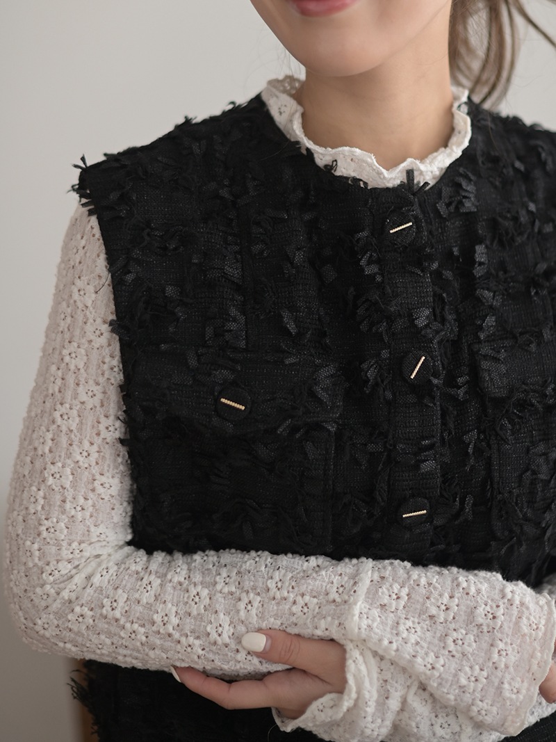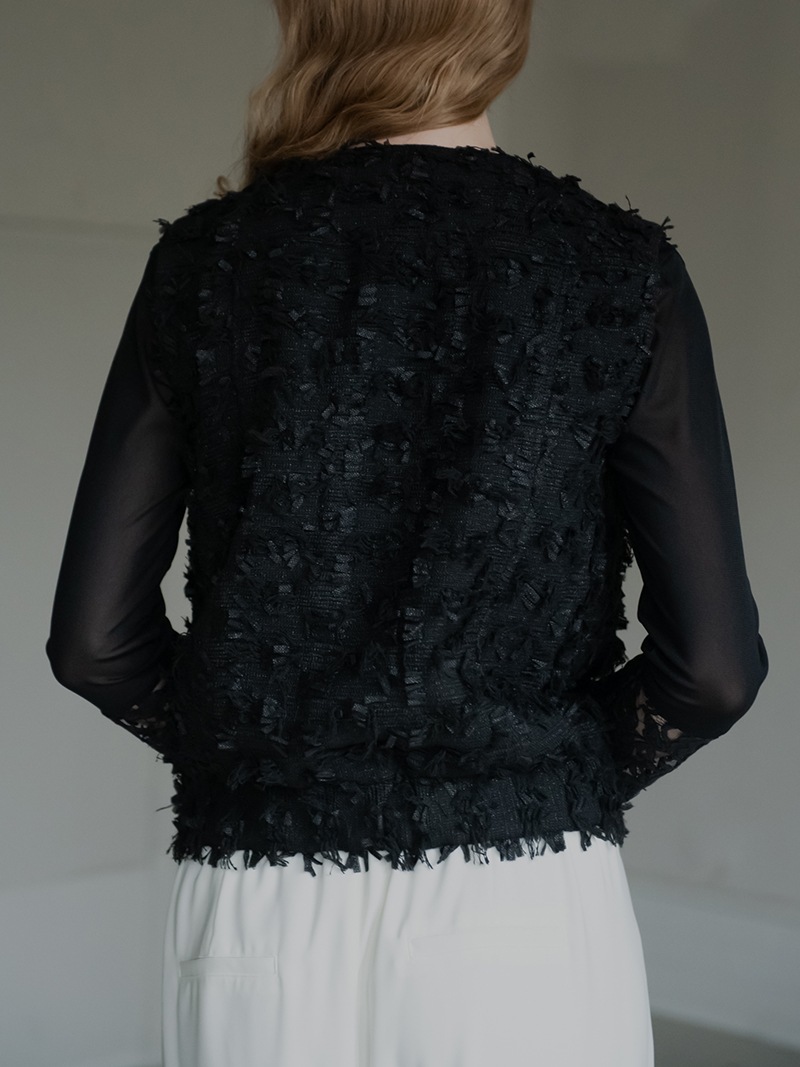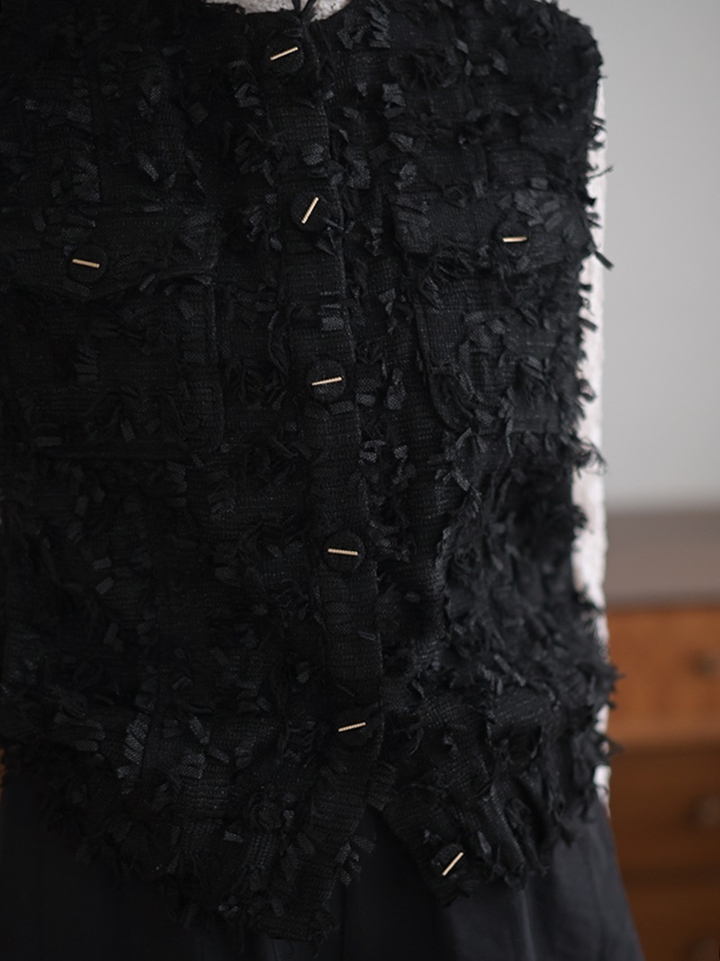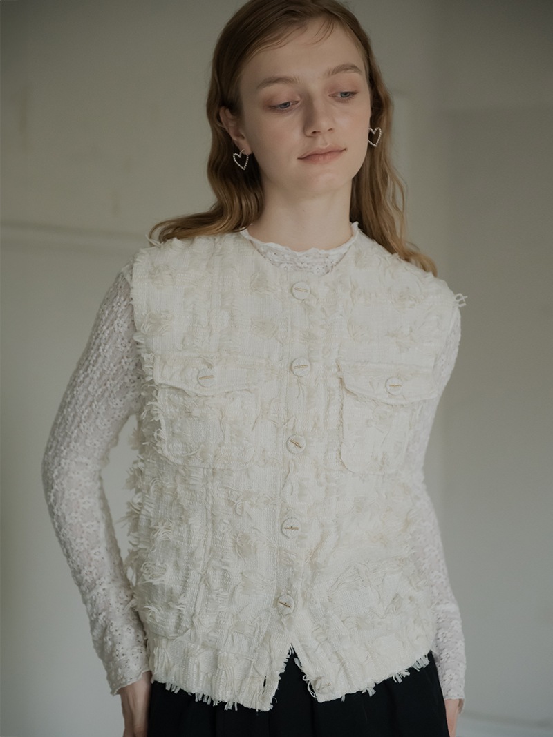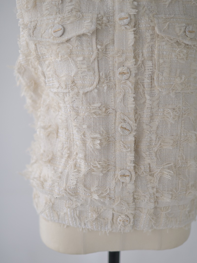 一点投入するだけで春のムードを高めてくれるツイードベスト。リボンヤーンをふんだんに織り込んだ、華やかな表情のツイードを使用。