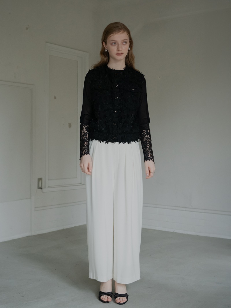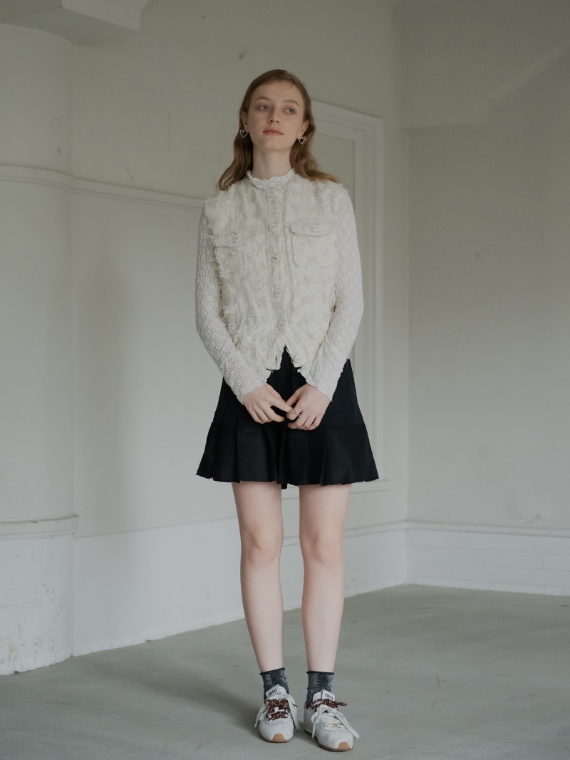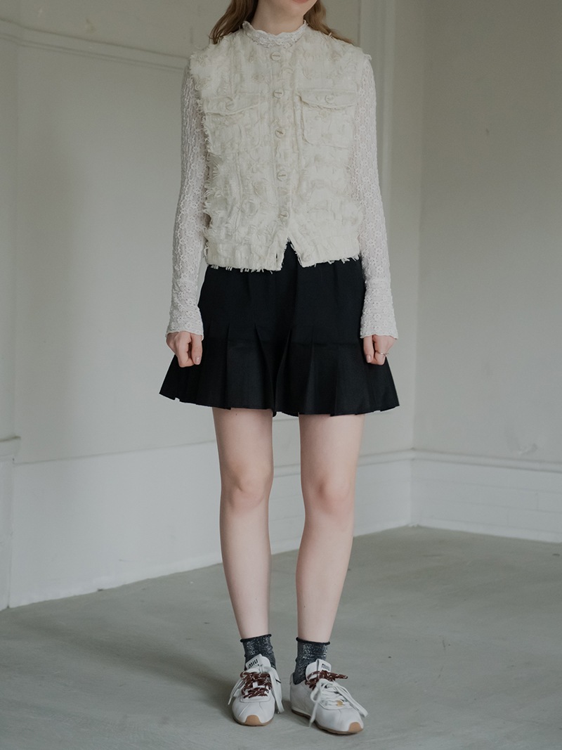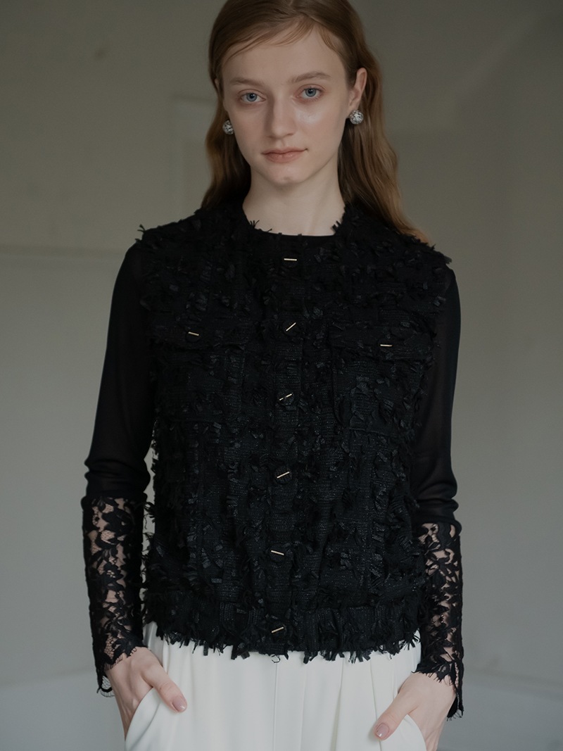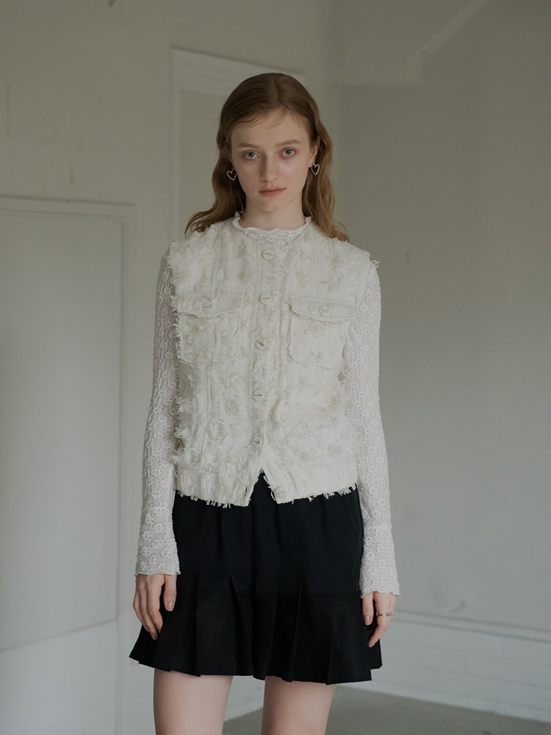 一点投入するだけで春のムードを高めてくれるツイードベスト。リボンヤーンをふんだんに織り込んだ、華やかな表情のツイードを使用。