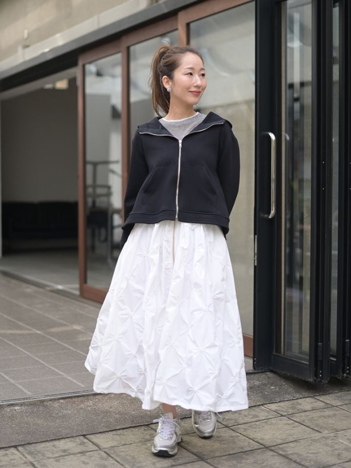 カジュアルになりがちなパーカーに動きのあるバックフレアデザインと裾パイピングを効かせフェミニンさをプラス。
