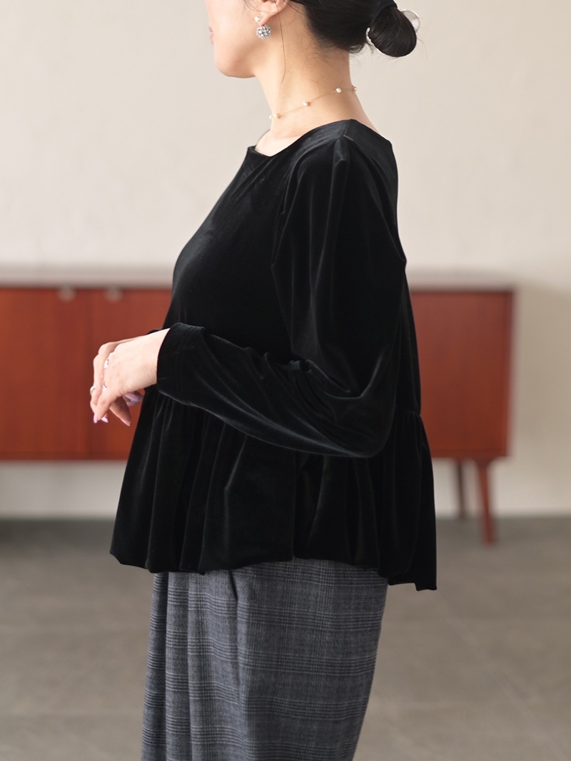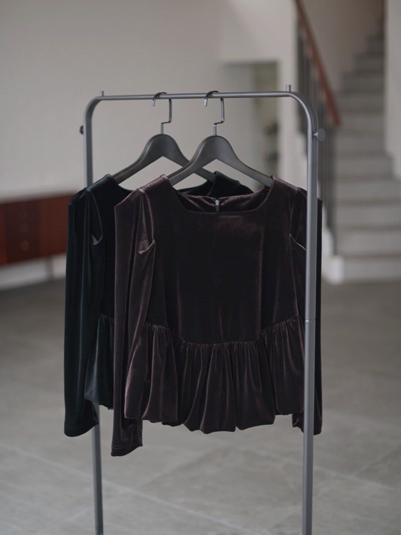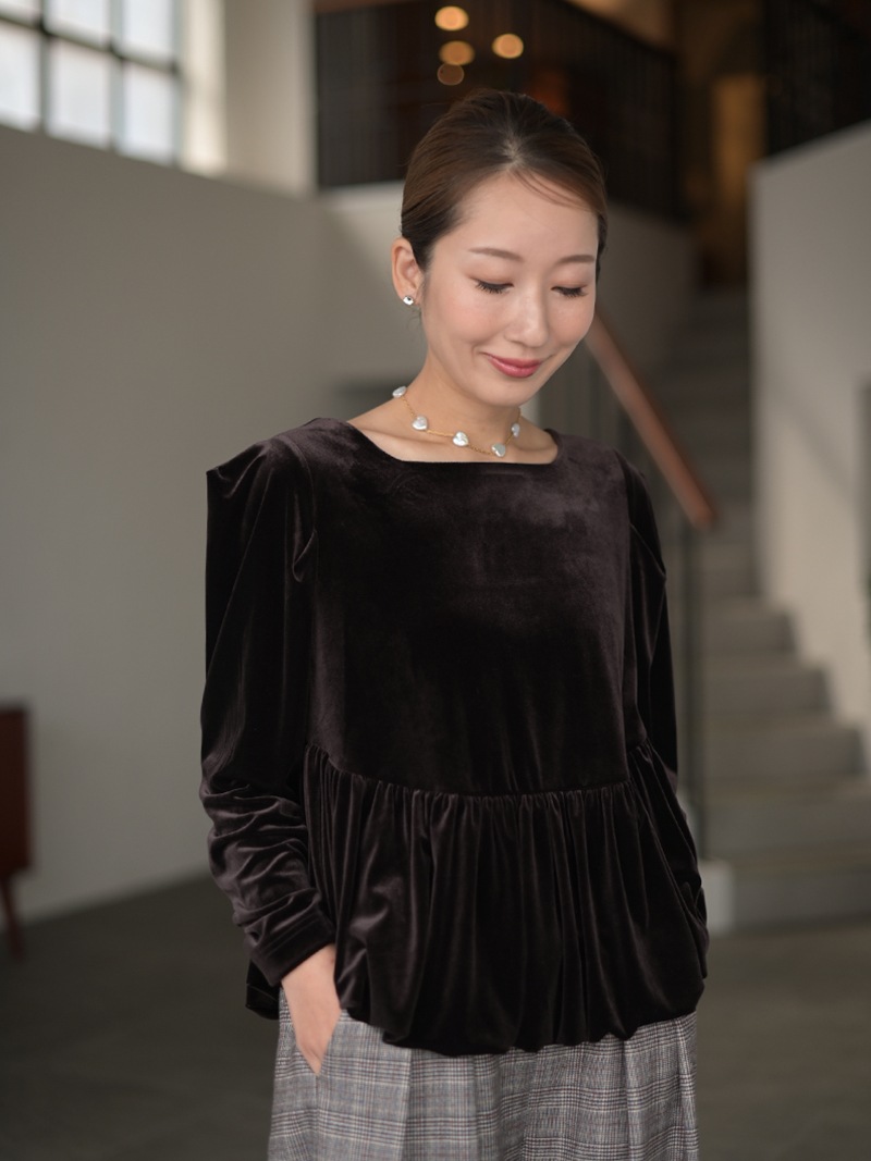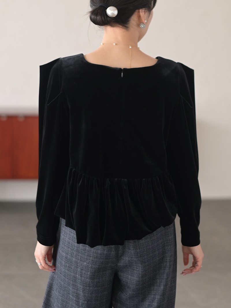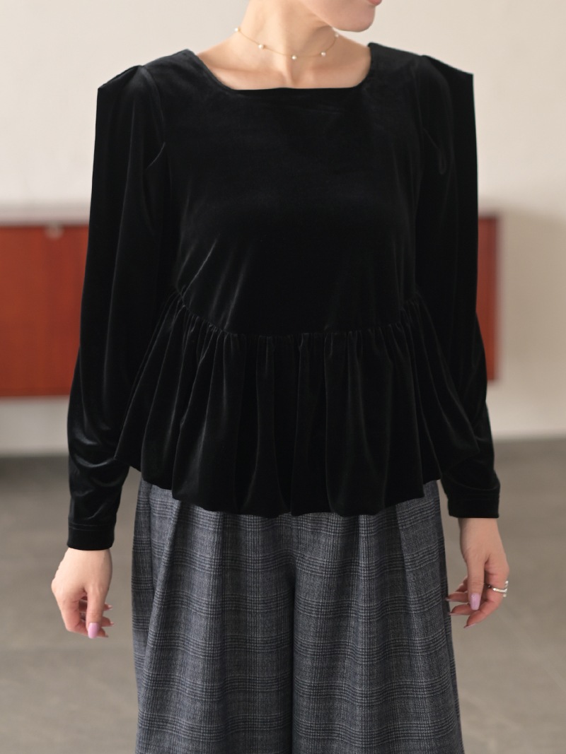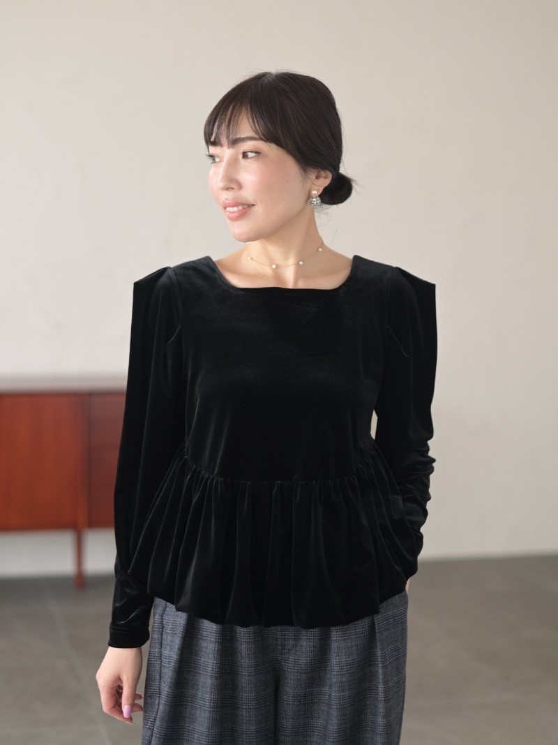 しなやかな風合いと上品な艶が魅力のベロア素材を使用したトップス。落ち感のある肌触りのよいベロアは構築感のある肩タックと、女性らしいラインを引き立てるペプラムシルエットでエレガントな印象に。