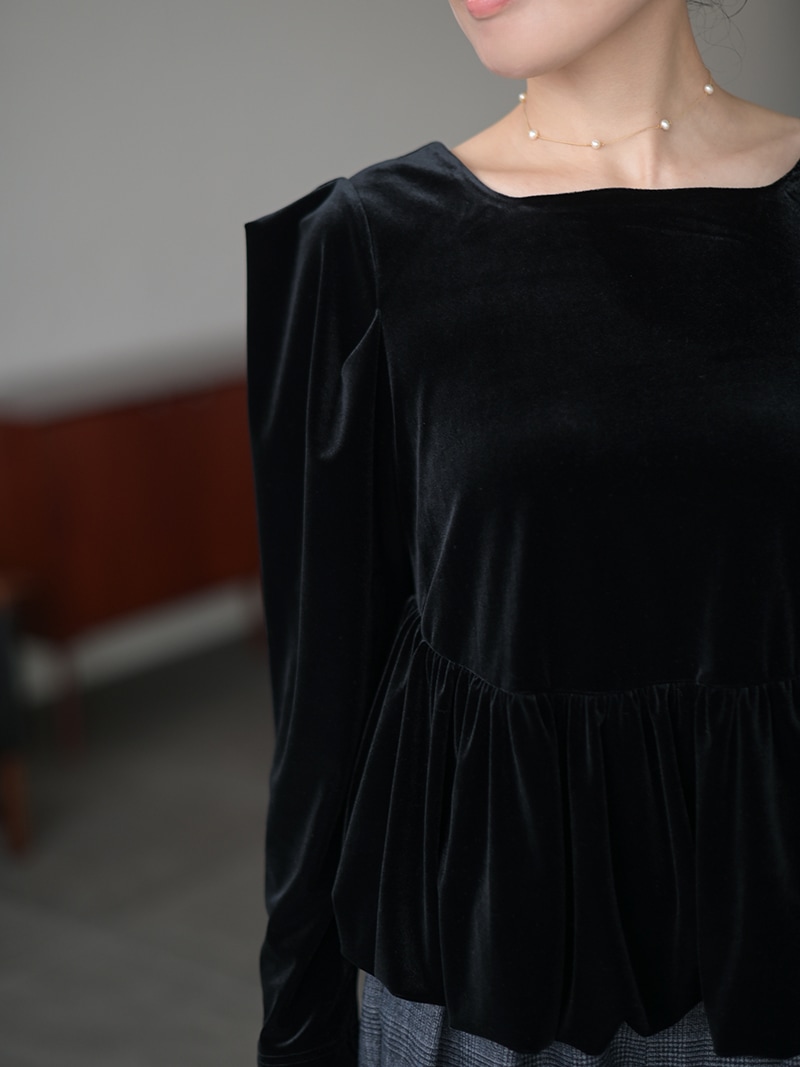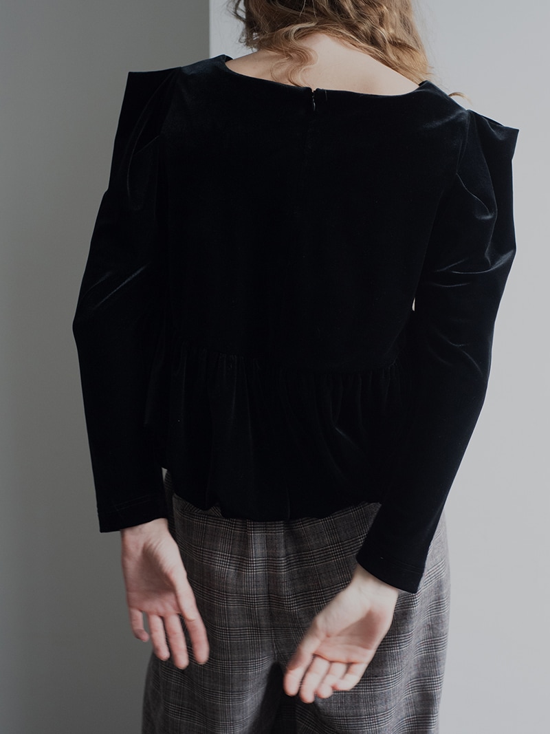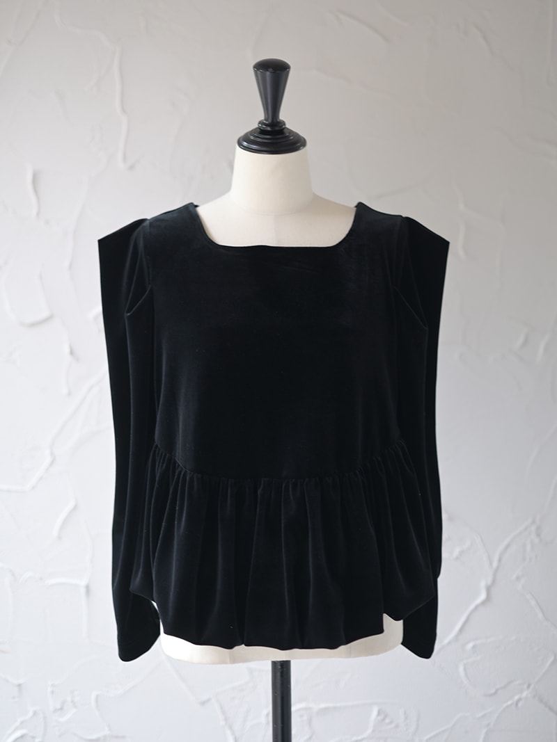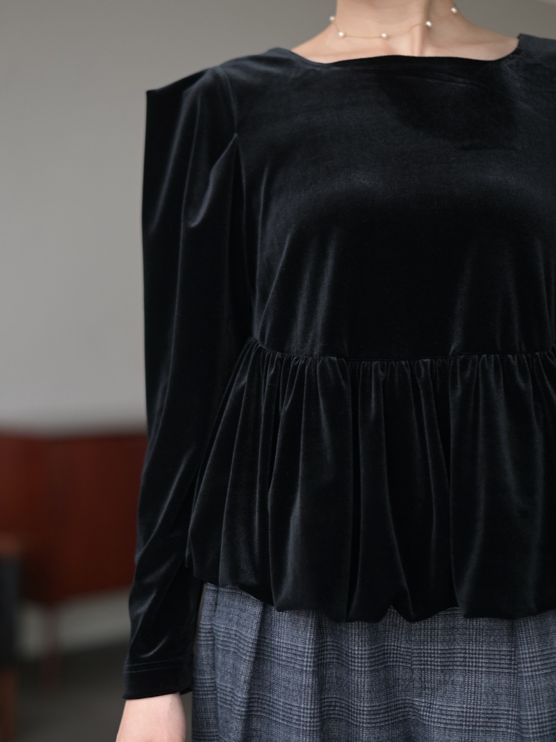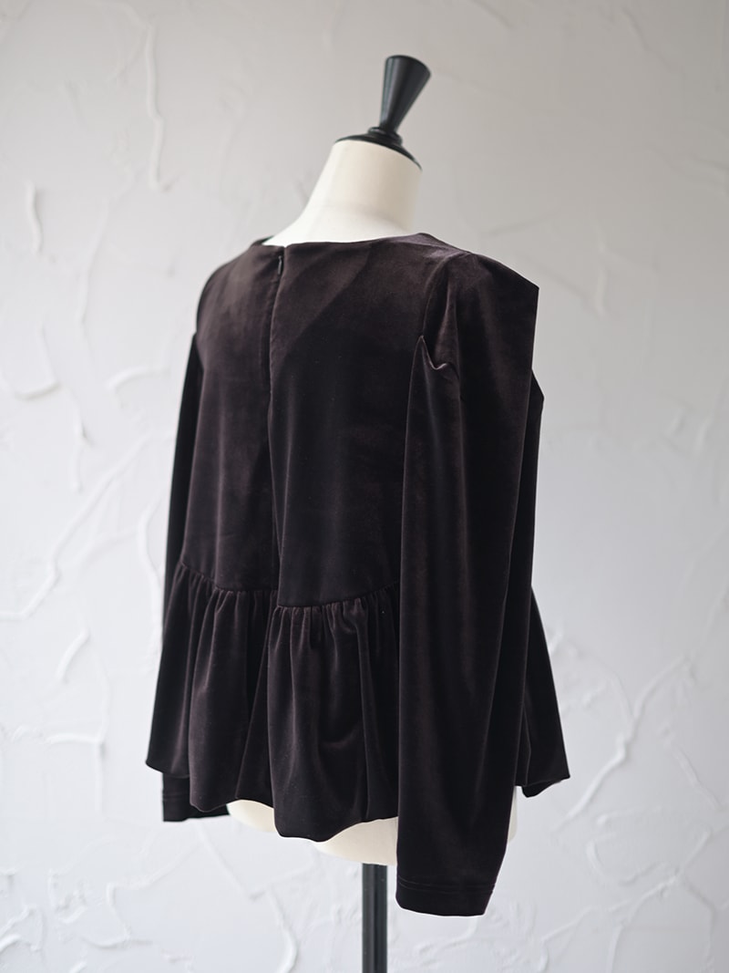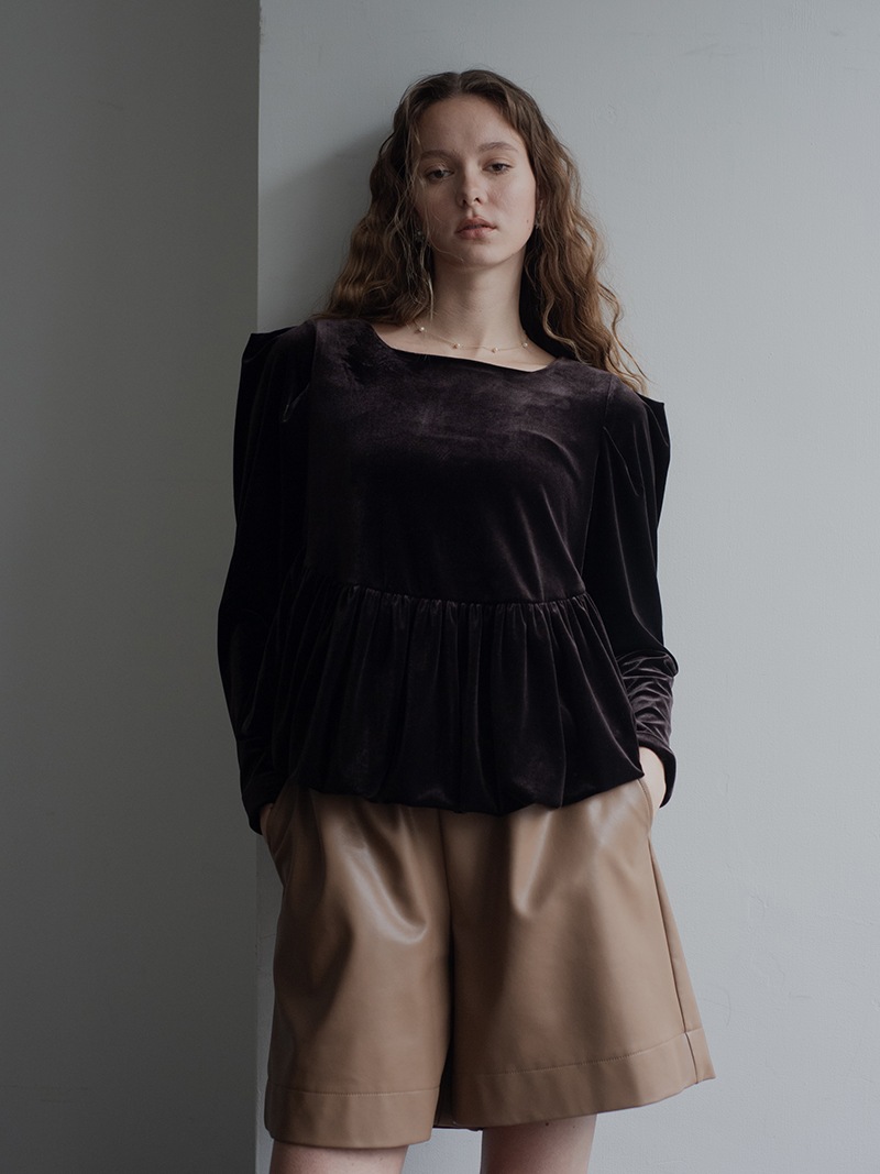 しなやかな風合いと上品な艶が魅力のベロア素材を使用したトップス。落ち感のある肌触りのよいベロアは構築感のある肩タックと、女性らしいラインを引き立てるペプラムシルエットでエレガントな印象に。