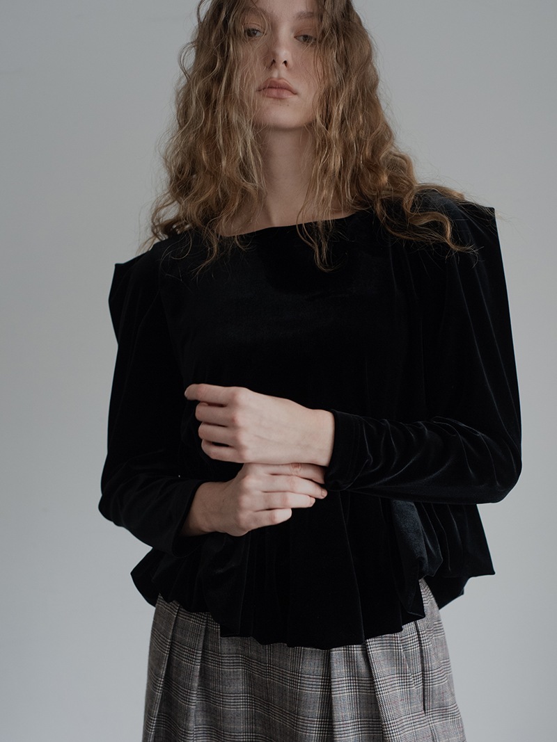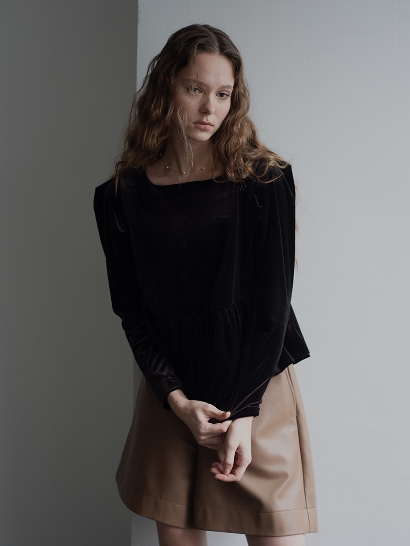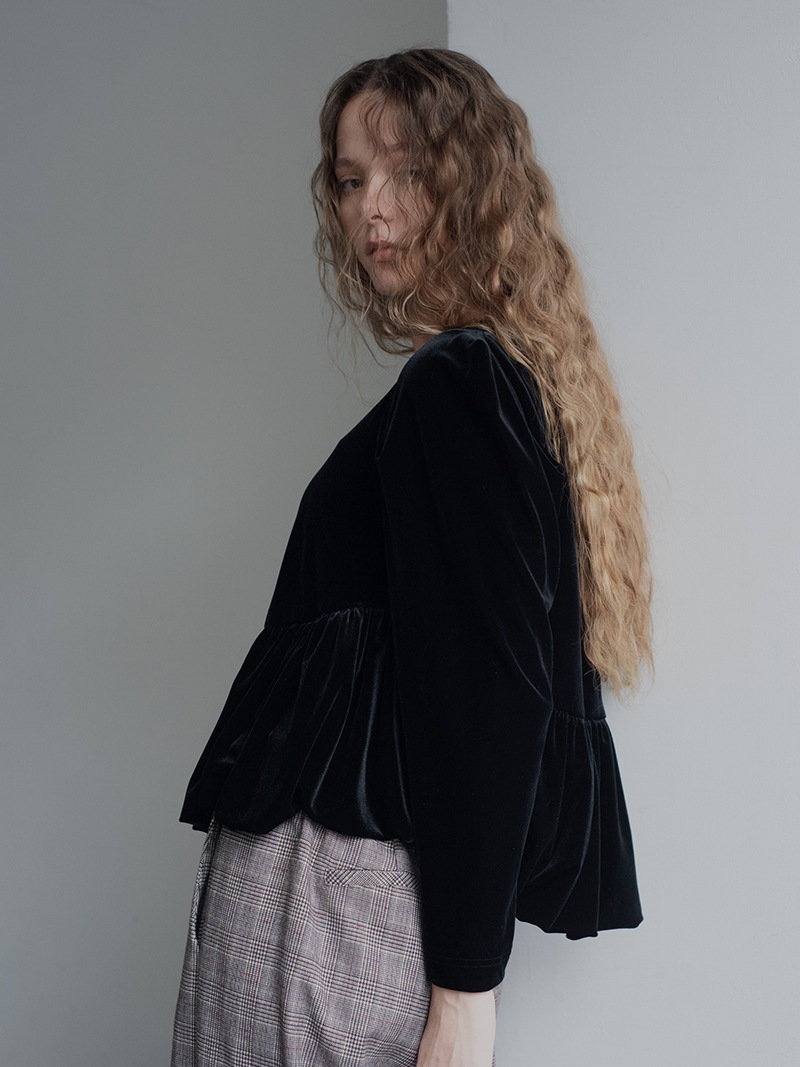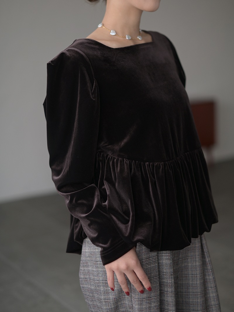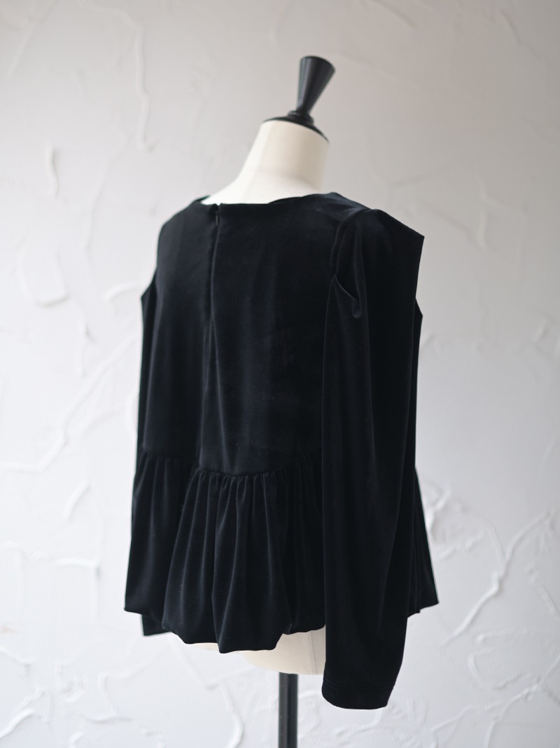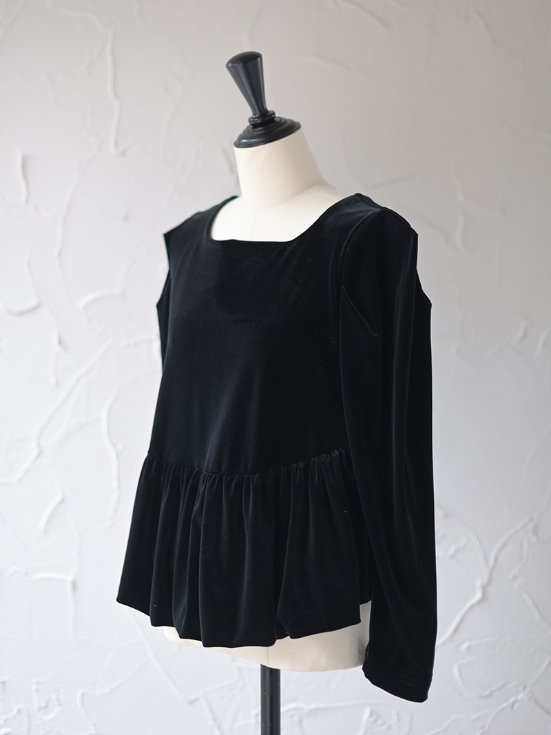 しなやかな風合いと上品な艶が魅力のベロア素材を使用したトップス。落ち感のある肌触りのよいベロアは構築感のある肩タックと、女性らしいラインを引き立てるペプラムシルエットでエレガントな印象に。
