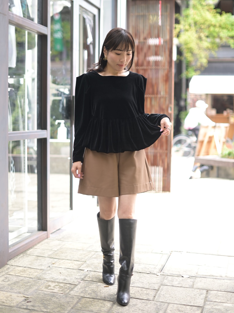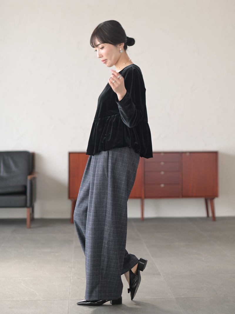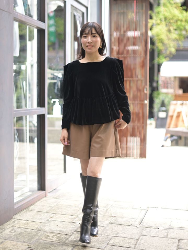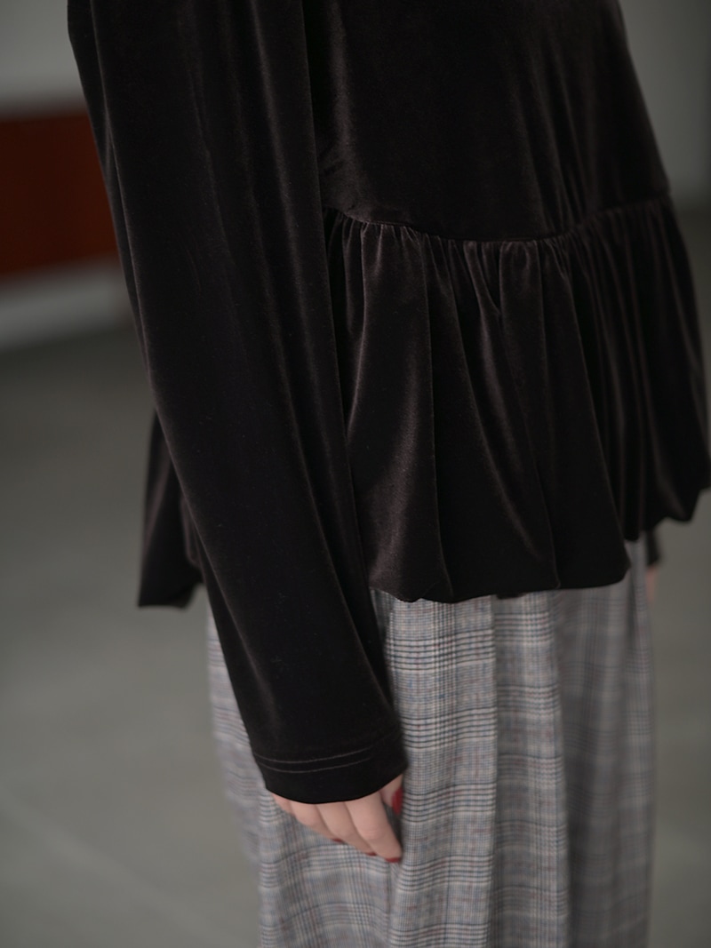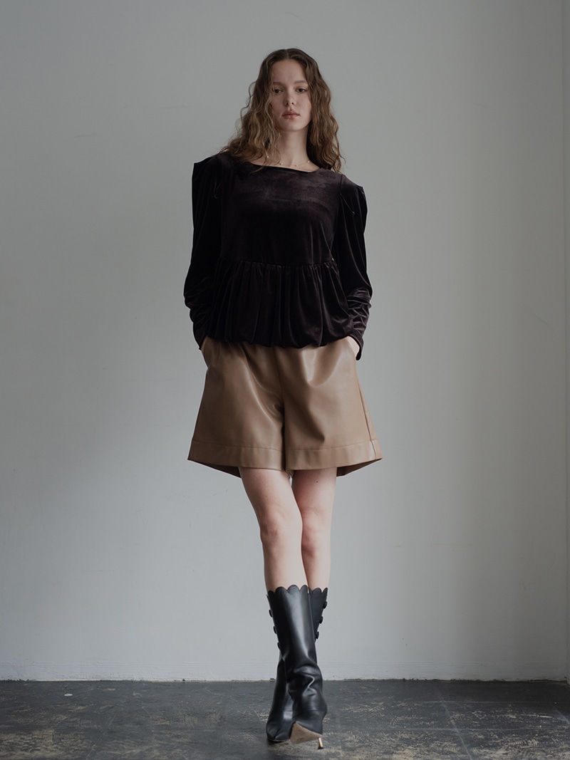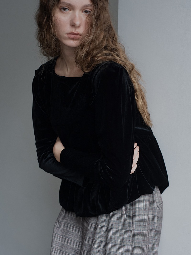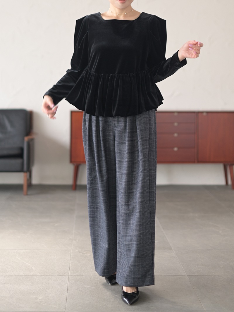 しなやかな風合いと上品な艶が魅力のベロア素材を使用したトップス。落ち感のある肌触りのよいベロアは構築感のある肩タックと、女性らしいラインを引き立てるペプラムシルエットでエレガントな印象に。