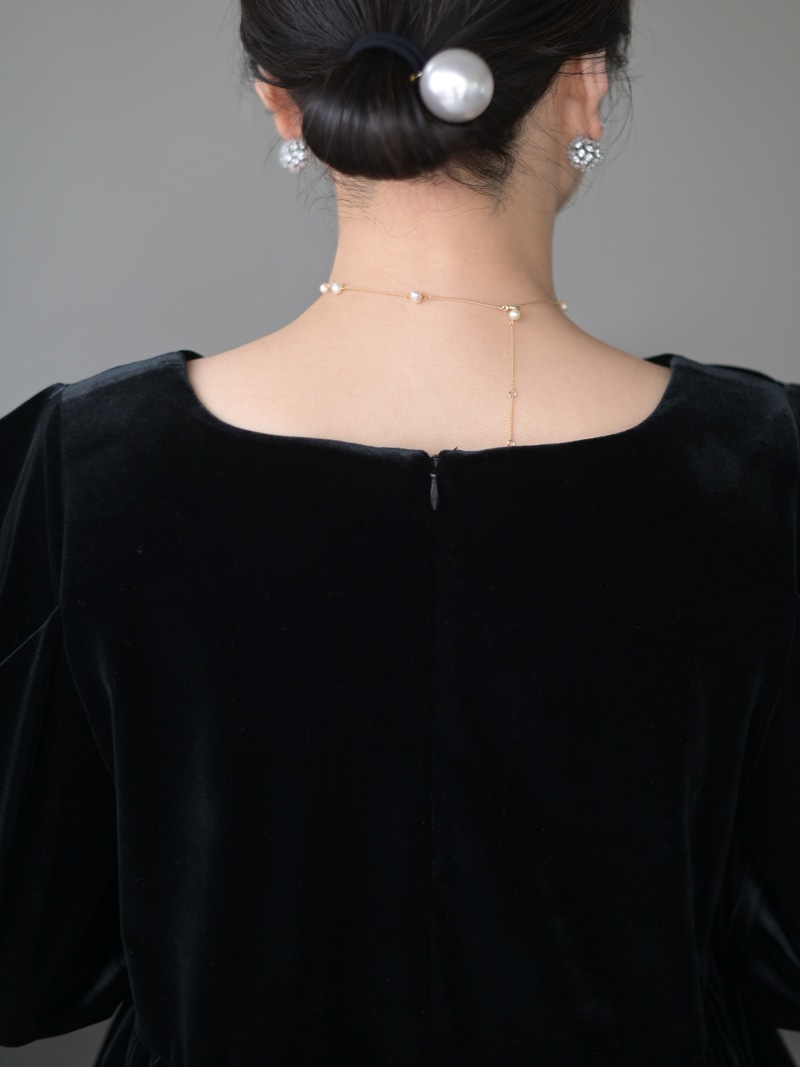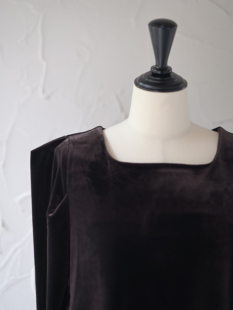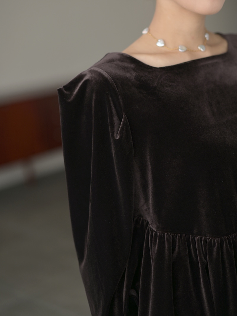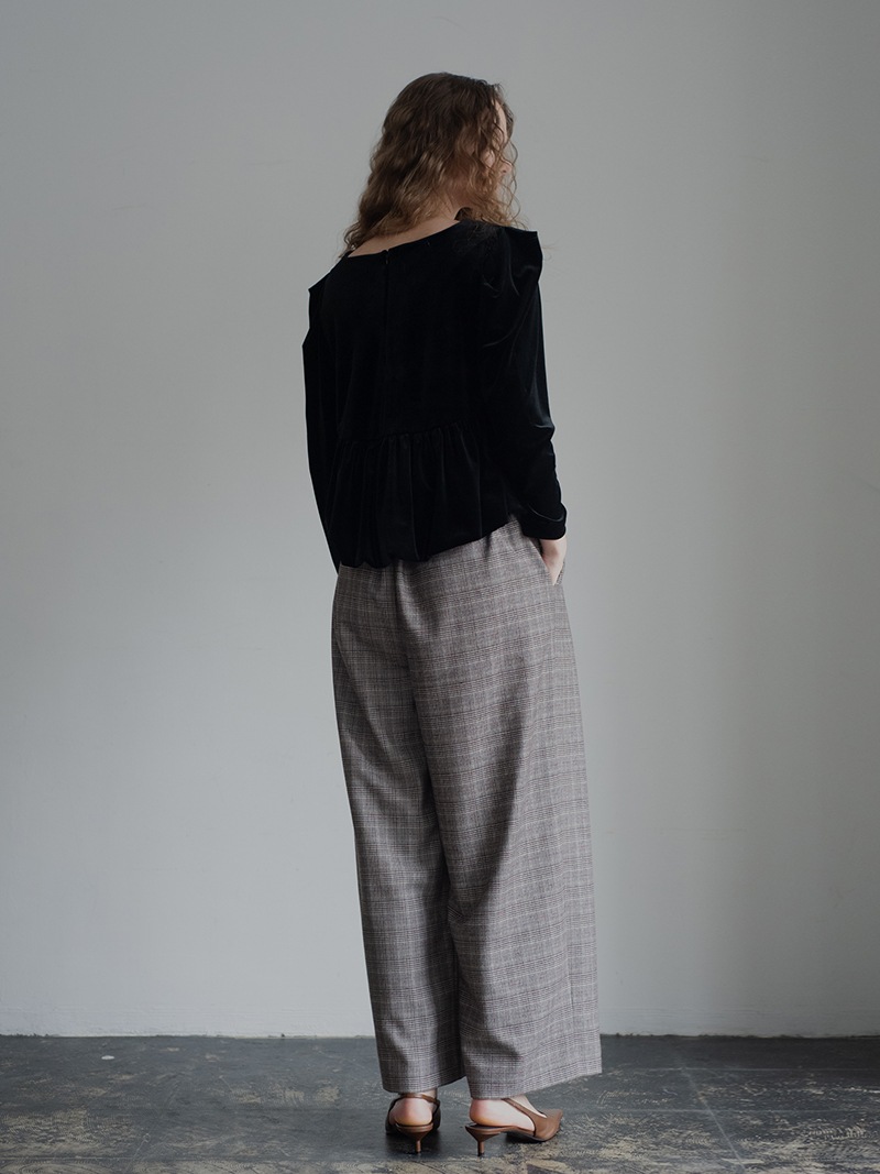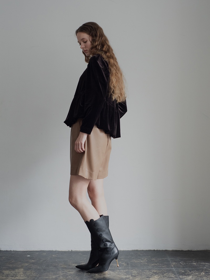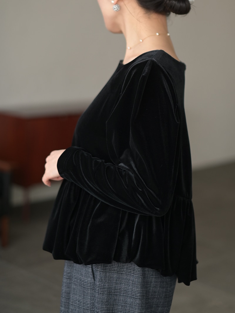 しなやかな風合いと上品な艶が魅力のベロア素材を使用したトップス。落ち感のある肌触りのよいベロアは構築感のある肩タックと、女性らしいラインを引き立てるペプラムシルエットでエレガントな印象に。
