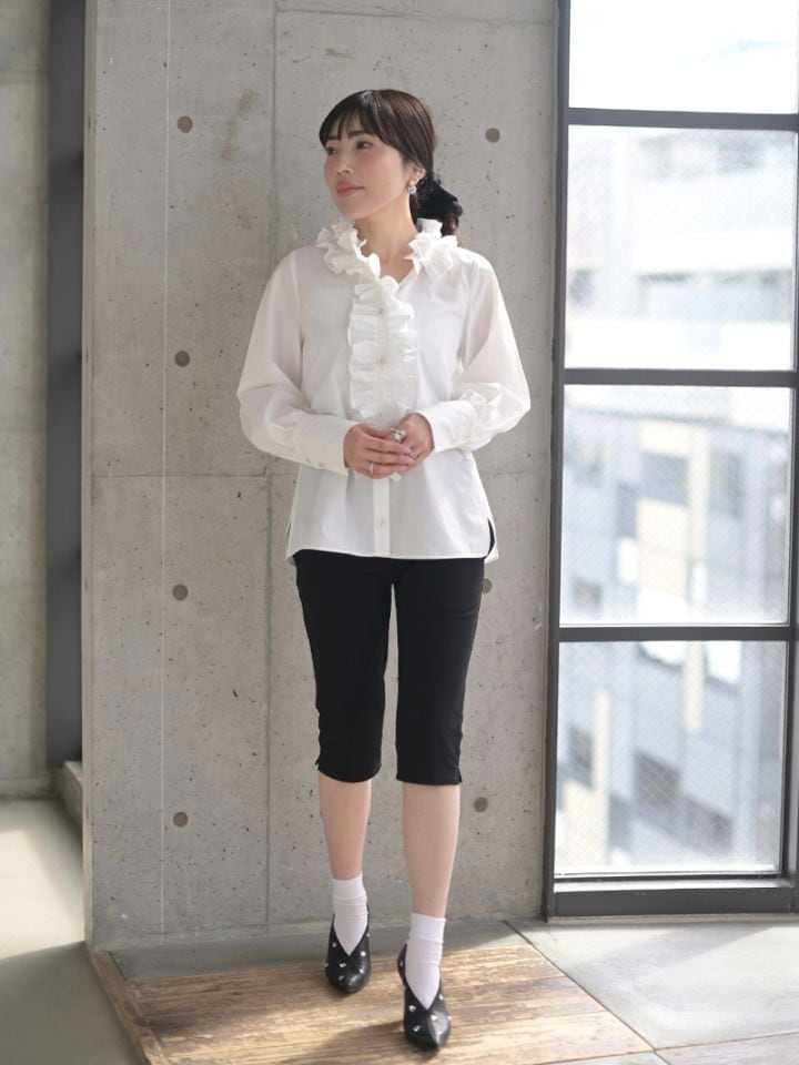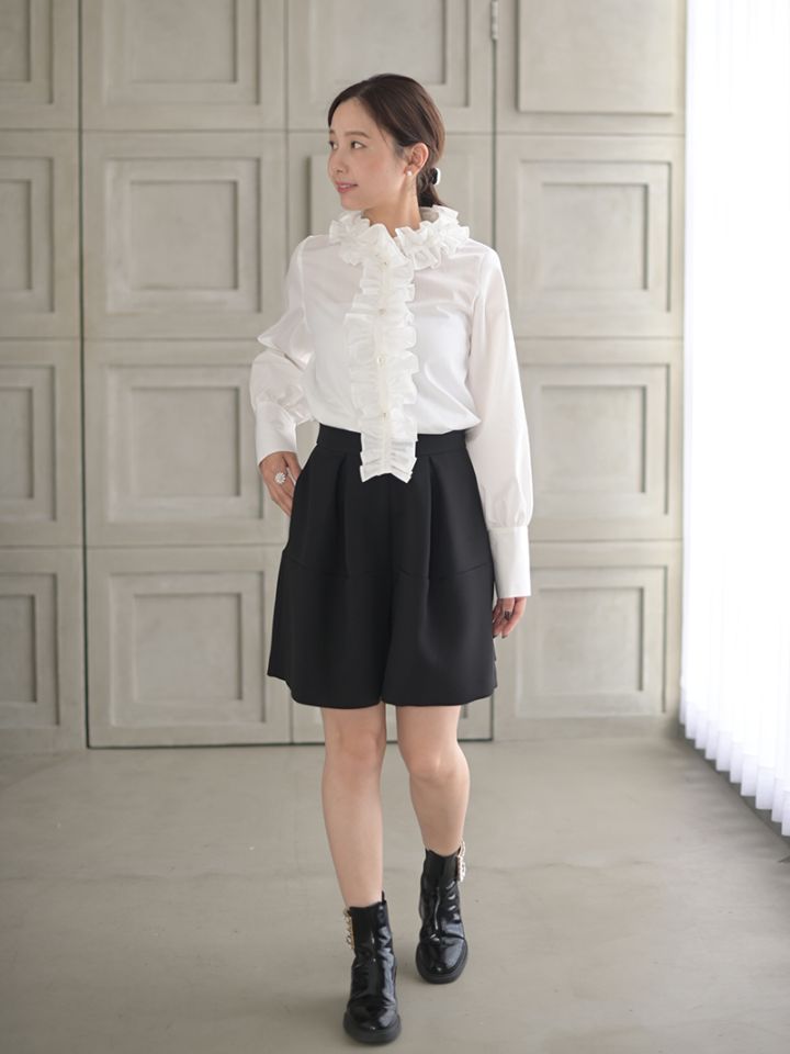 立ち上がるフリルディテールが甘さの中にエレガントな雰囲気を感じさせるワイドフリルデザイン。立ち襟からフロントまでつながったフリルはトップのボタンを外しVネックにすることで顔周りがすっきりと華やかな印象に。
