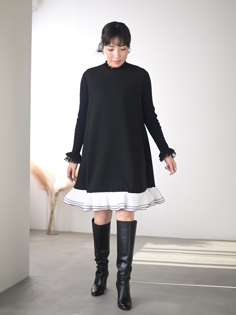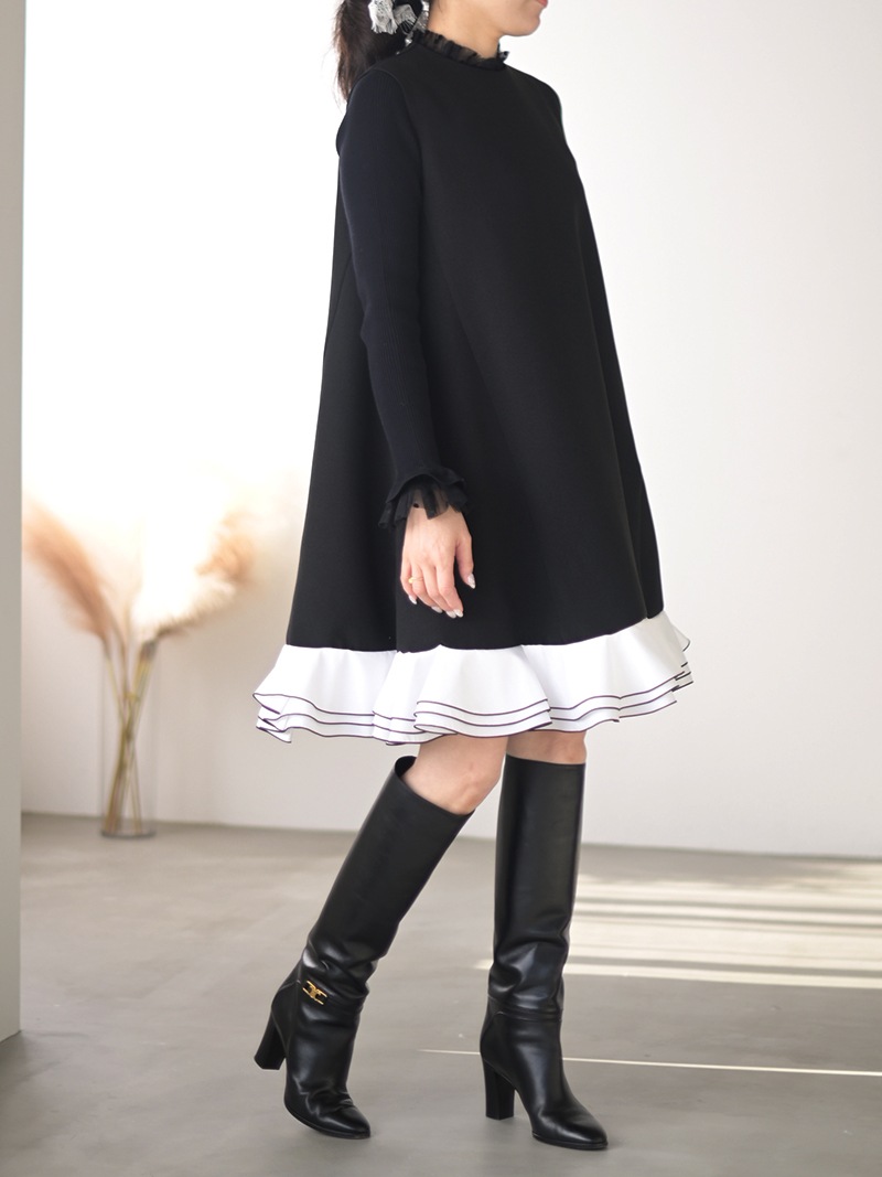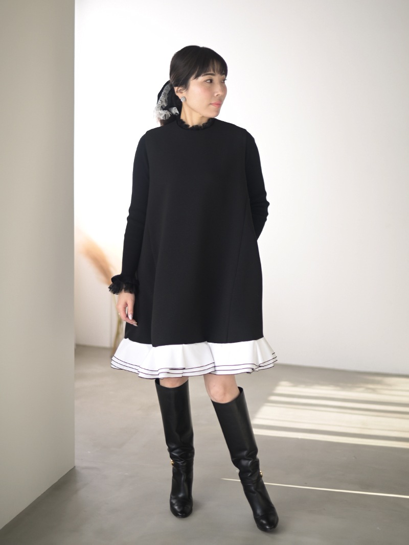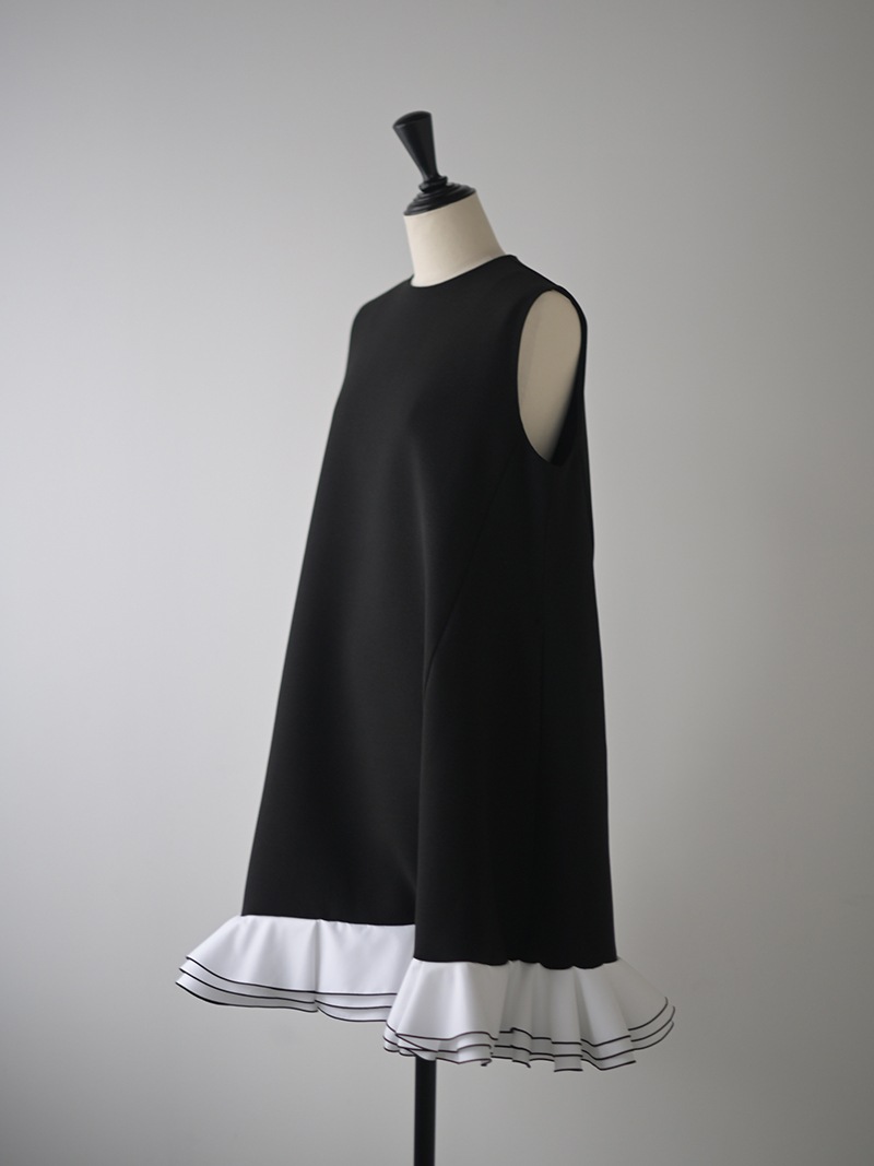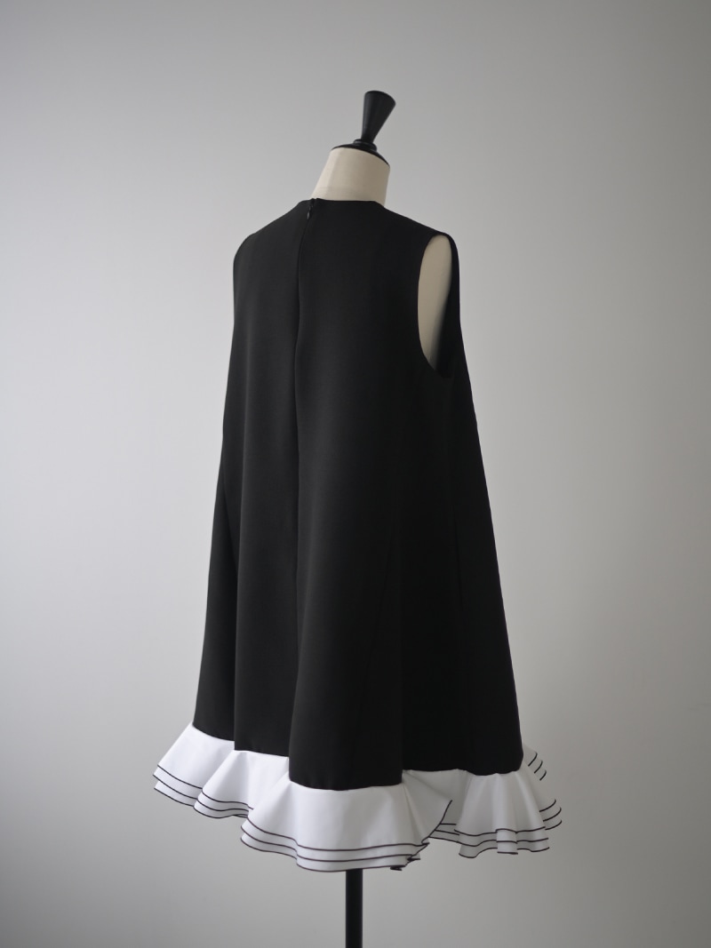 動きに合わせて揺れる計算された立体フリルを贅沢に重ねたフリルワンピース。フリルはメロー始末でコントラストをつけ、スペシャルなシーンも華やかに彩るとっておきの一枚に仕上げました。