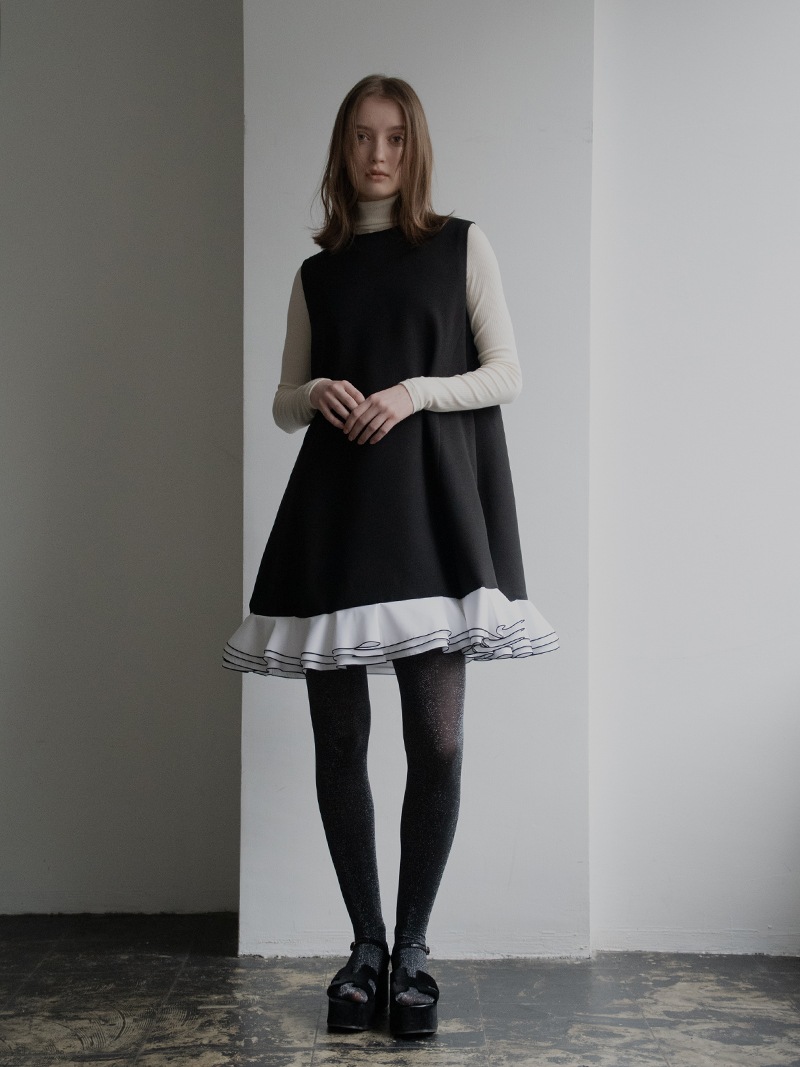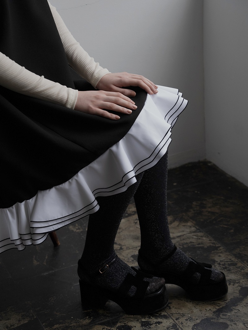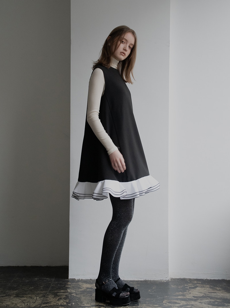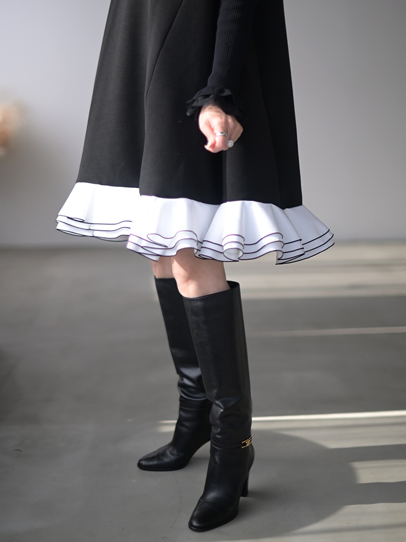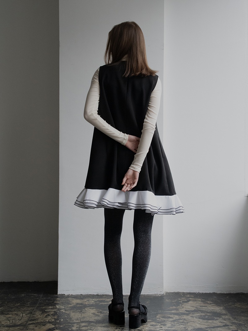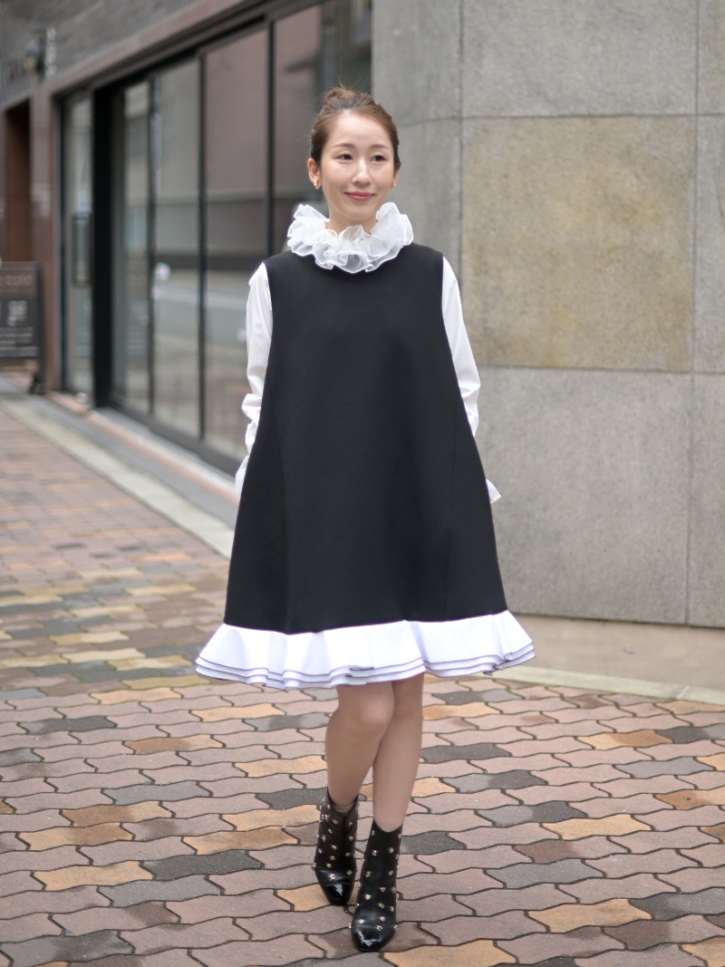 動きに合わせて揺れる計算された立体フリルを贅沢に重ねたフリルワンピース。フリルはメロー始末でコントラストをつけ、スペシャルなシーンも華やかに彩るとっておきの一枚に仕上げました。