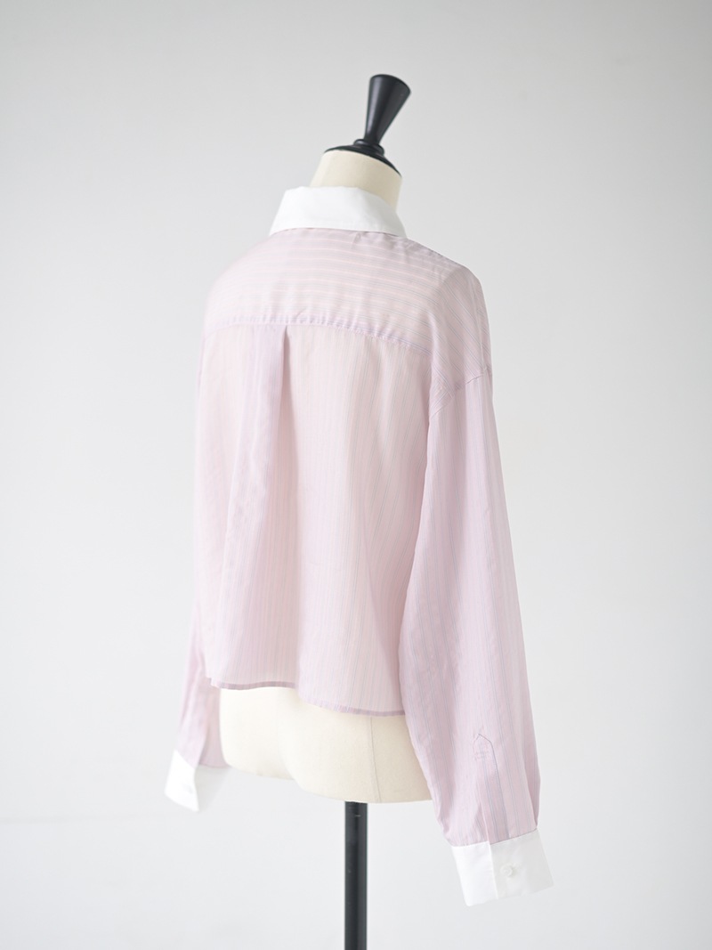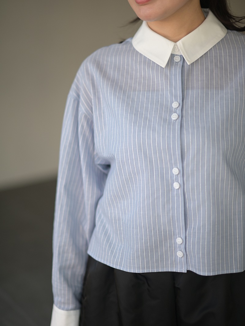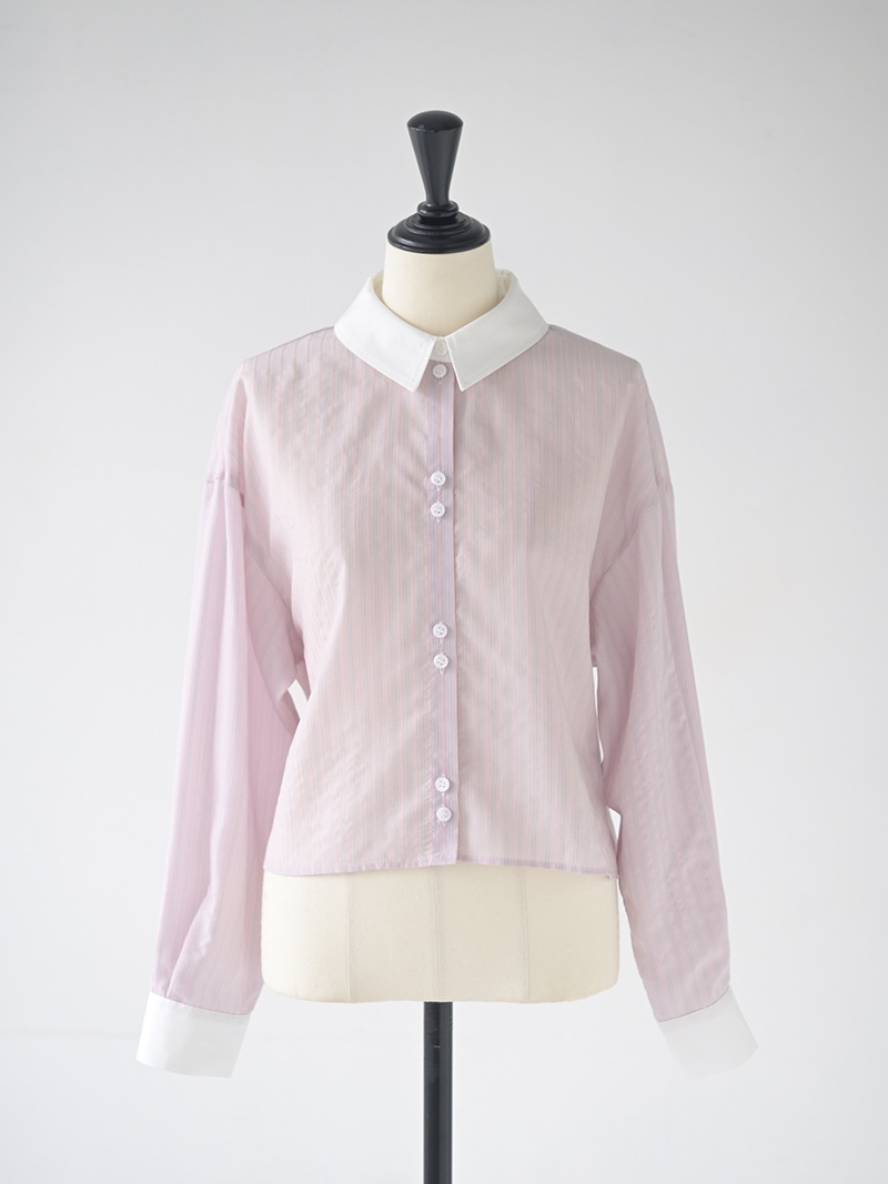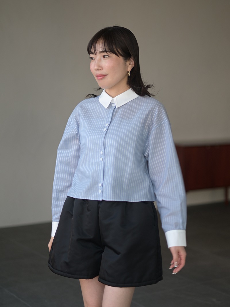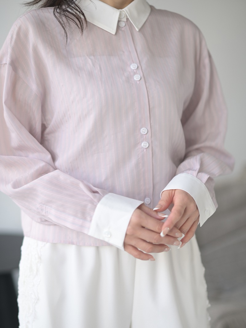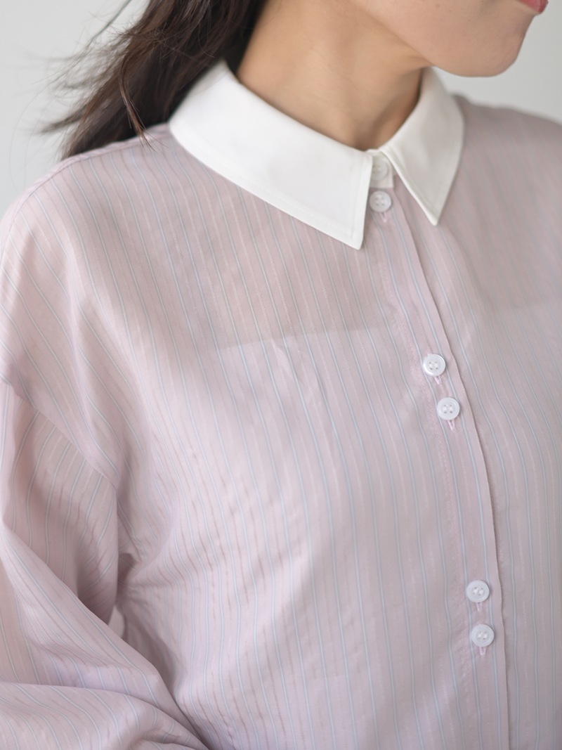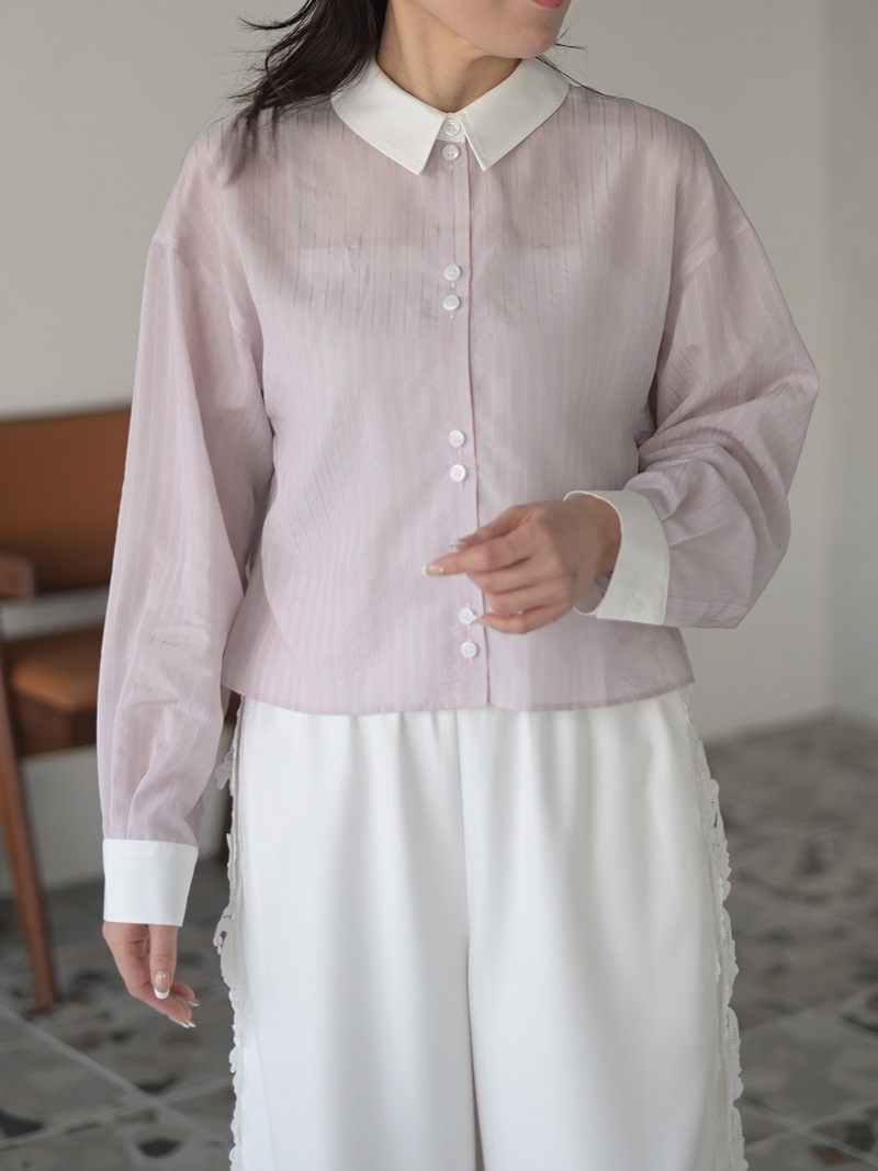 端正なストライプに、白衿とカフスが映えるシアーシャツ。クラシカルなディテールを基調に軽やかな透け感とショート丈で今年らしいトラッドなムードに。