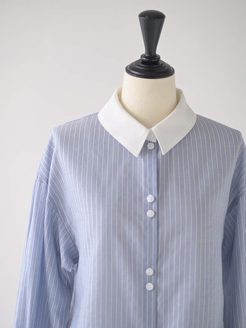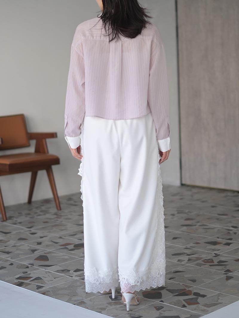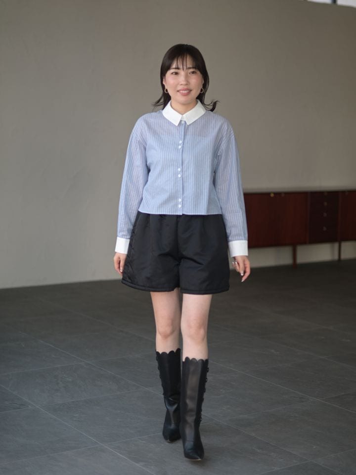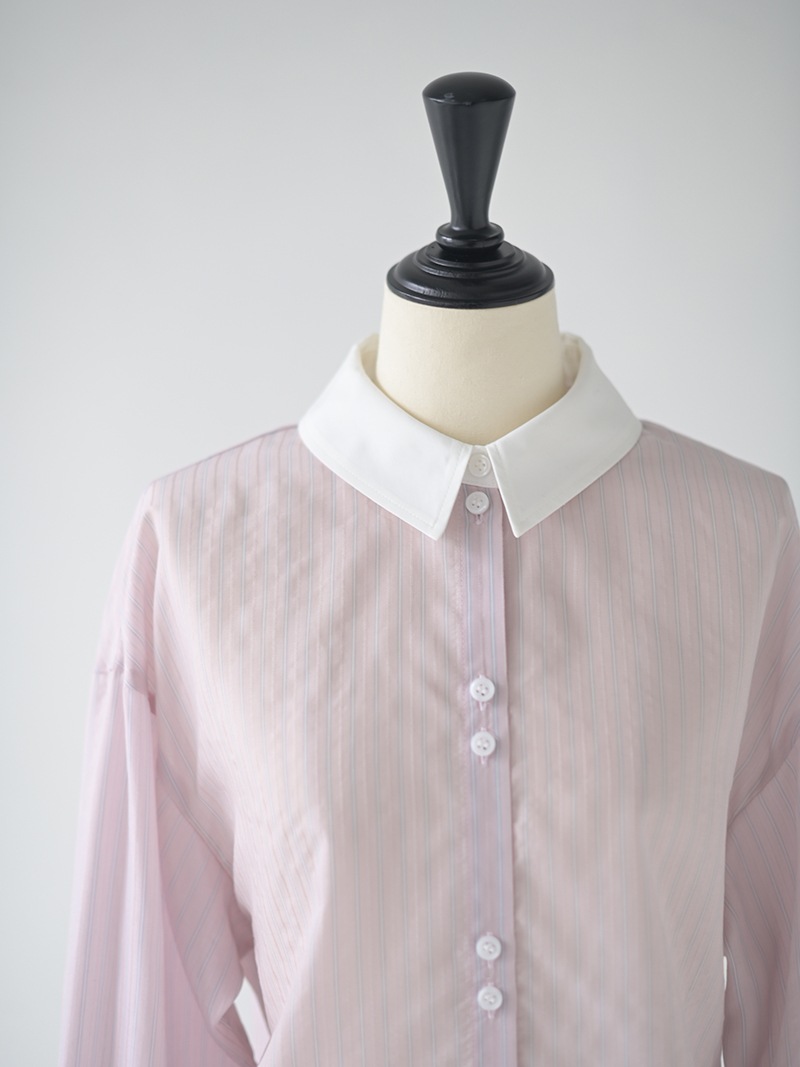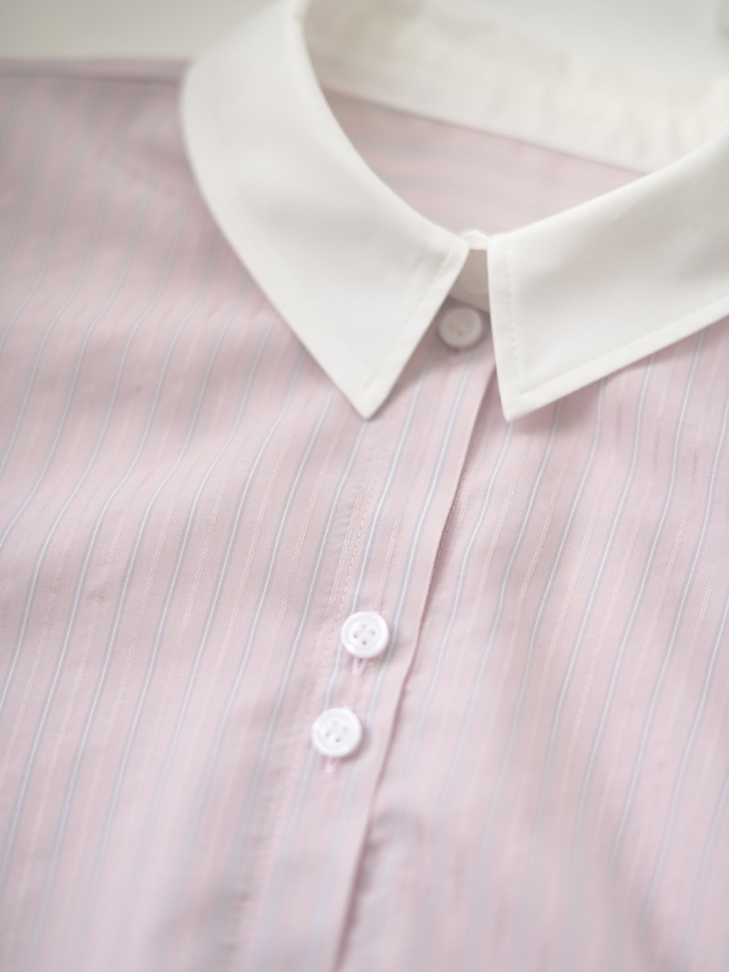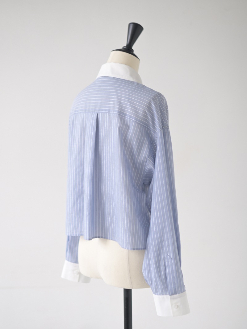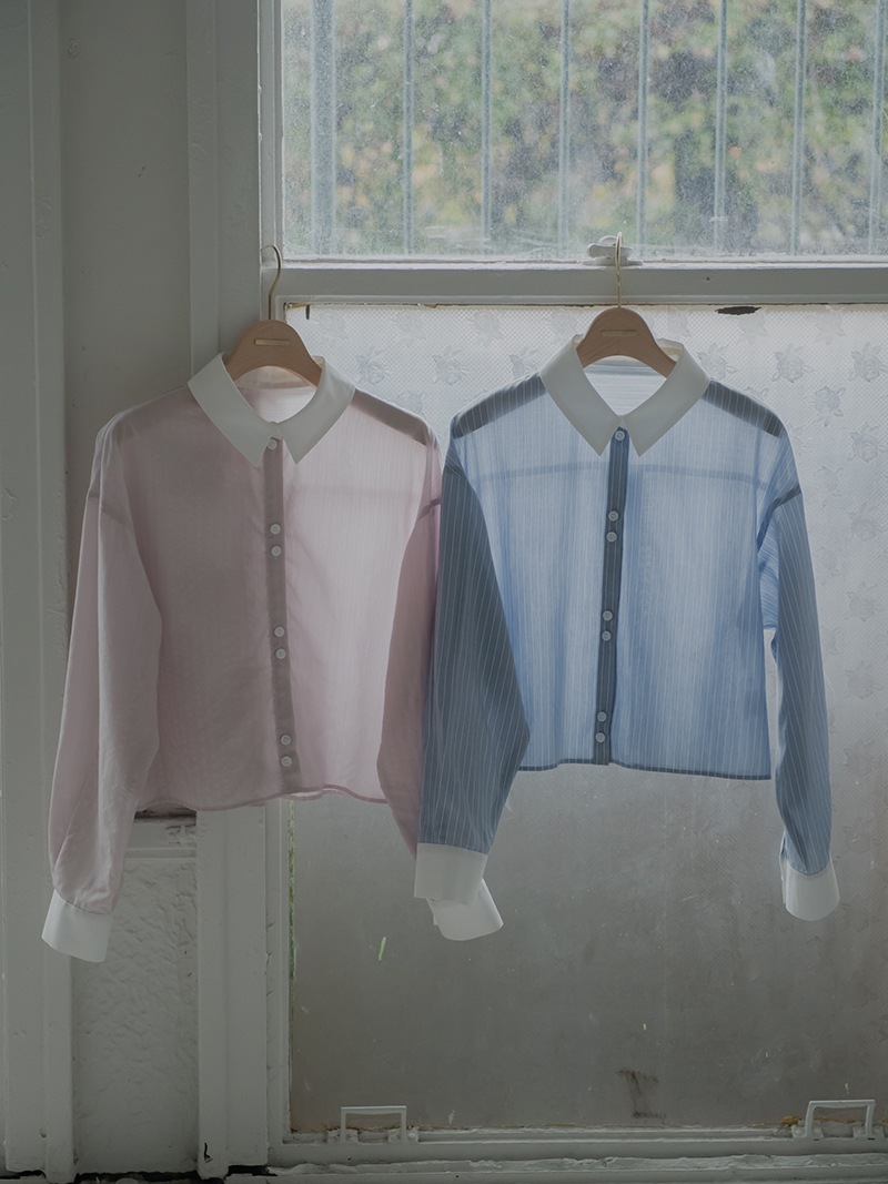 端正なストライプに、白衿とカフスが映えるシアーシャツ。クラシカルなディテールを基調に軽やかな透け感とショート丈で今年らしいトラッドなムードに。