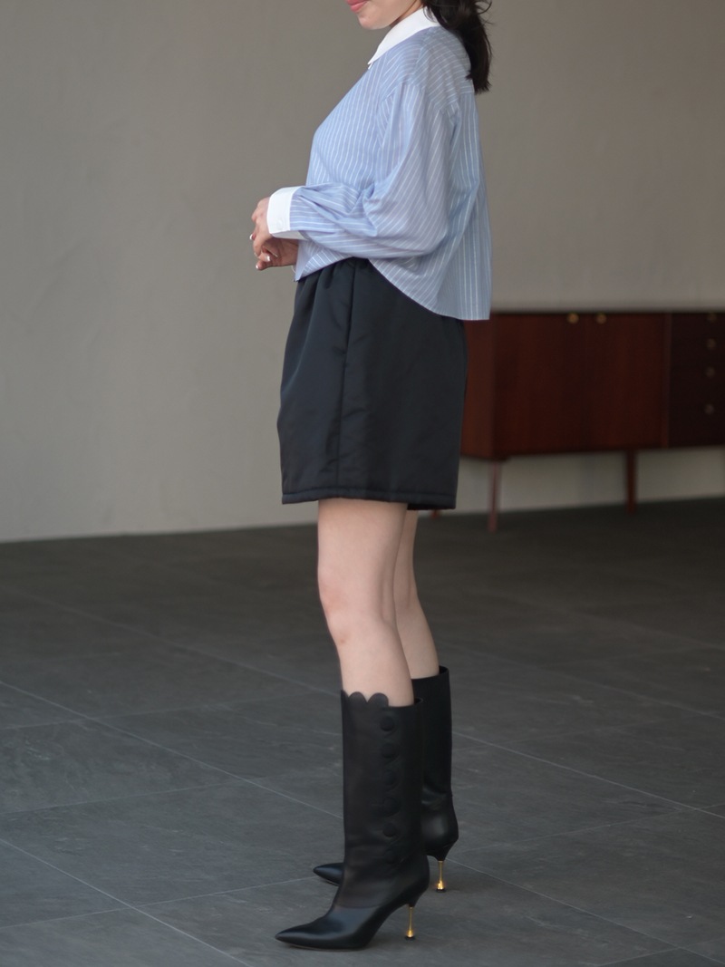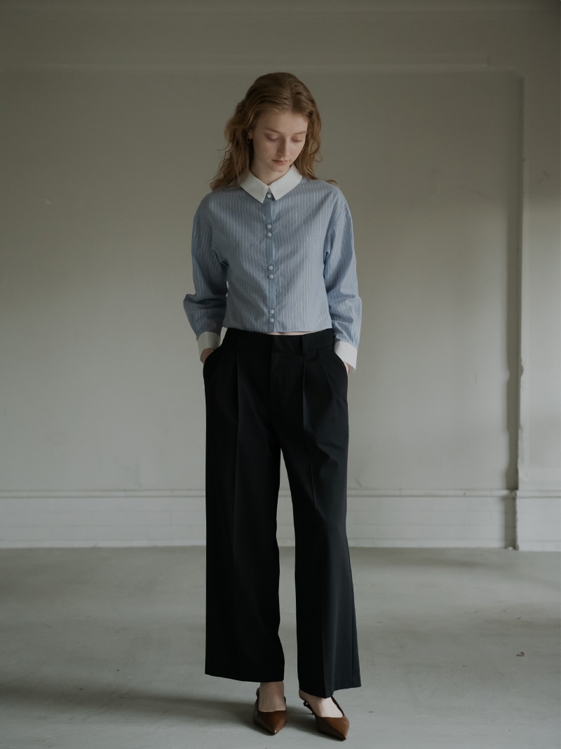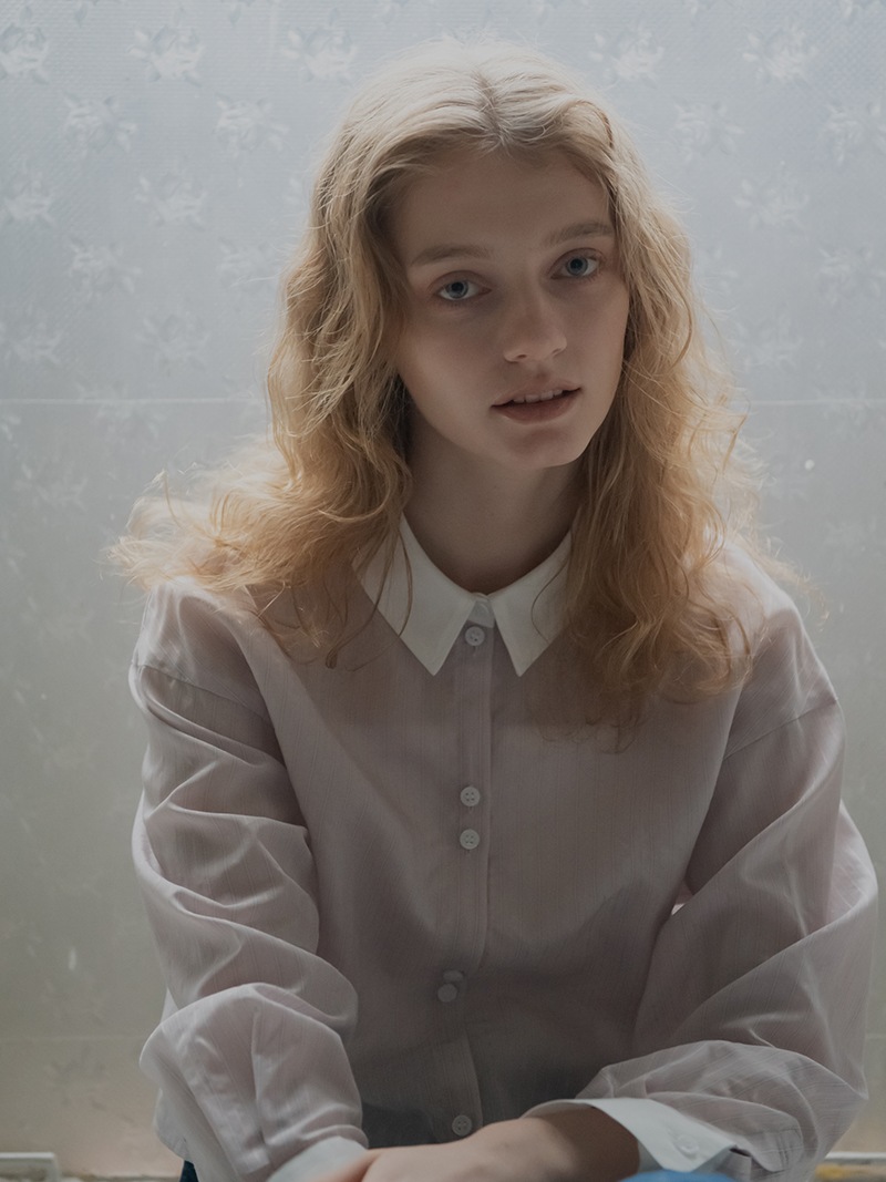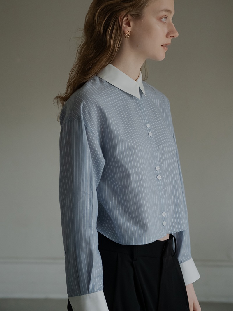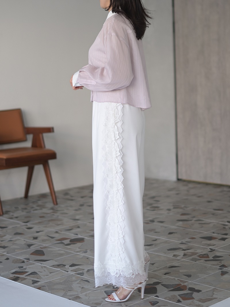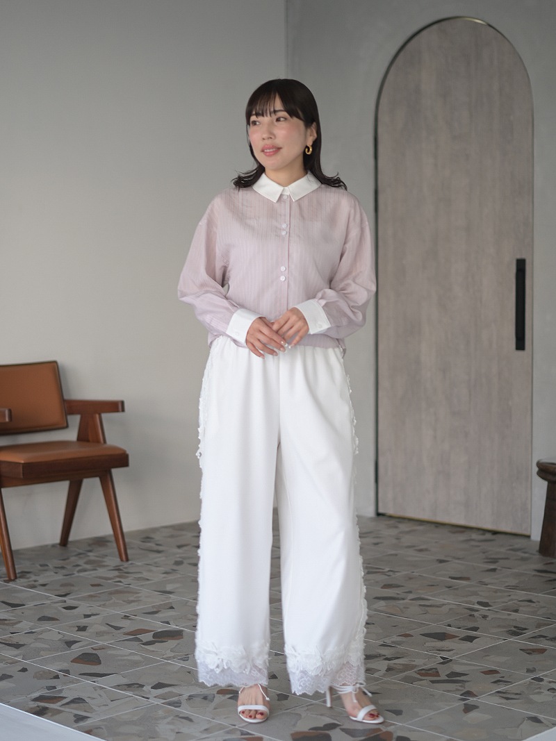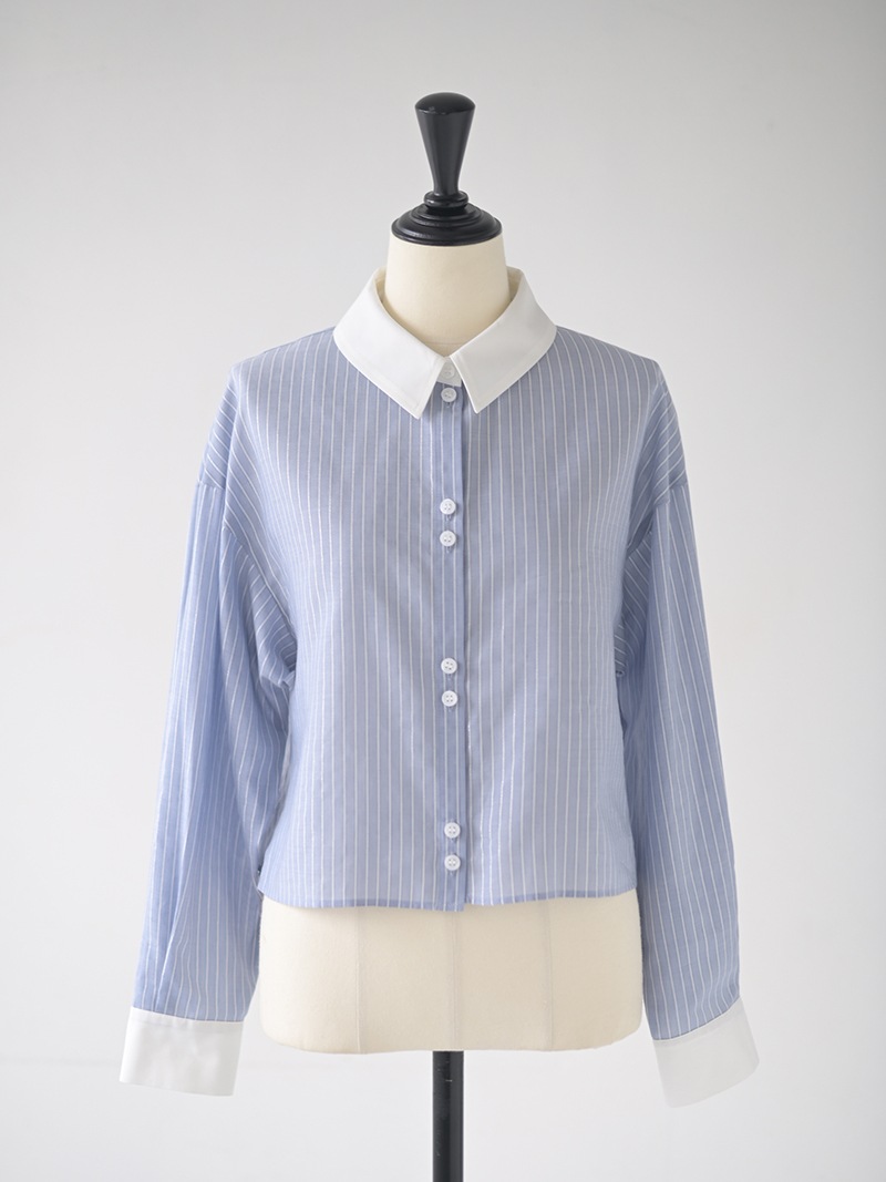 端正なストライプに、白衿とカフスが映えるシアーシャツ。クラシカルなディテールを基調に軽やかな透け感とショート丈で今年らしいトラッドなムードに。