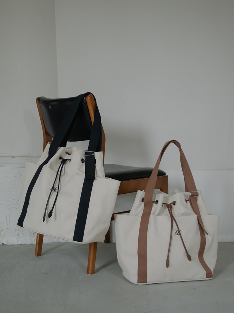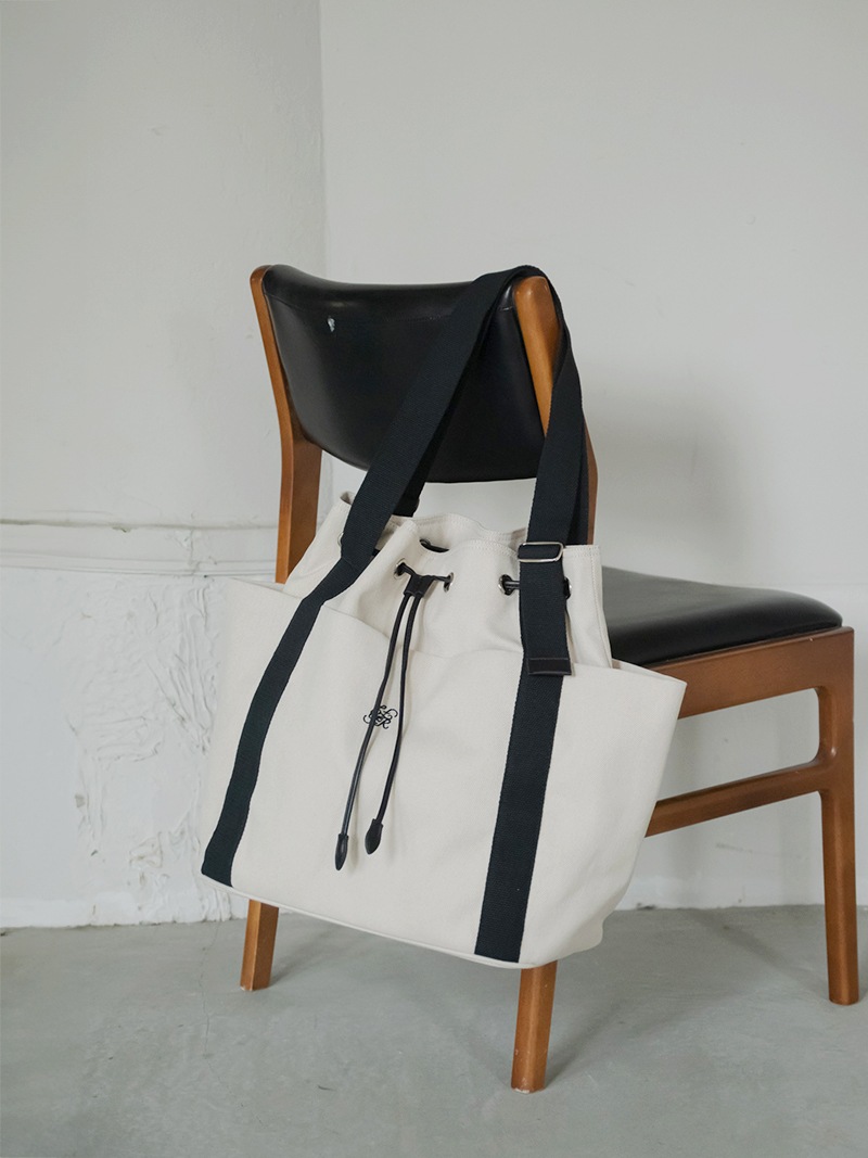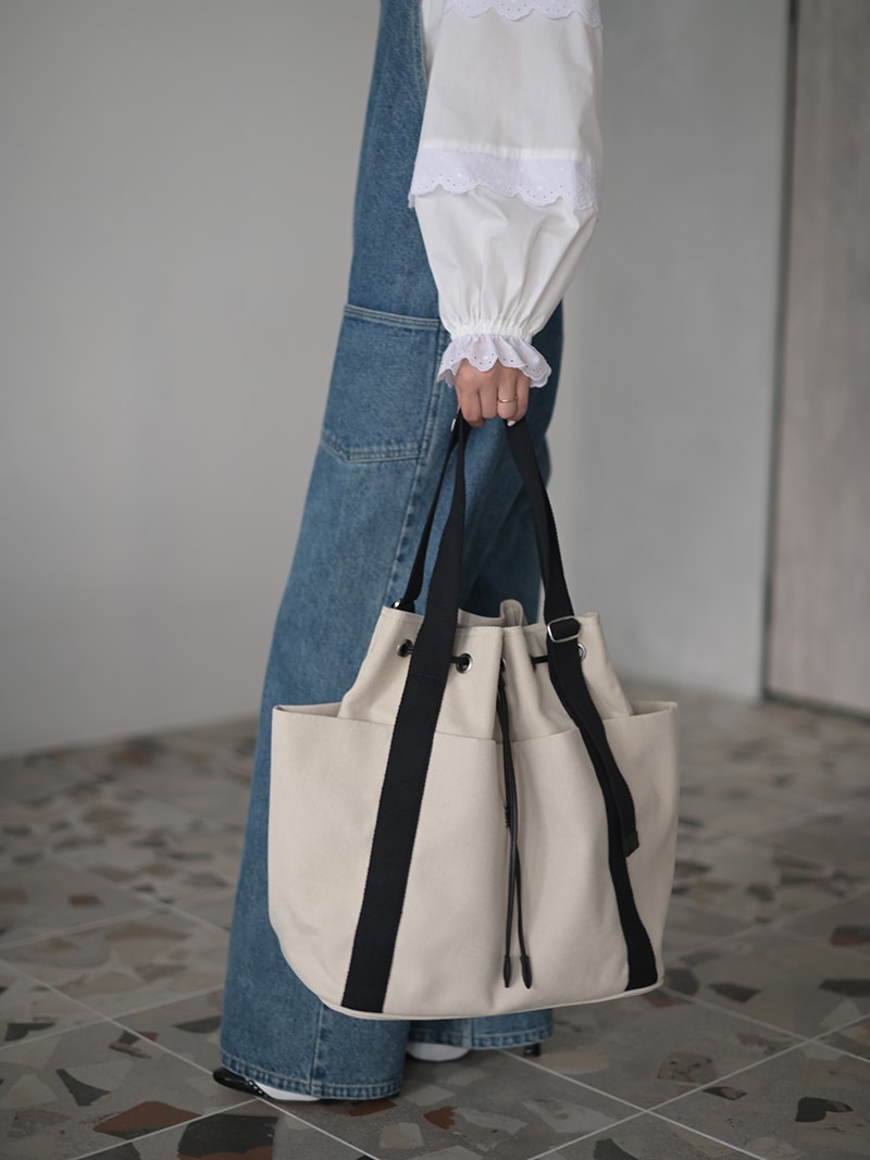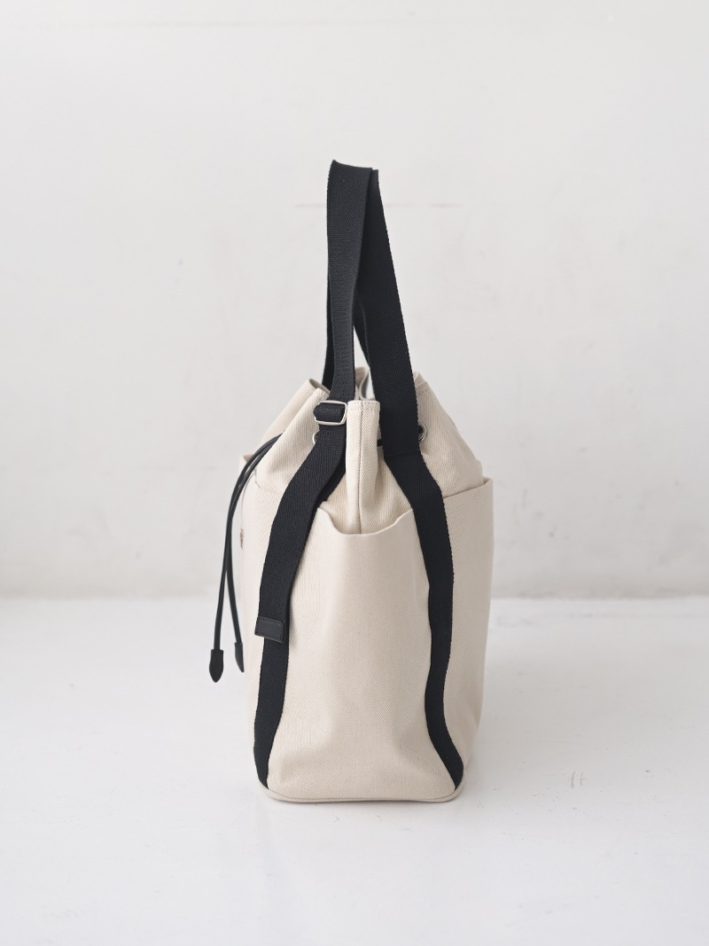 しっかりとしたキャンバス生地を使用し、キャンバス生地、裏地には撥水加工をほどこし、汚れに強い仕様に。持ち手部分は長さを調節できハンドスタイル、ショルダースタイルとお好みの長さでお召しいただけます。