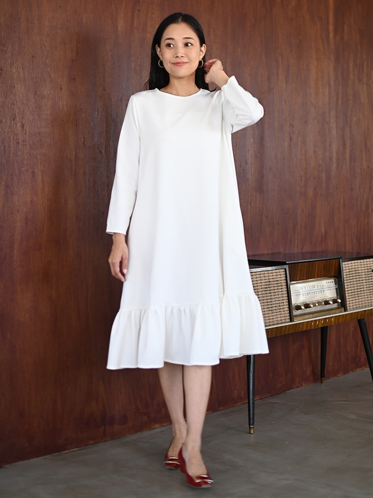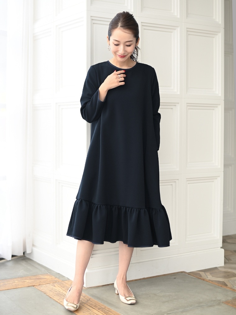 動く度にひらひらとする裾フリルがオトナ可愛いワンピース。ゆったりしたシルエットでとにかく楽に着て頂けます。