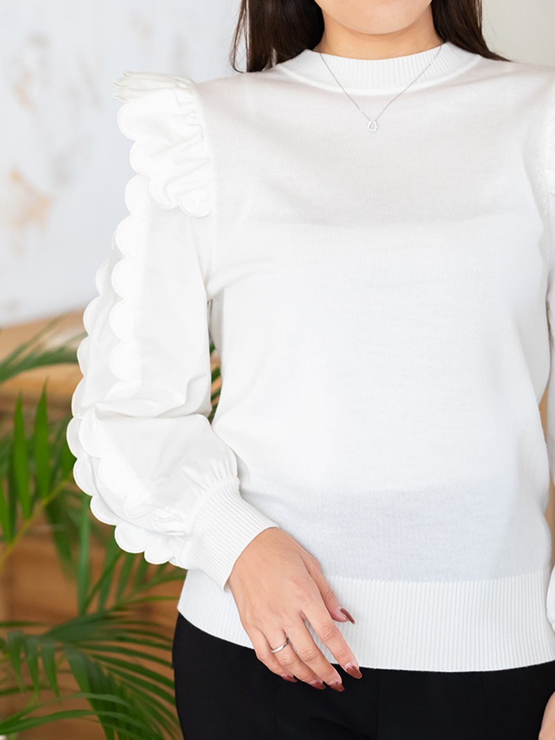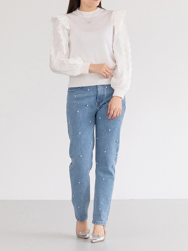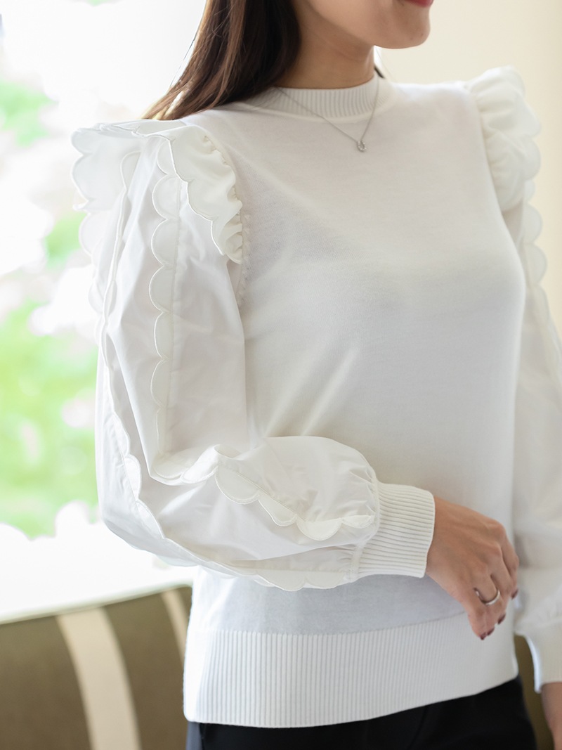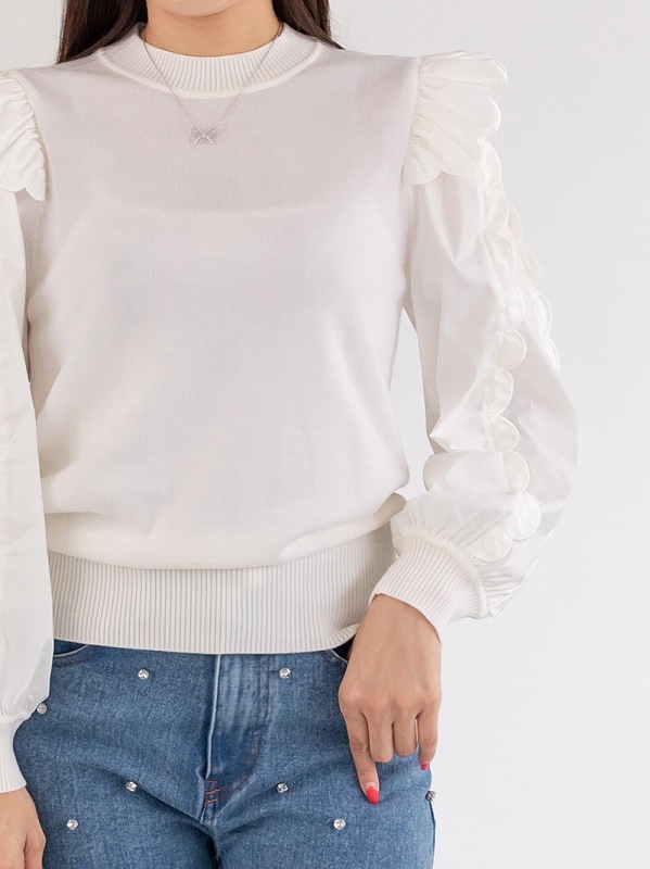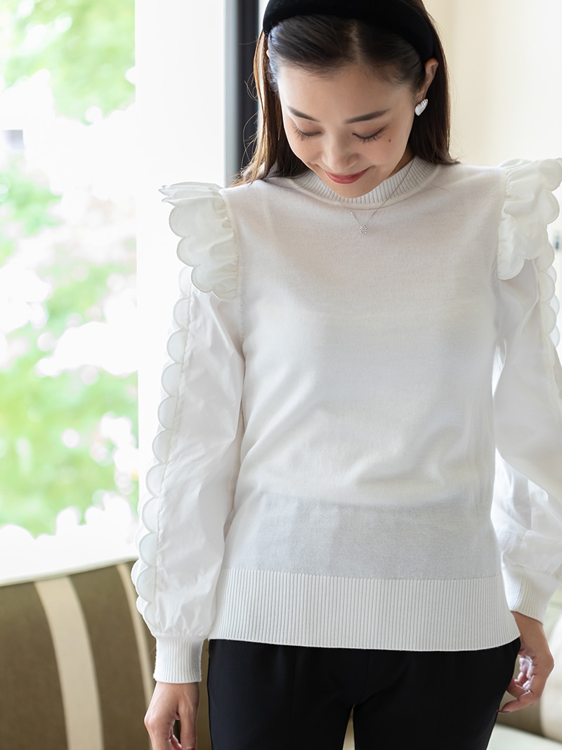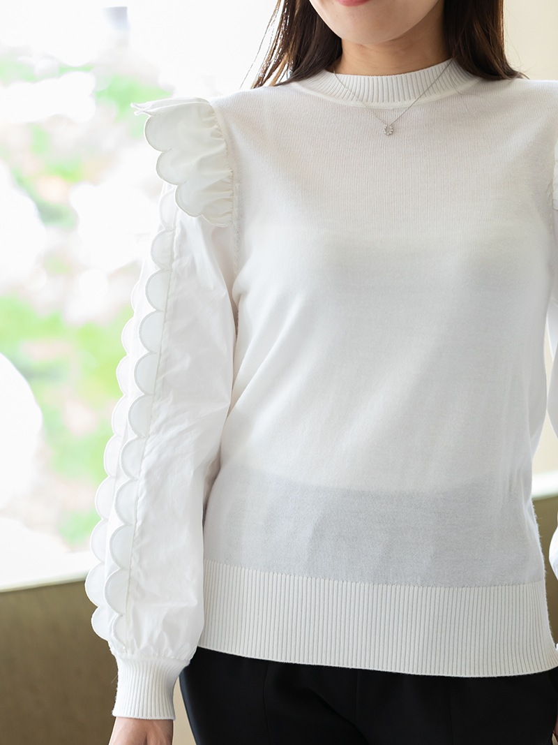 新色WHITE(ホワイト)カラーの登場です。ショルダー部分にほどこした立体的なスカラップがポイント。異素材ドッキングで今年らしさもプラス。