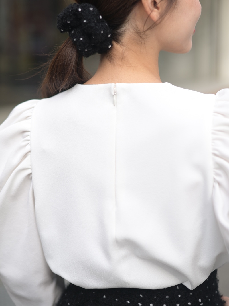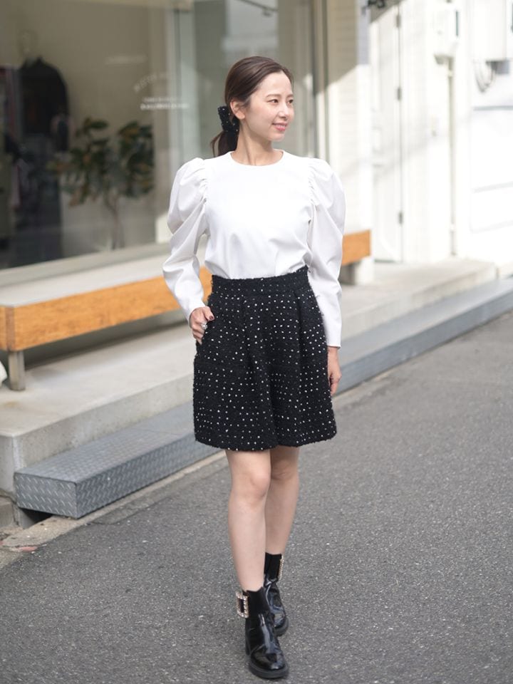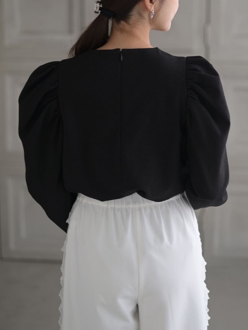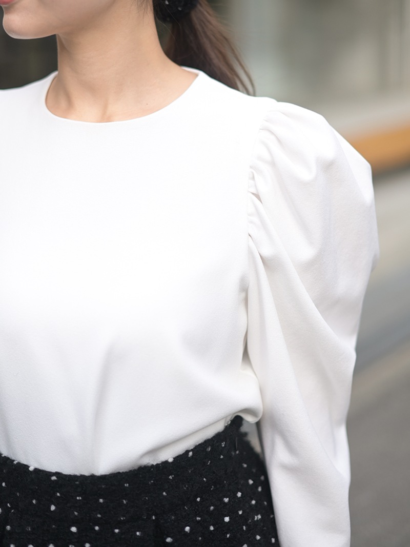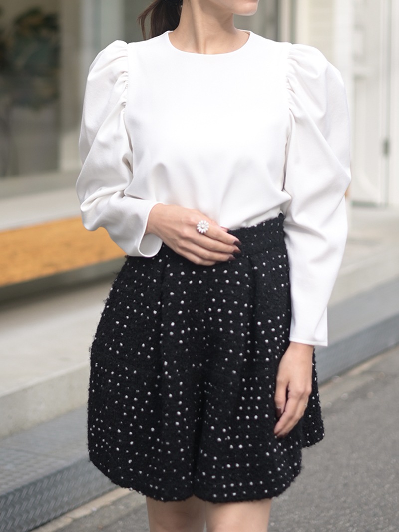 華やかさを引き立てるパワーショルダーと手首にかけてやや細くなるシルエットがポイント。レイヤードはもちろん、一枚でも品のあるスタイリングが完成します。