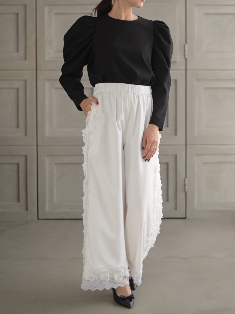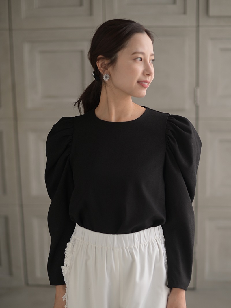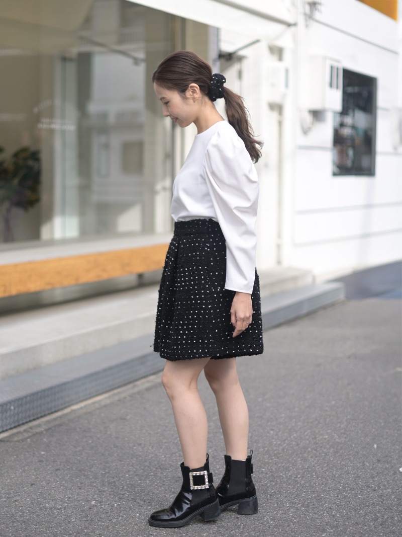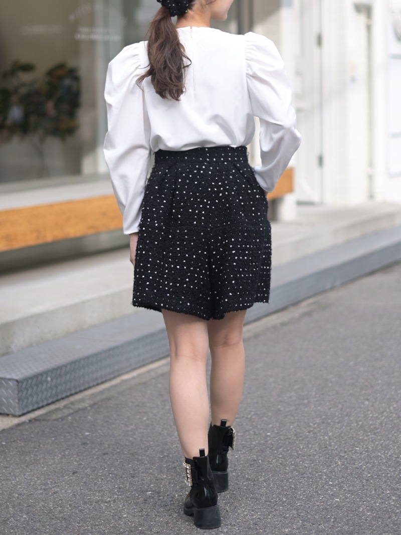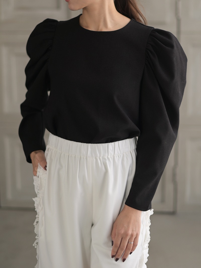 華やかさを引き立てるパワーショルダーと手首にかけてやや細くなるシルエットがポイント。レイヤードはもちろん、一枚でも品のあるスタイリングが完成します。