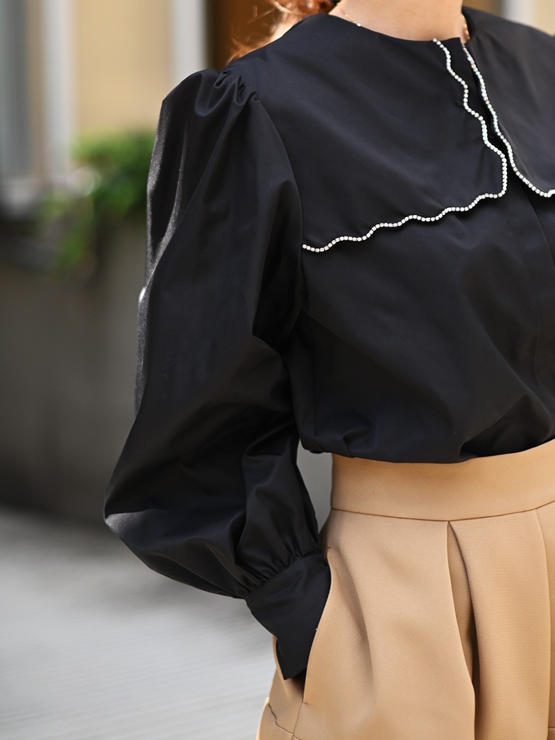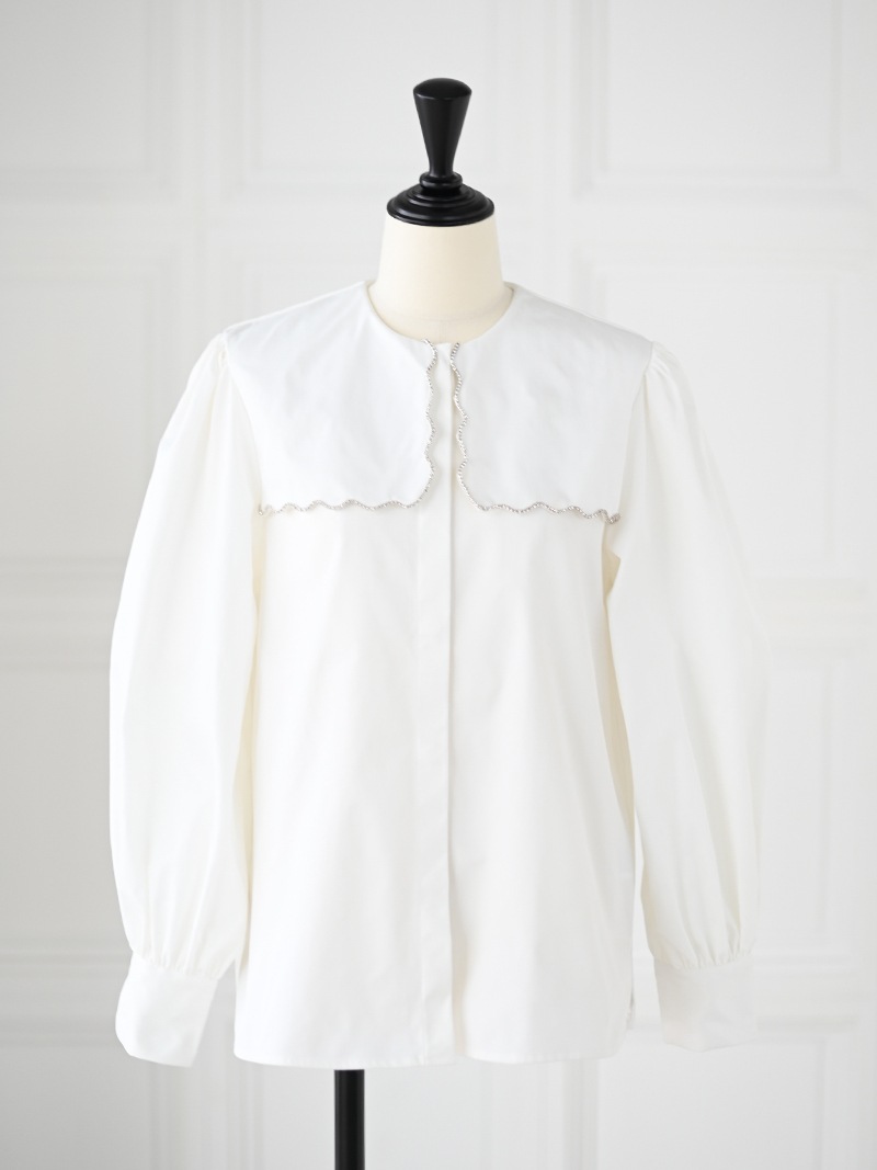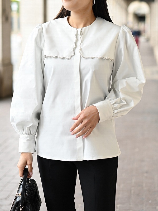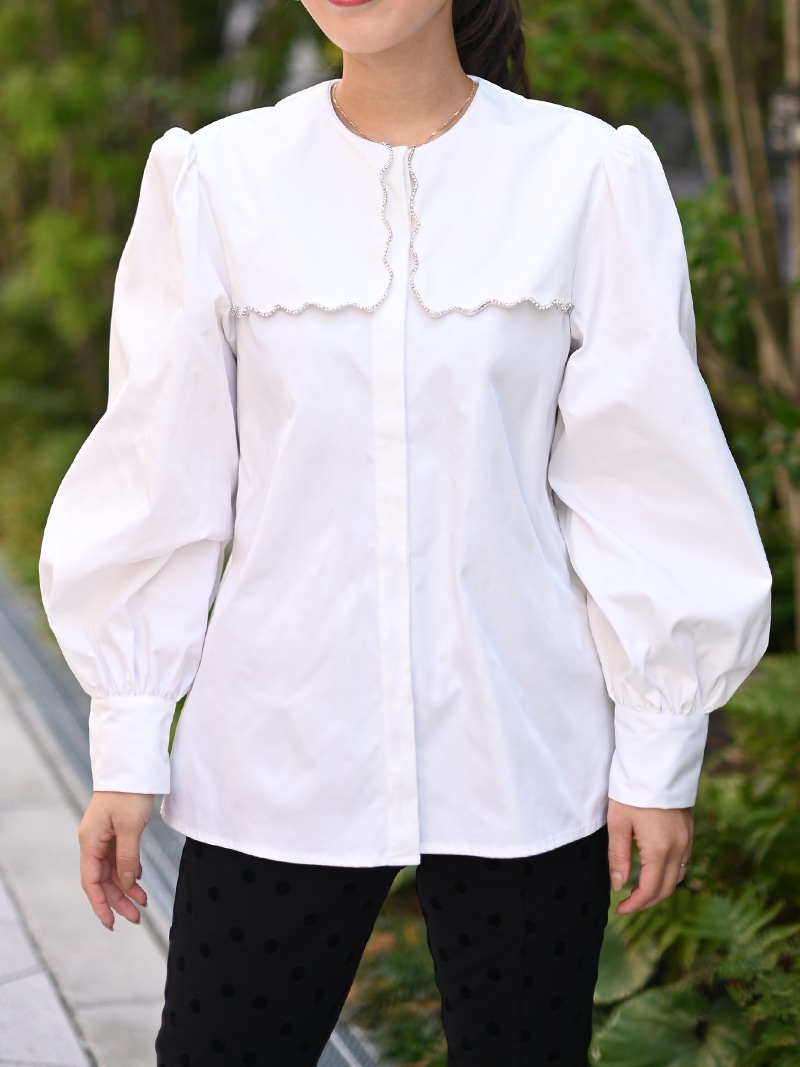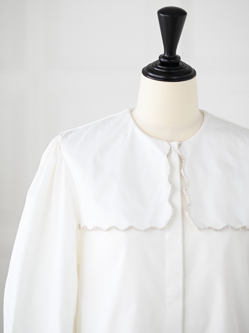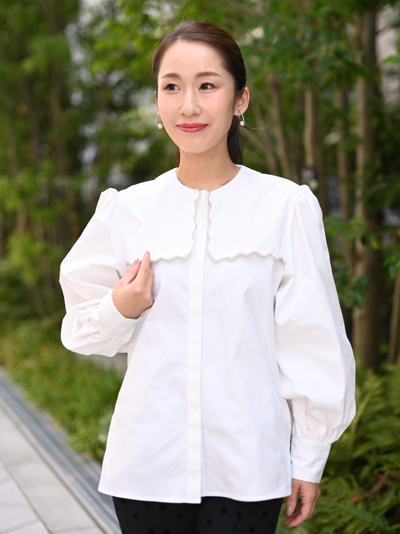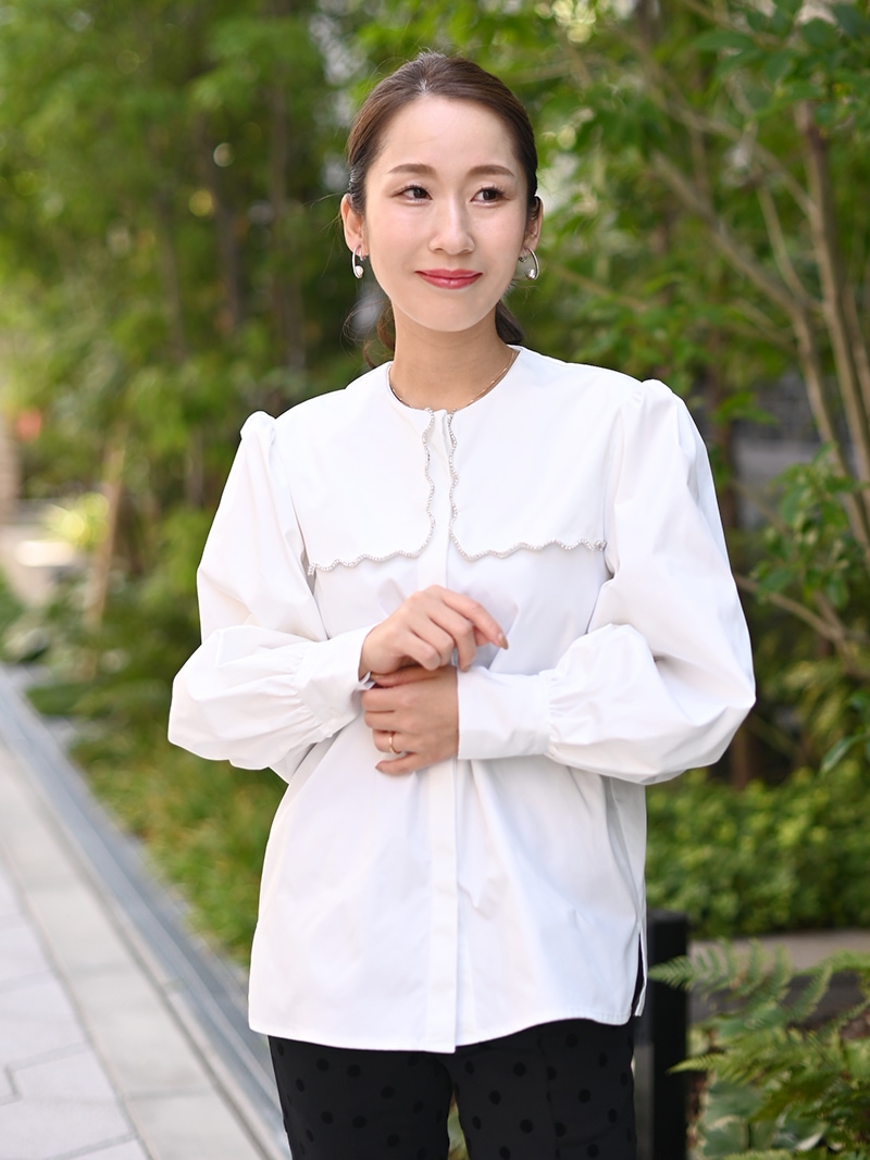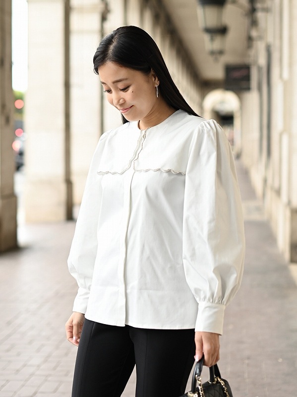 一点一点敷き詰めたスカラップビジューが目を惹くブラウス。スカラップ襟はあえて取り付けにすることで甘すぎない大人っぽく上品な印象に。