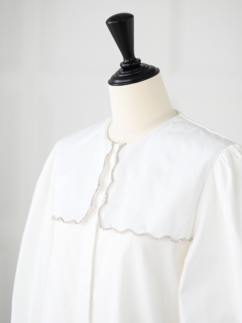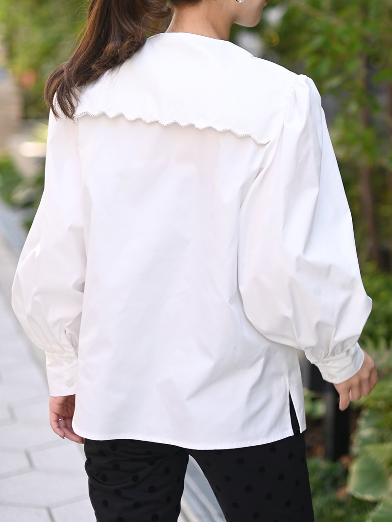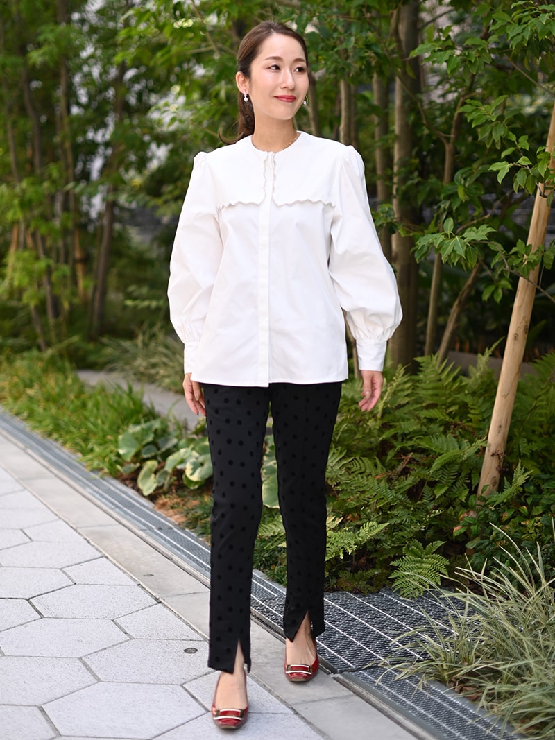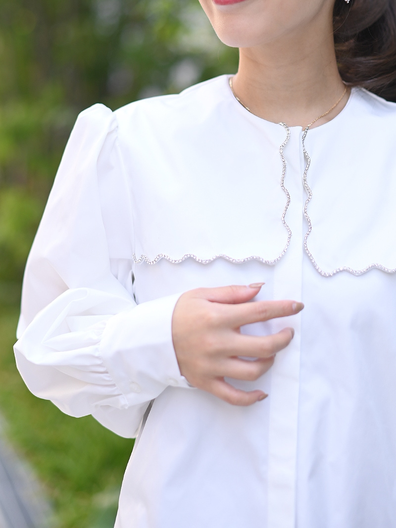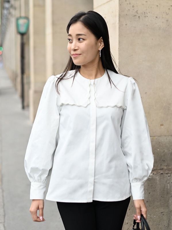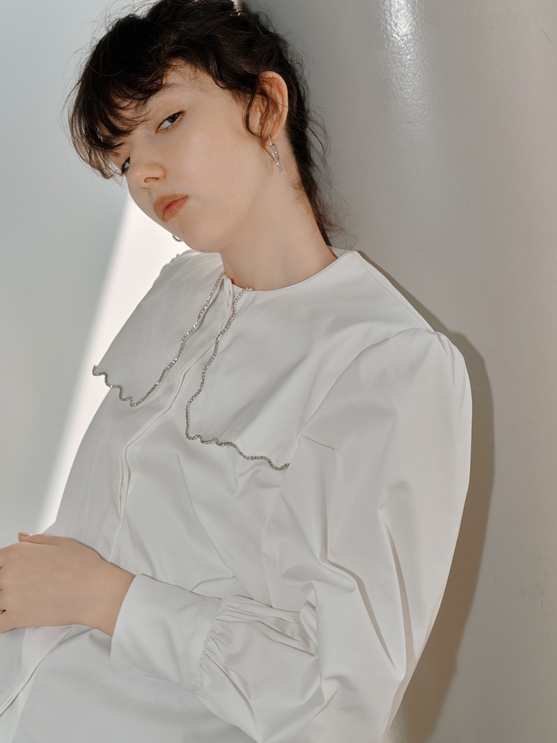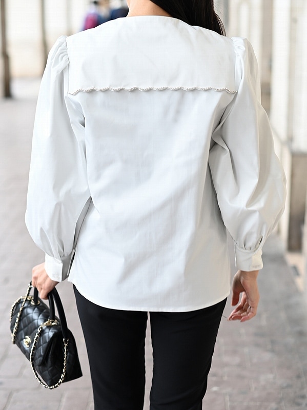 一点一点敷き詰めたスカラップビジューが目を惹くブラウス。スカラップ襟はあえて取り付けにすることで甘すぎない大人っぽく上品な印象に。
