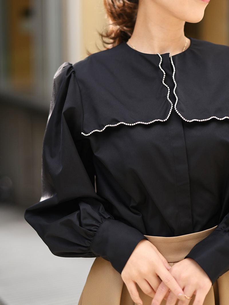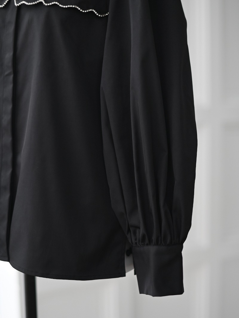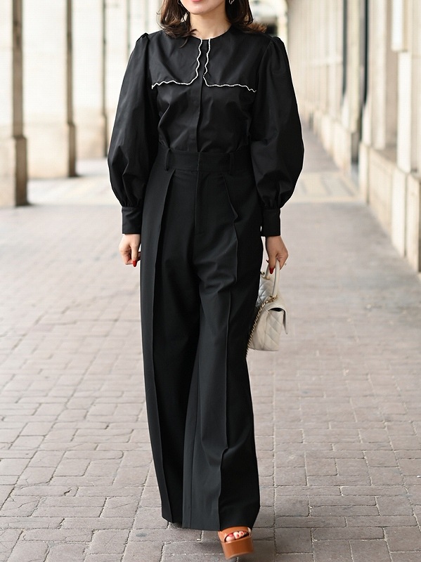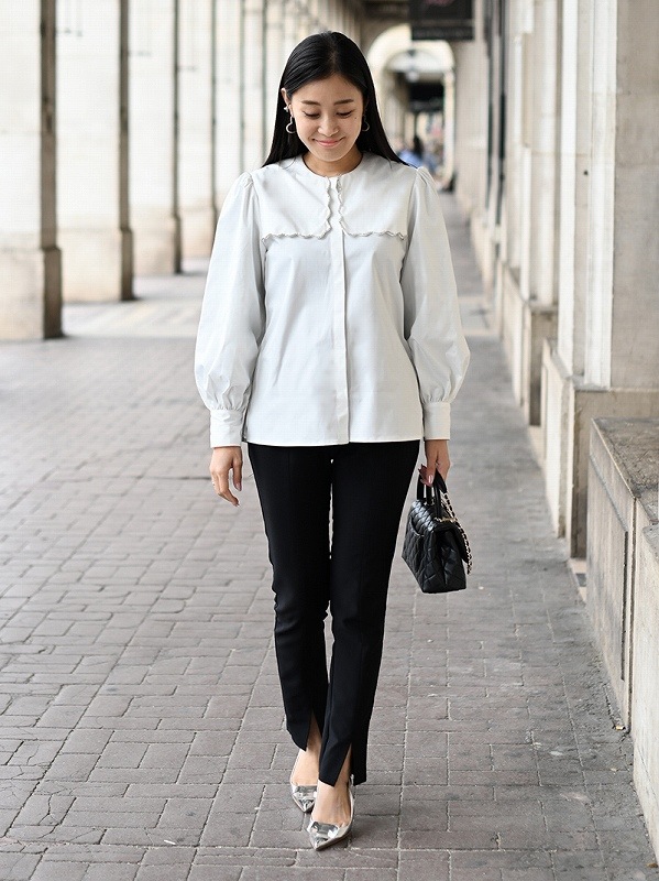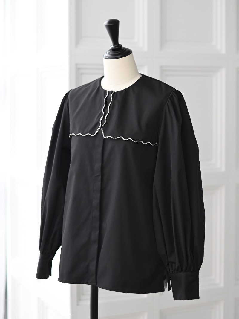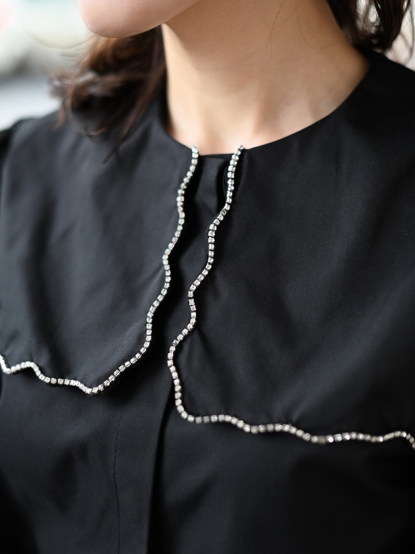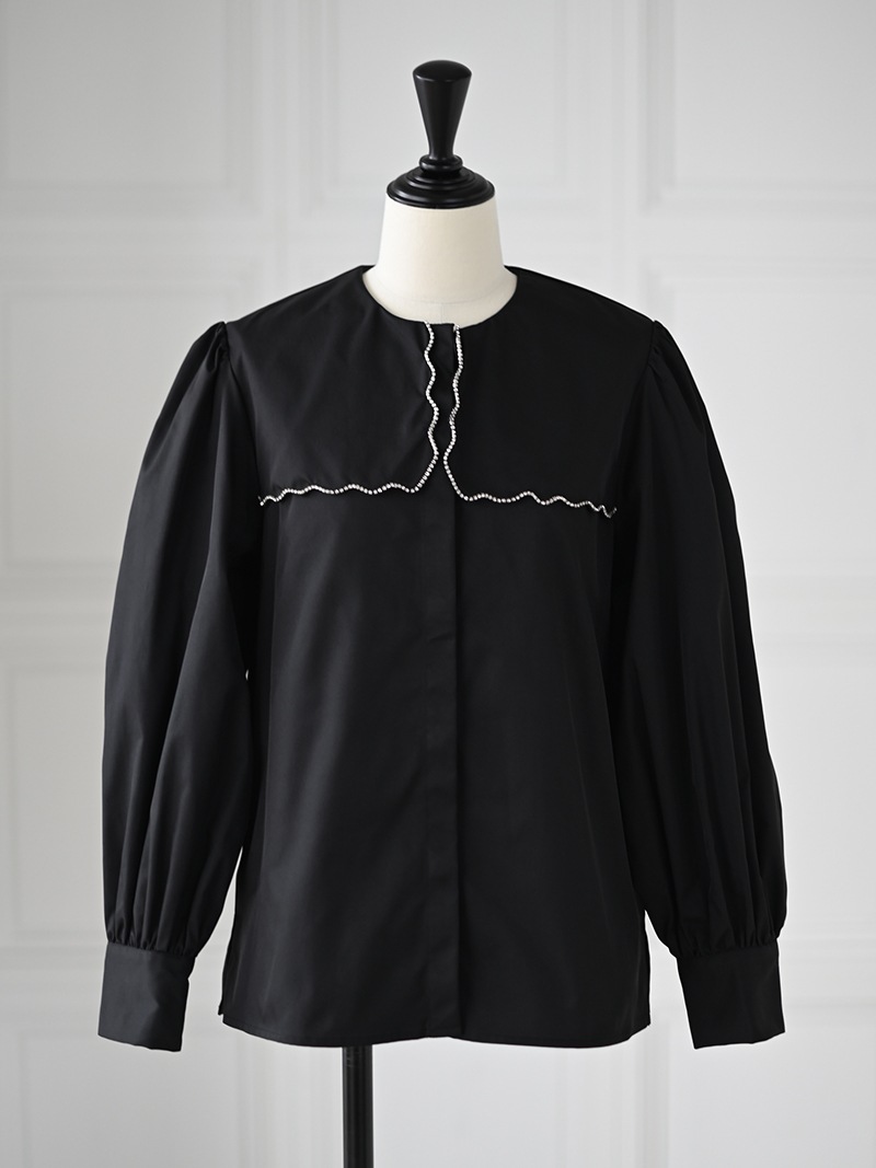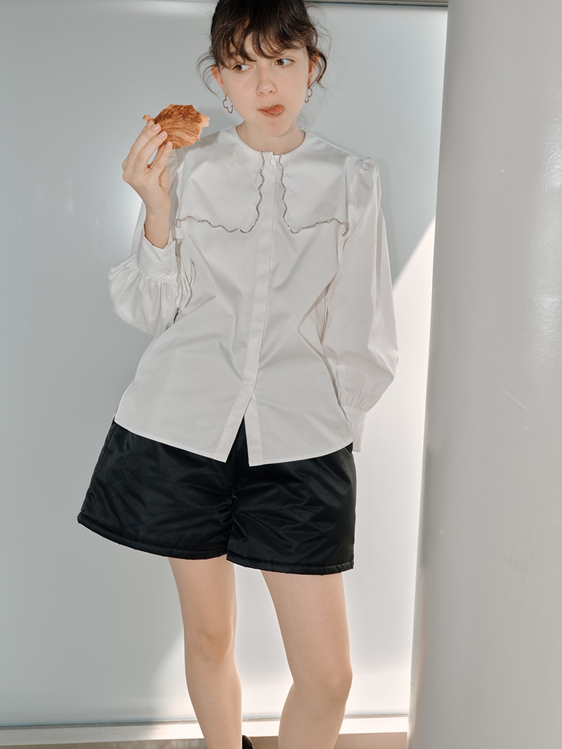 一点一点敷き詰めたスカラップビジューが目を惹くブラウス。スカラップ襟はあえて取り付けにすることで甘すぎない大人っぽく上品な印象に。