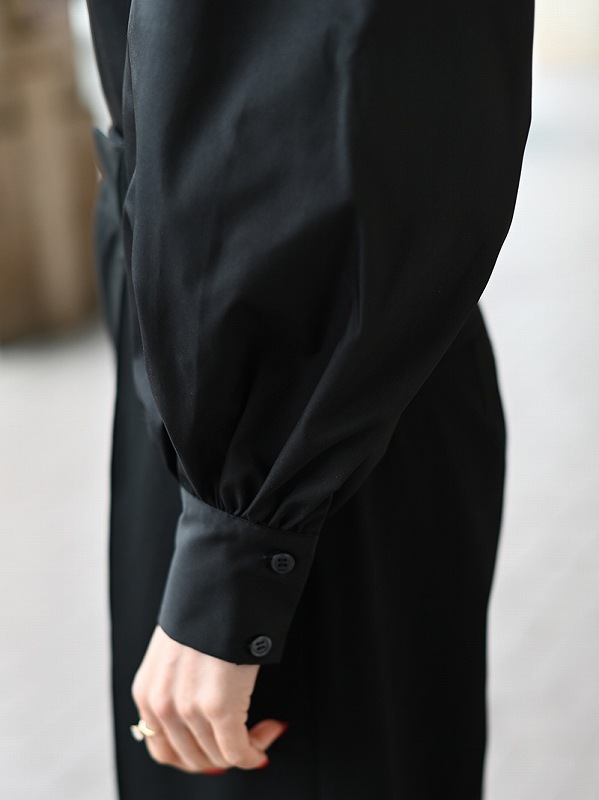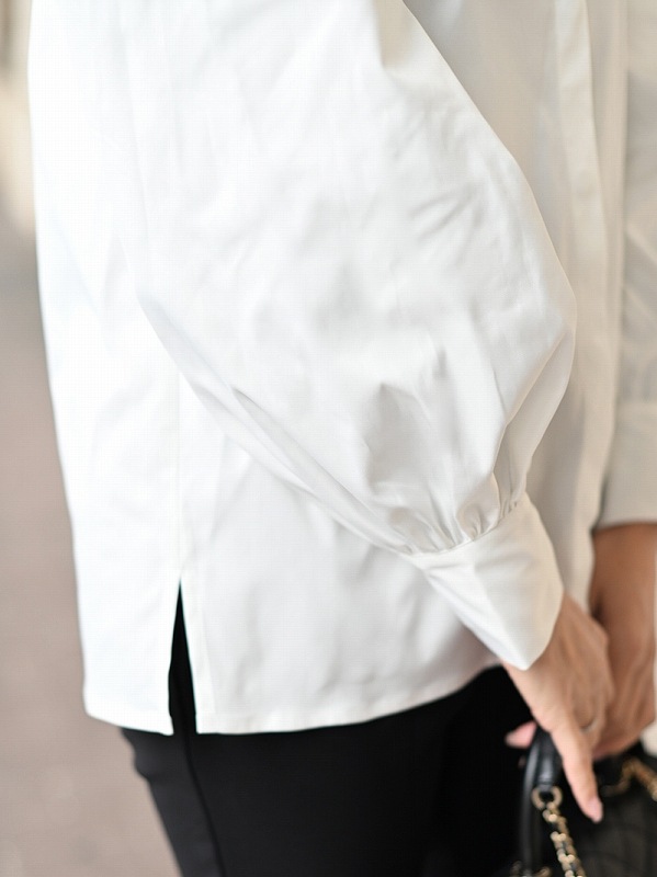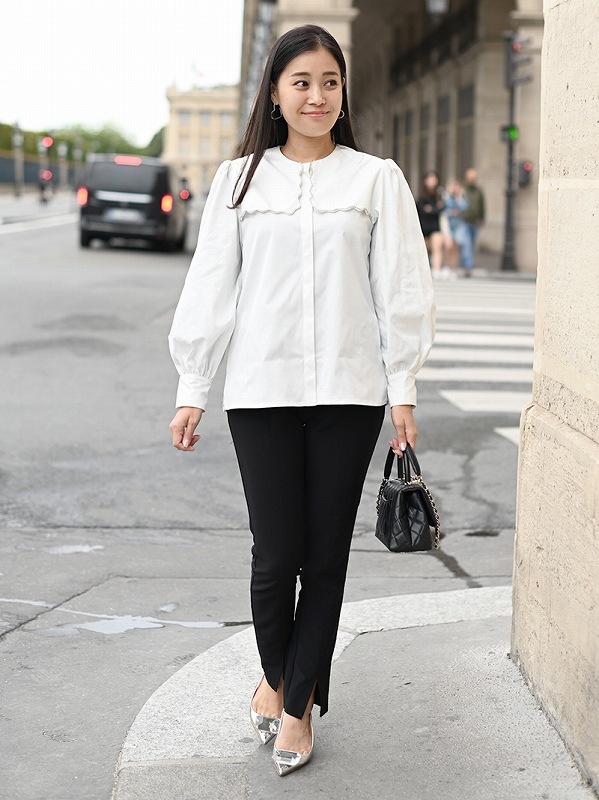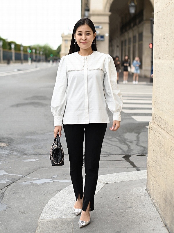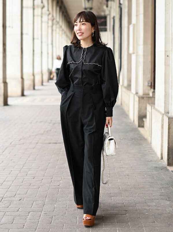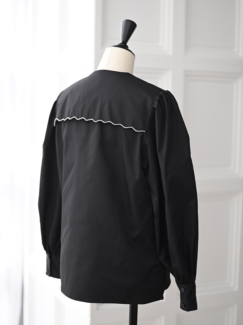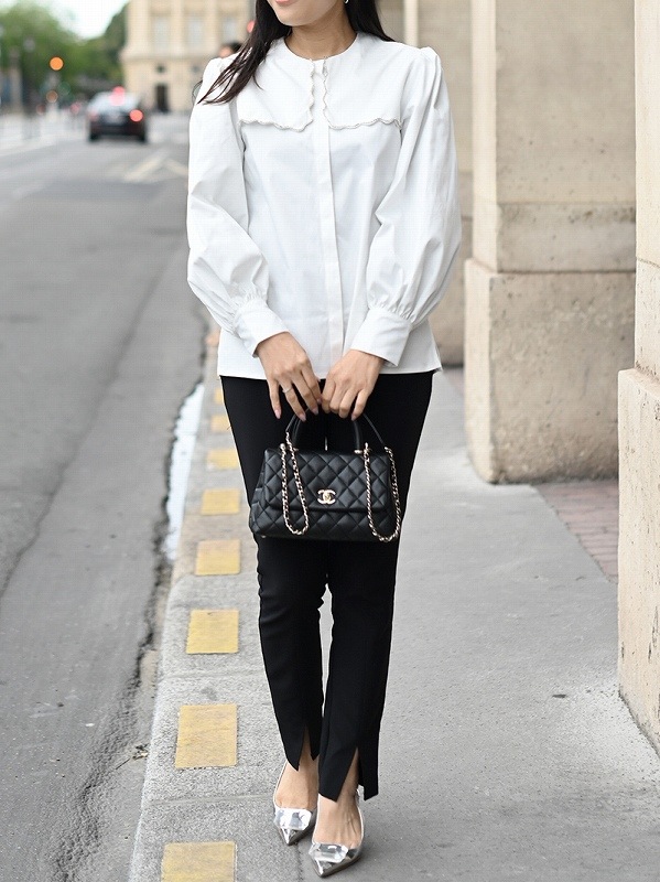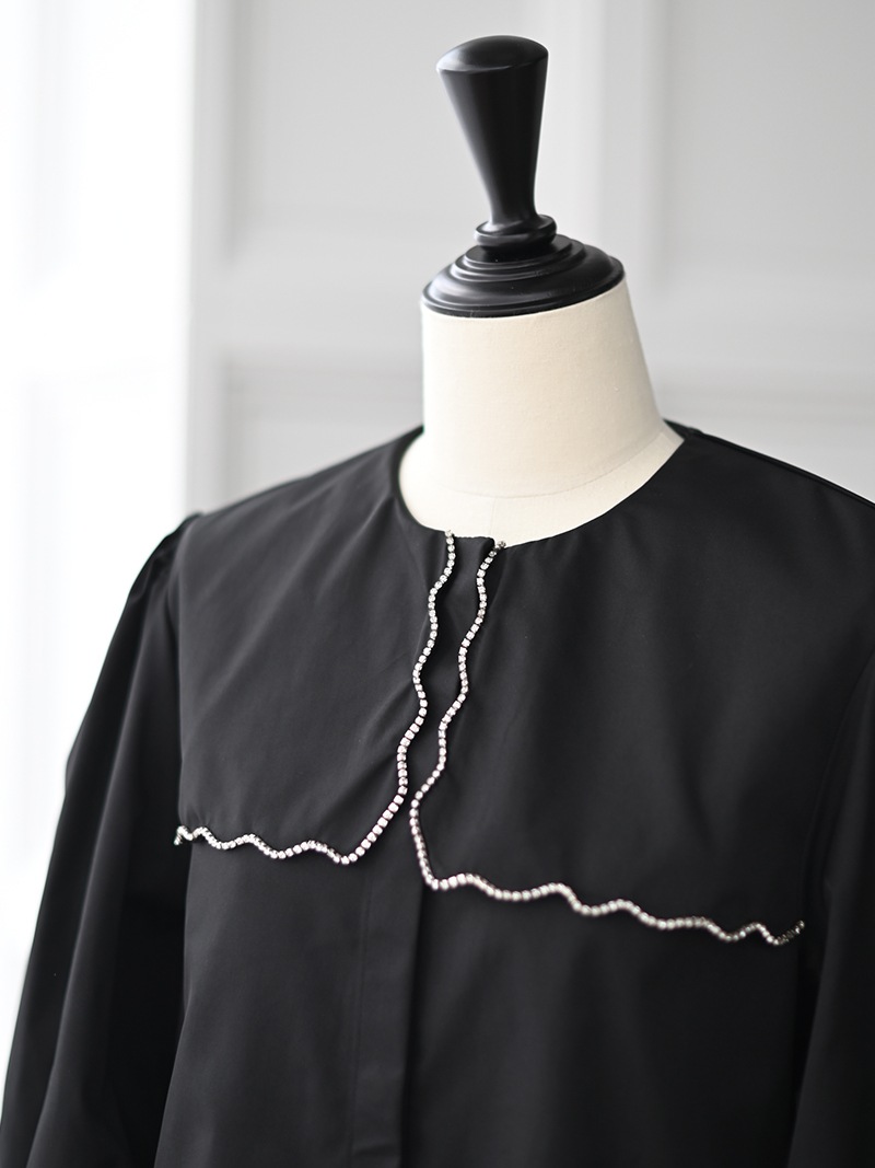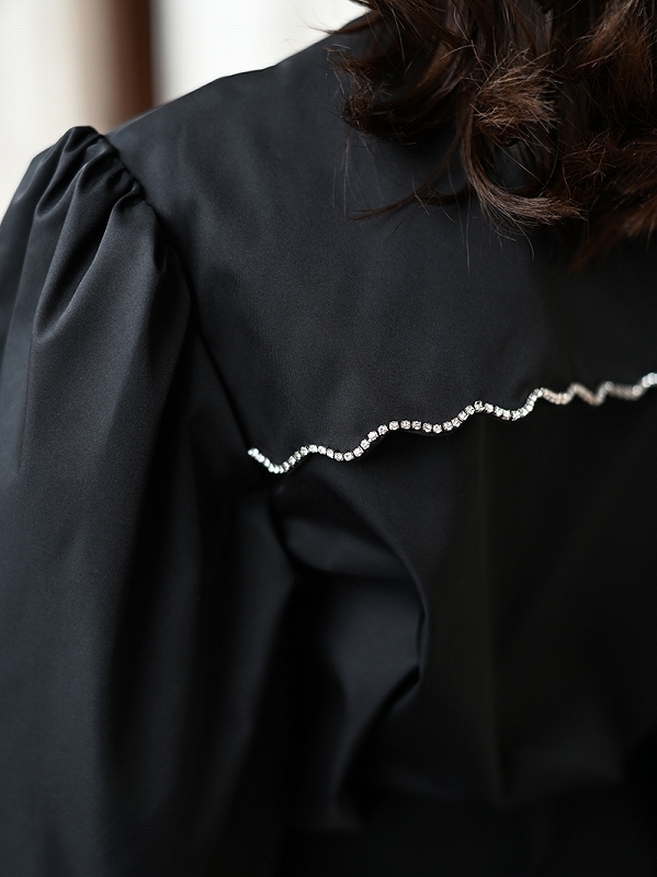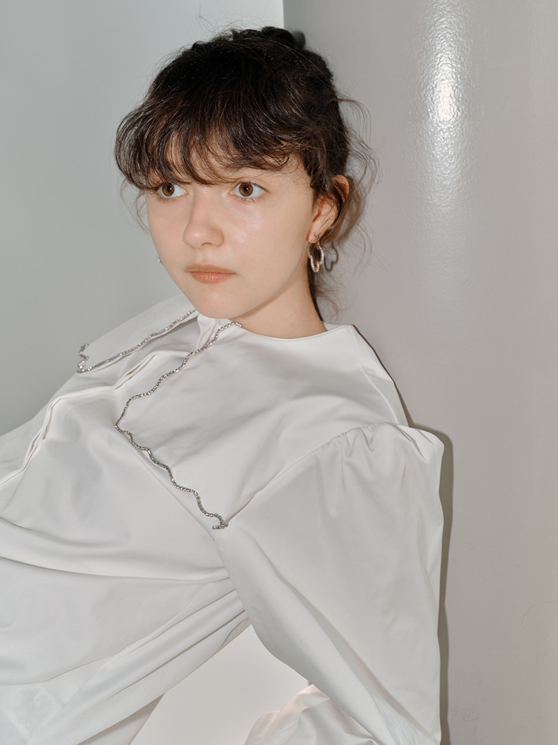 一点一点敷き詰めたスカラップビジューが目を惹くブラウス。スカラップ襟はあえて取り付けにすることで甘すぎない大人っぽく上品な印象に。