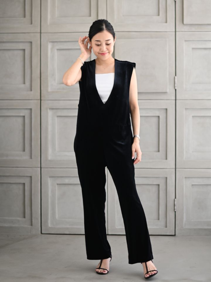 品良くモードな雰囲気の深Vネックサロペット。ハイウエスト位置の切替ラインとセンタープレスにこだわり、ワイドながらも綺麗めなシルエットに。