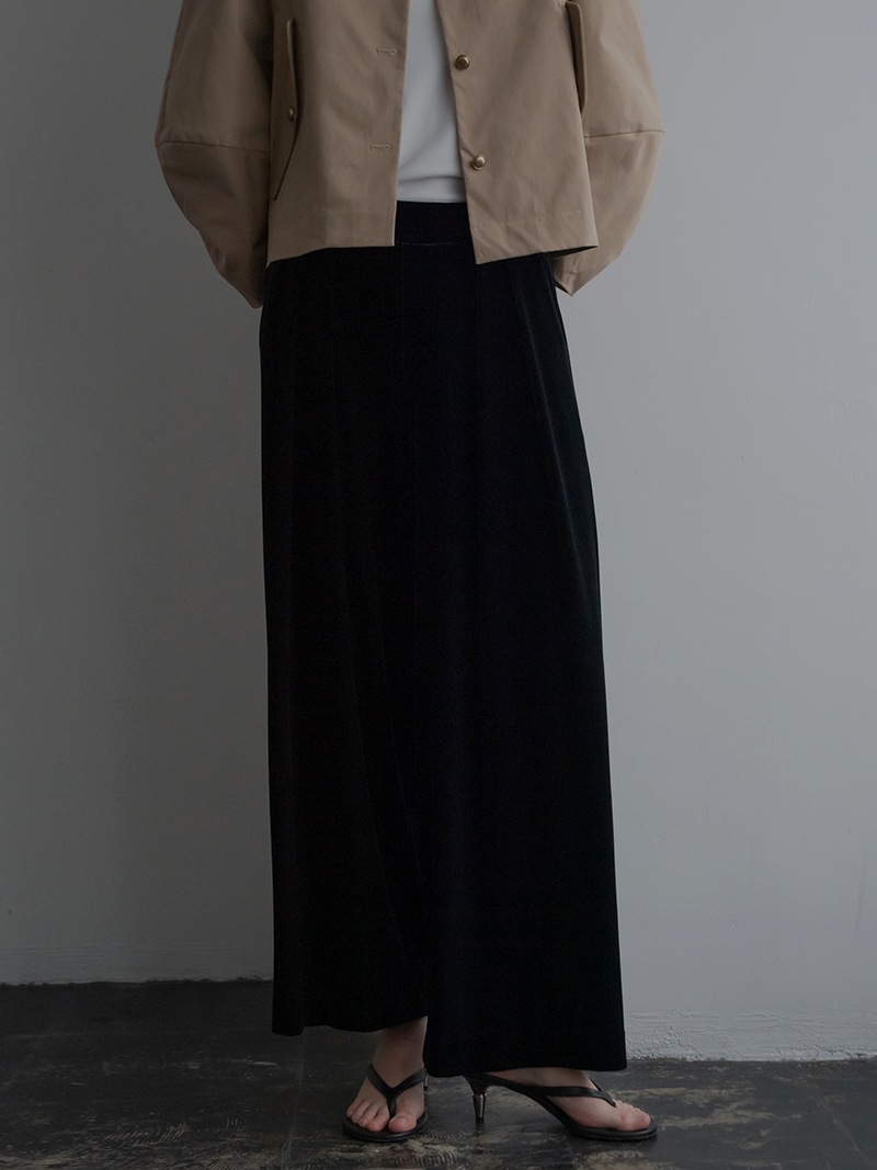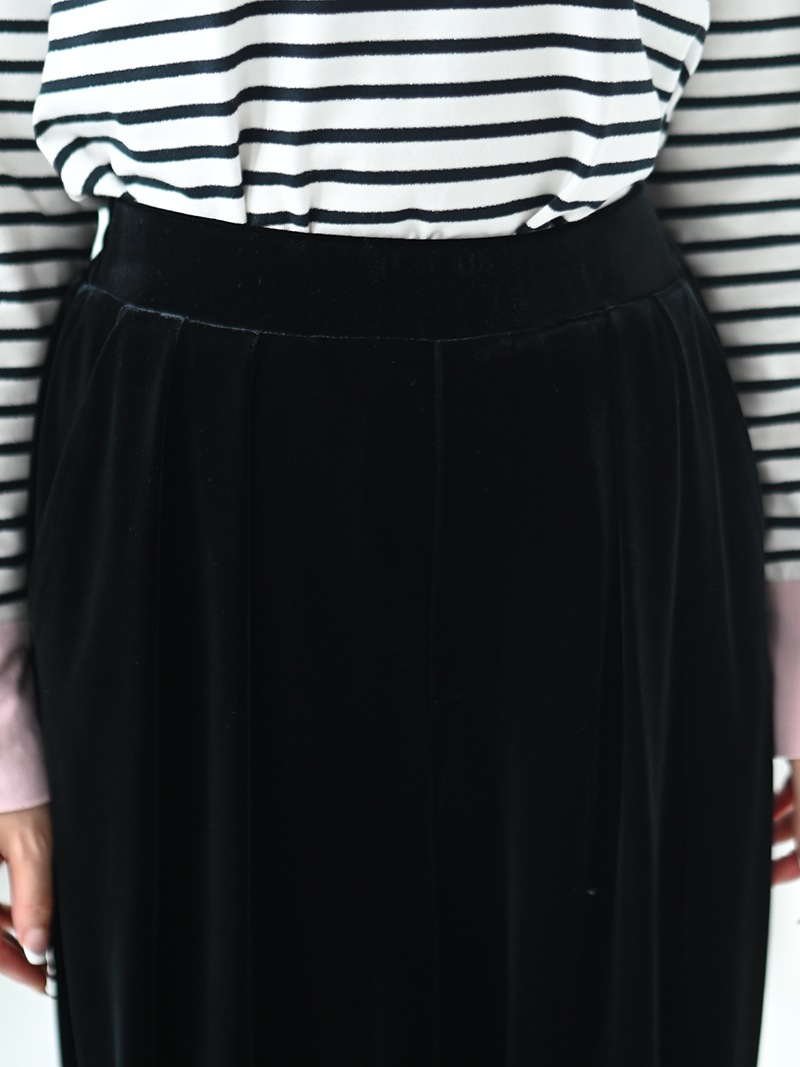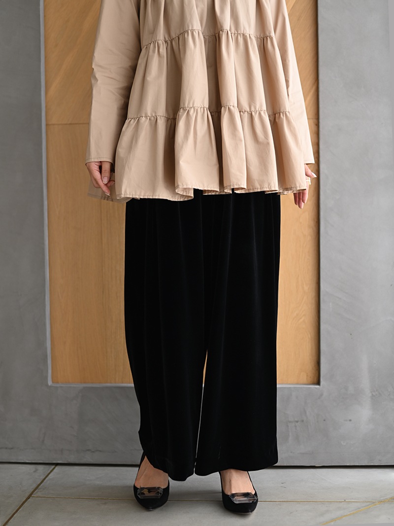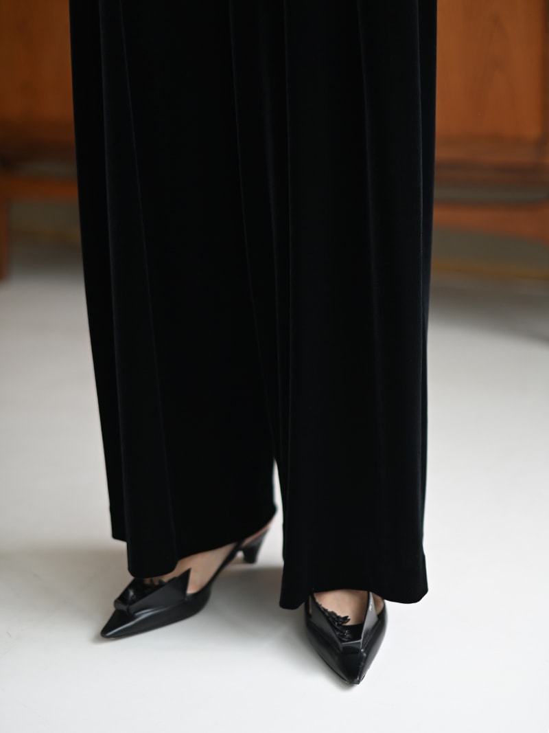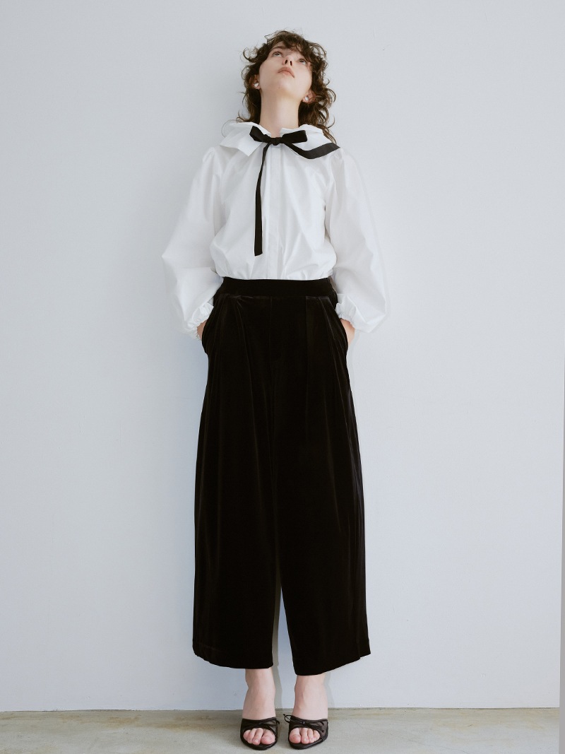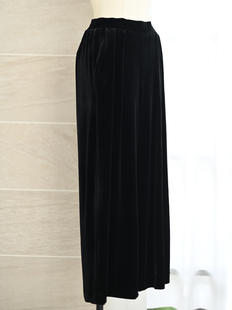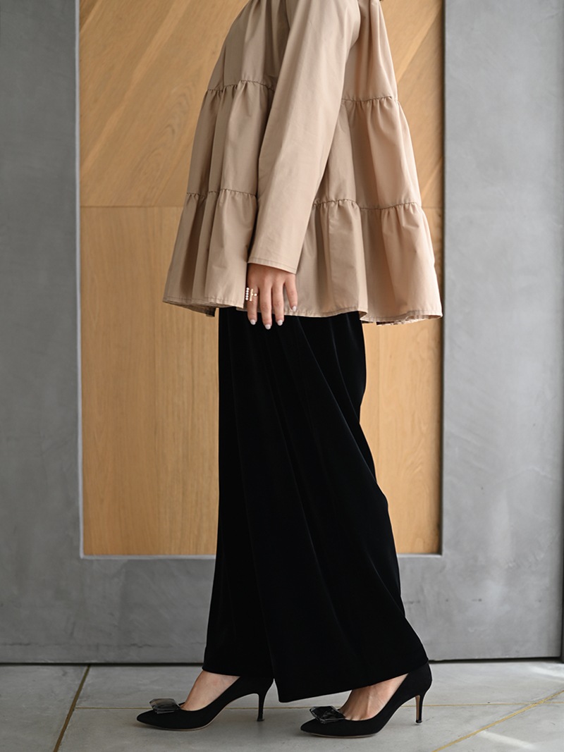 品のある光沢と落ち感があり、華やかな印象で着こなせるのはベロア素材ならでは。