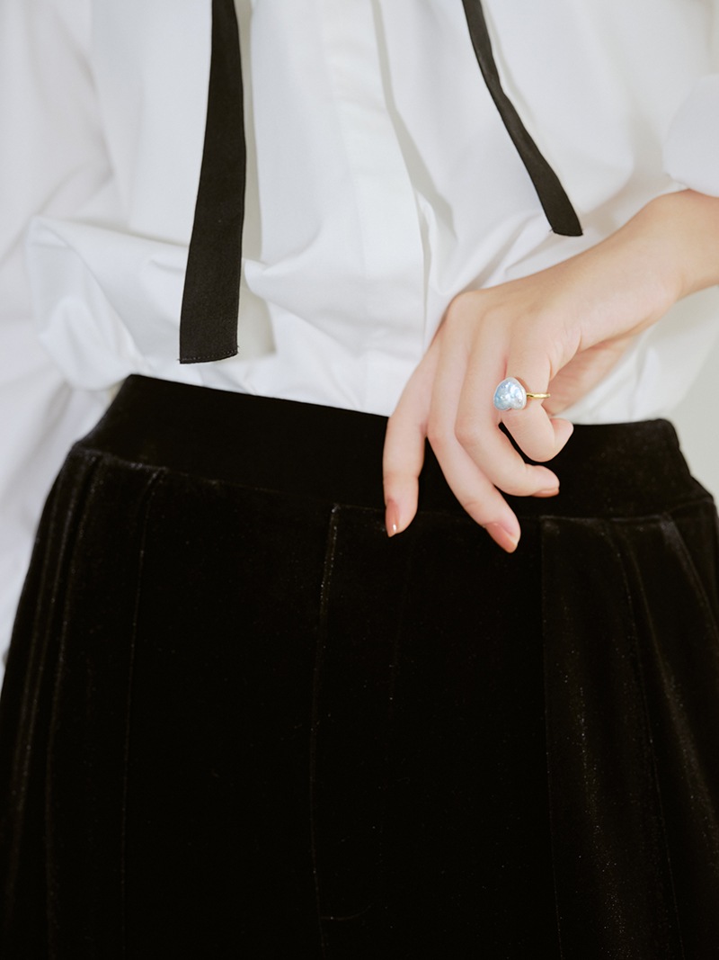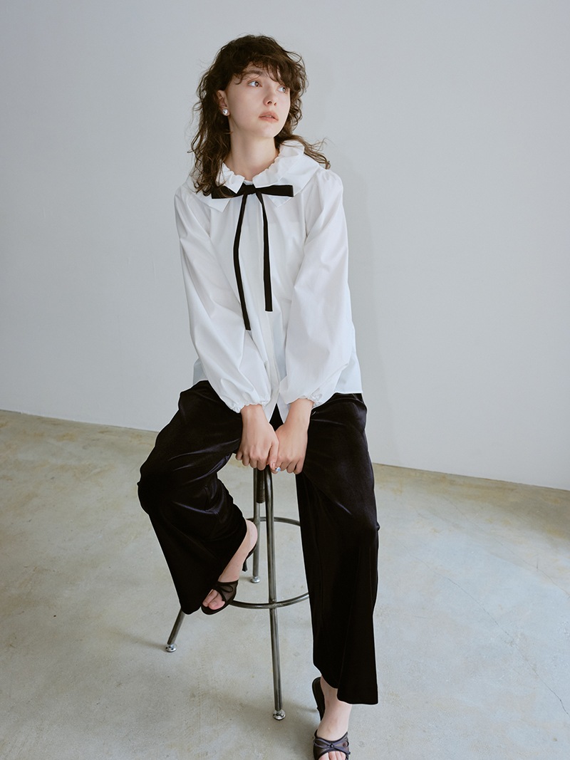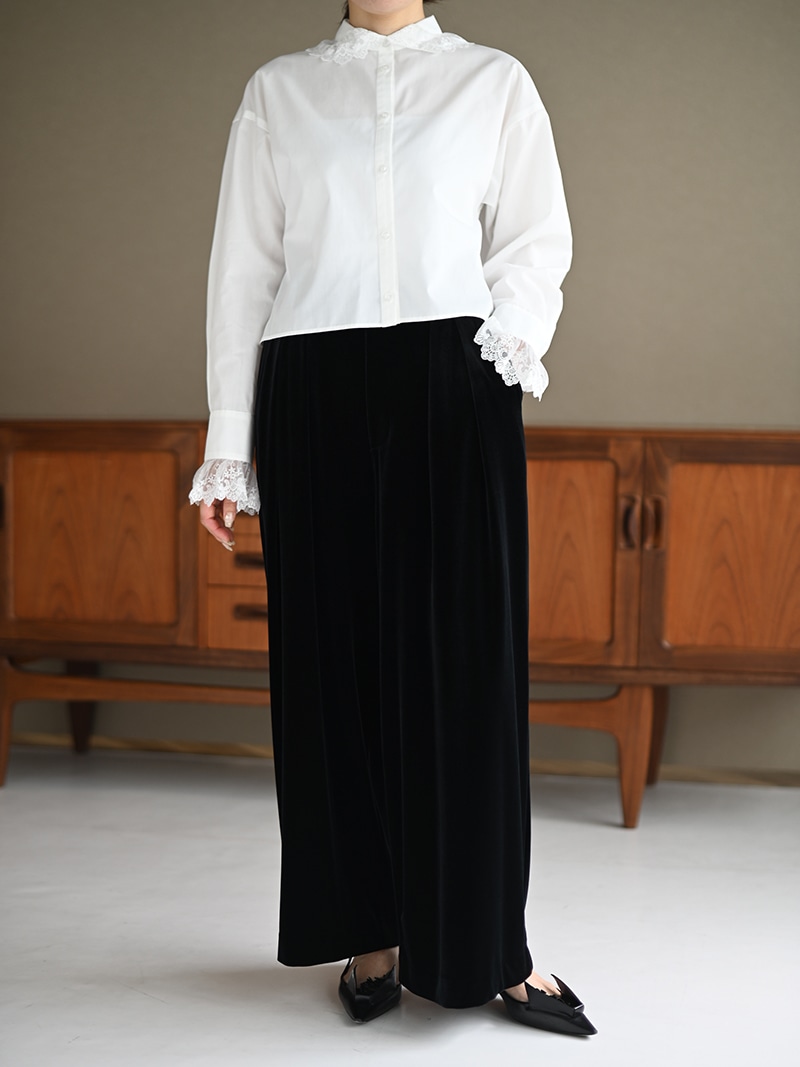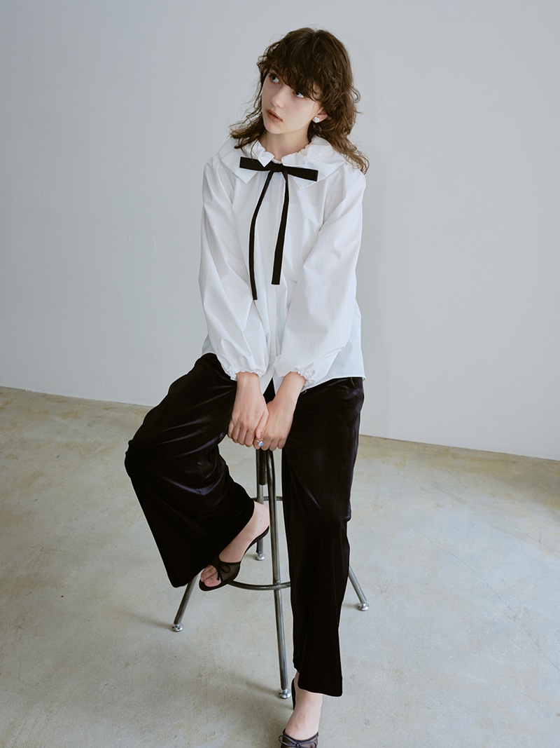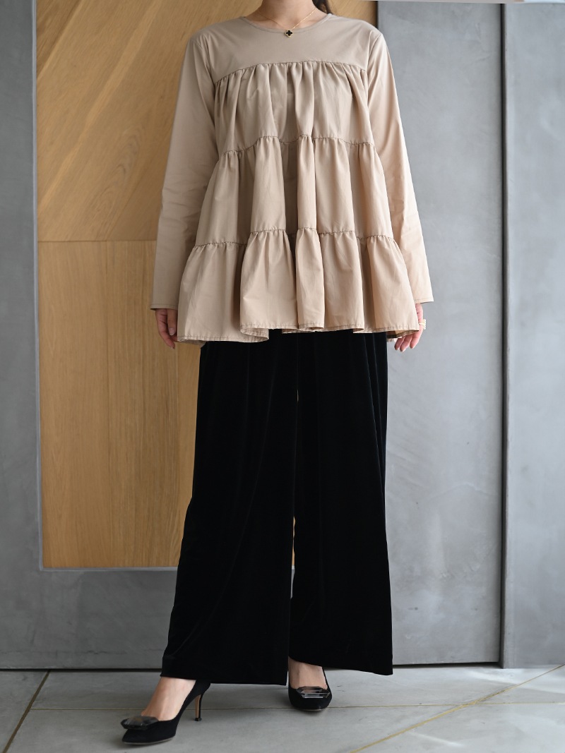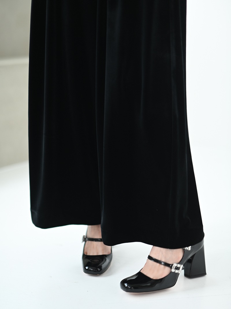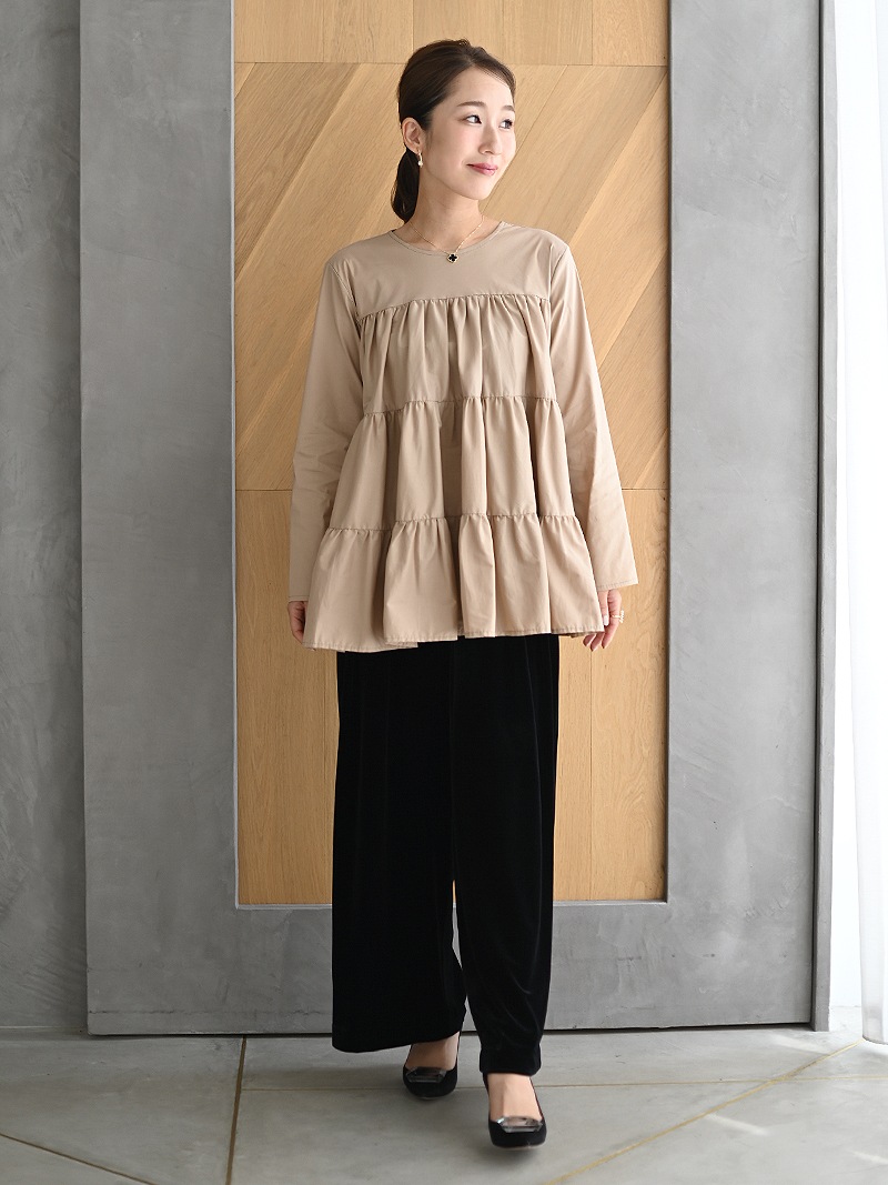 品のある光沢と落ち感があり、華やかな印象で着こなせるのはベロア素材ならでは。