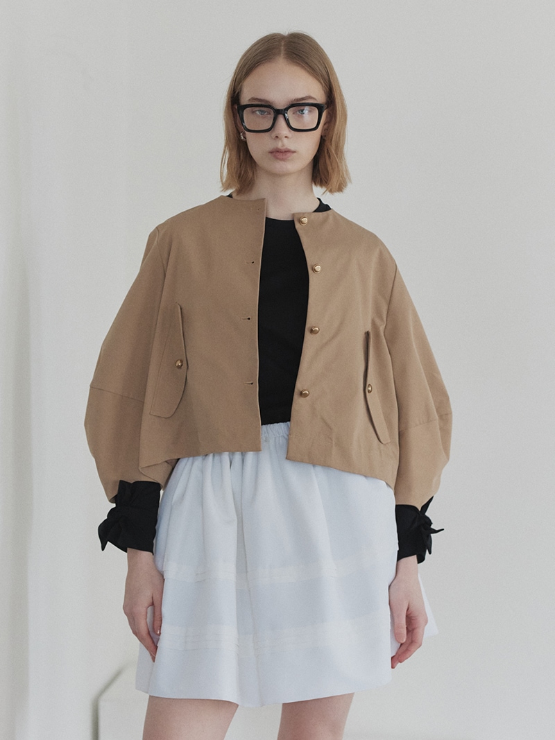 ふくらみのある構築的なスリーブと分量をたっぷり使用したバックプリーツは羽織るだけで映える一枚。ハリがありながら軽量、今年らしいチノ素材を選定。