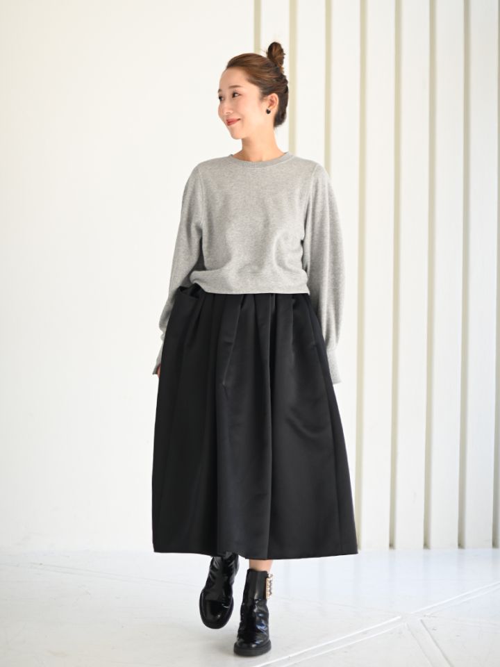 今の時期から着用できるように薄手の裏毛生地を選定。カジュアルにもキレイめにもスタイリングを選ばない万能トップスです。