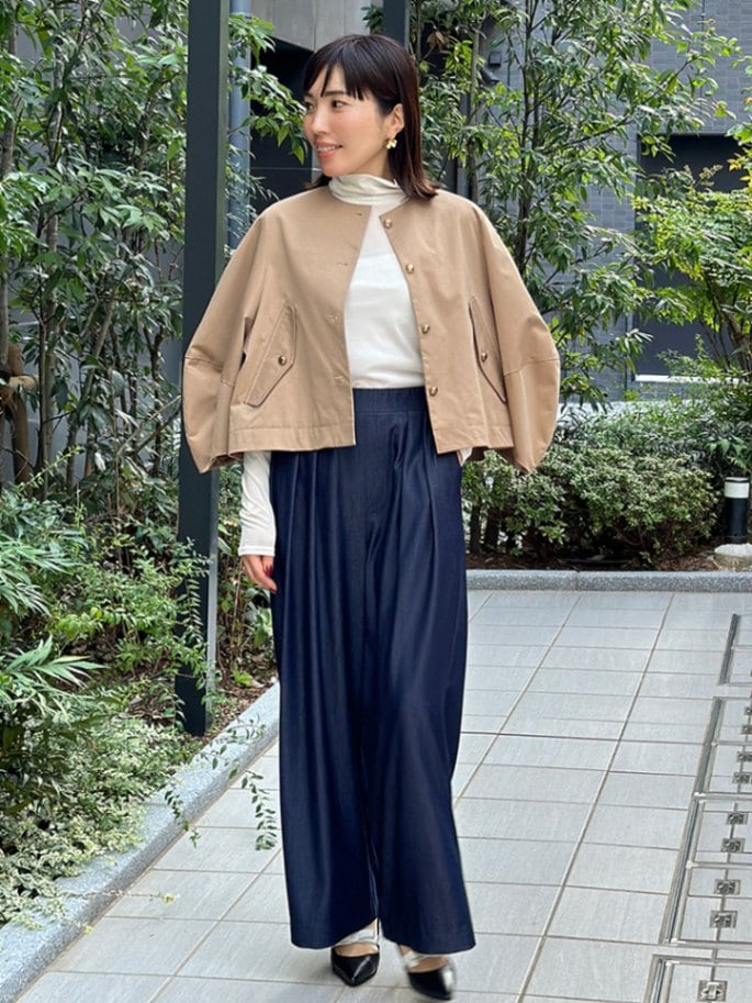 程よく体にフィットするコンパクトなシルエットと長めにとったスリーブで細見え効果も。