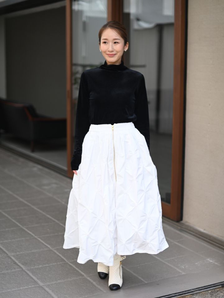 品のあるベロアの光沢感で一枚で着映えするカットソー。ベロアの中でもハリのある生地を選定しているので、くたっとなりがちなタートル部分もキレイめに仕上がります。