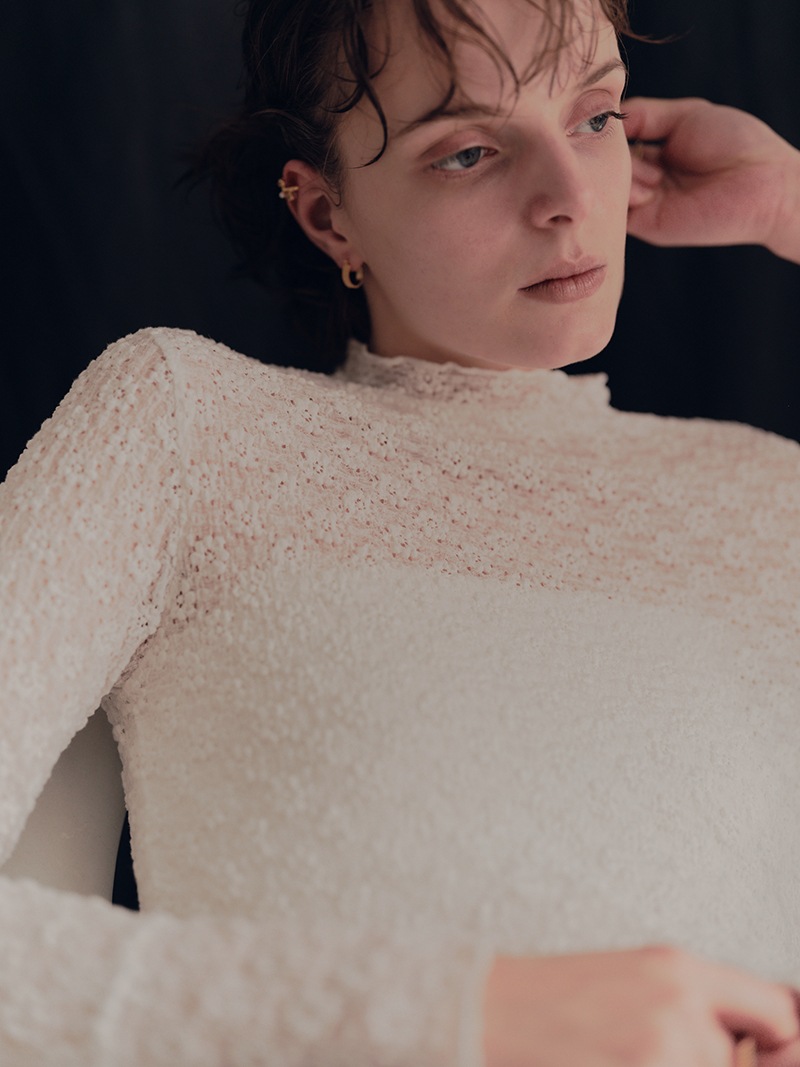 フラワーデザインのシャーリングレーストップス。タイト過ぎない程良いサイズ感に設定することで、一枚着はもちろんのことジレやワンピースとのレイヤードスタイルをお楽しみいただけます。