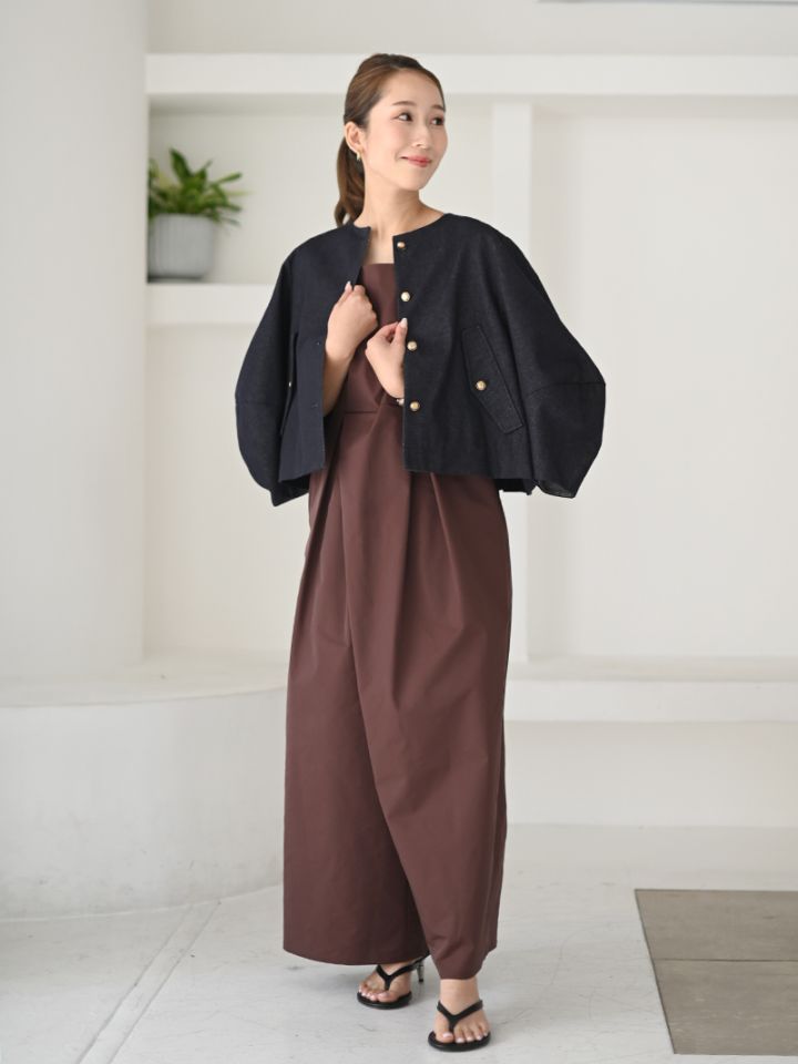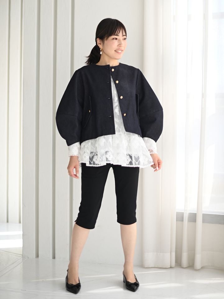 ショート丈ジャケットでバランスがとりやすく幅広いボトムスと合わせていただけます。