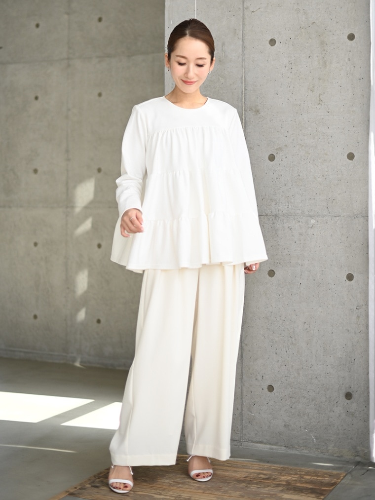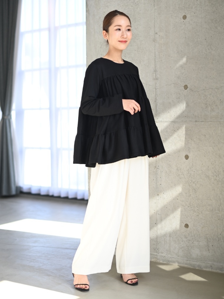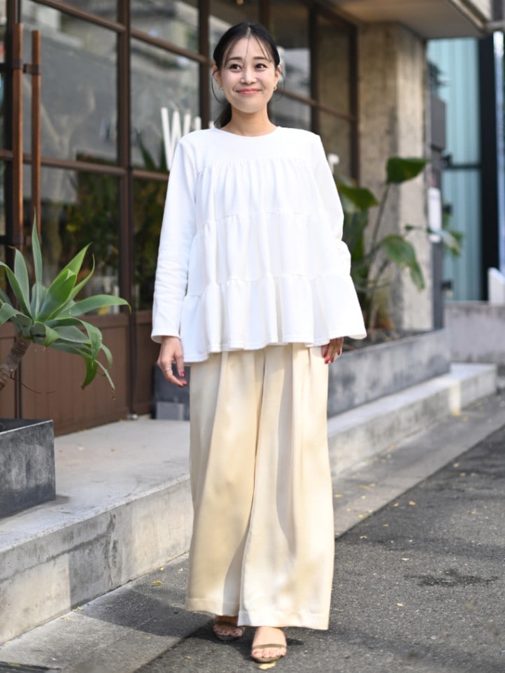 イージーな着心地ながらも贅沢に分量をとったティアードはロマンティックなシルエットで程よく甘い印象に。