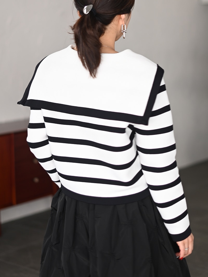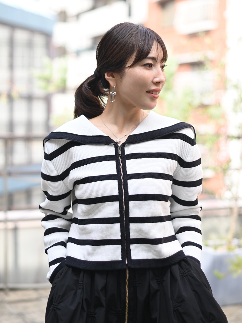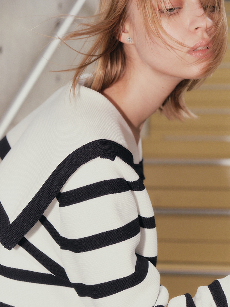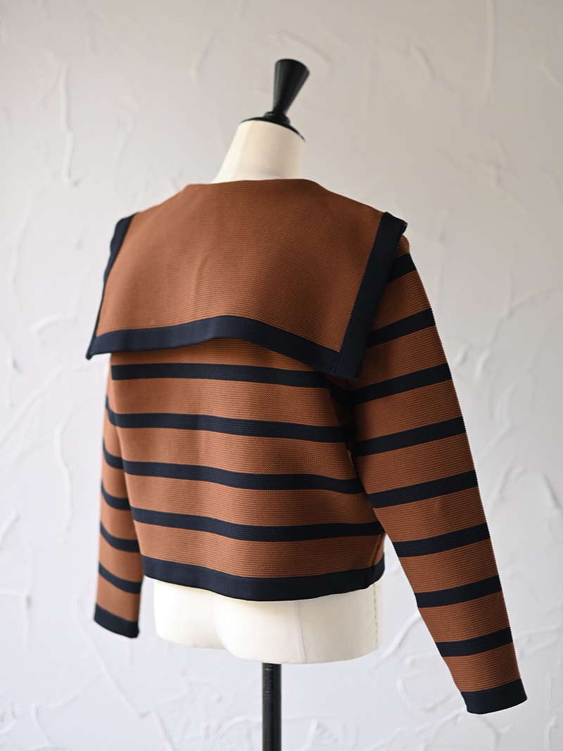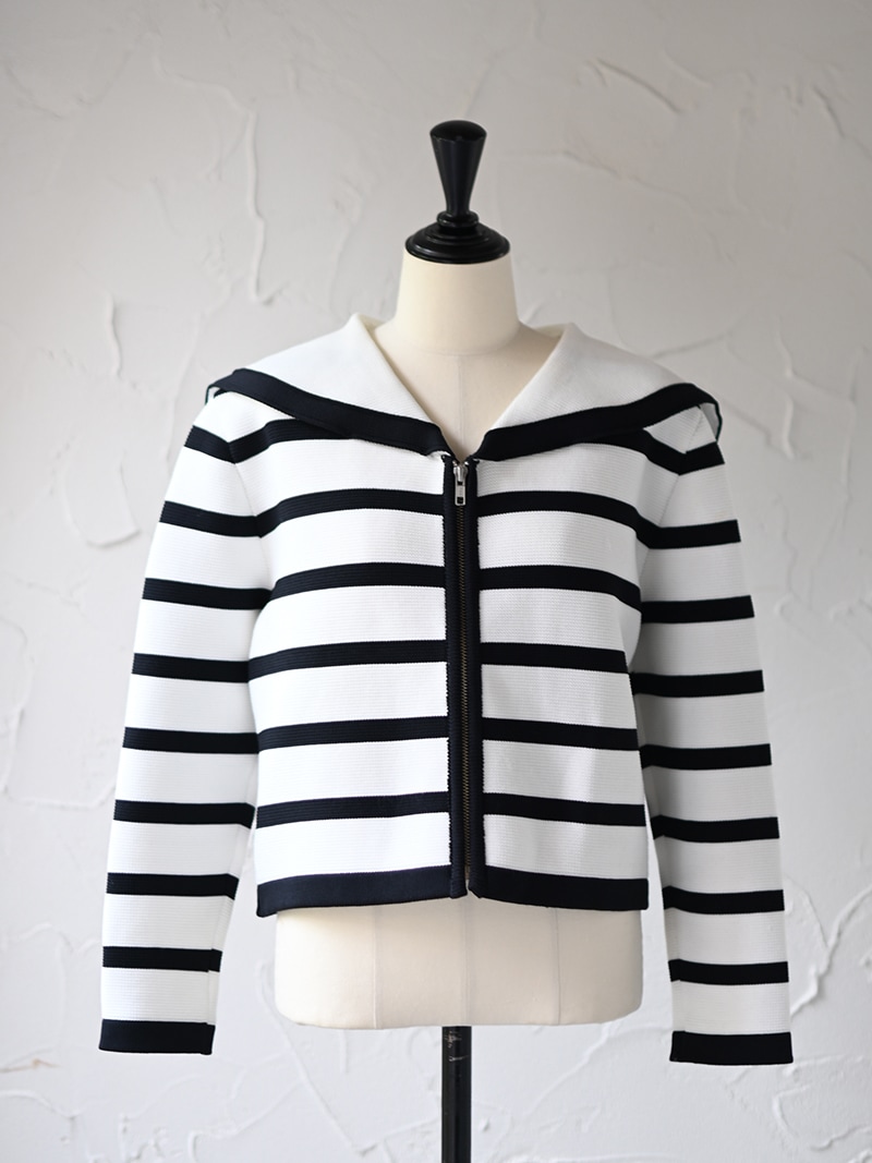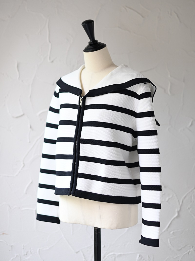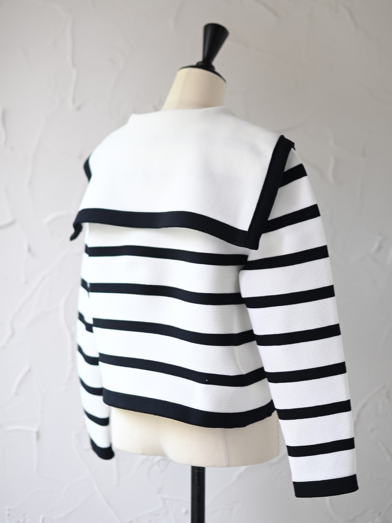 フレンチシックなセーラーカラーに立体的に編み立てたボーダーがポイント。Vネックラインですっきりとさせ、着丈はコンパクトに仕上げました。