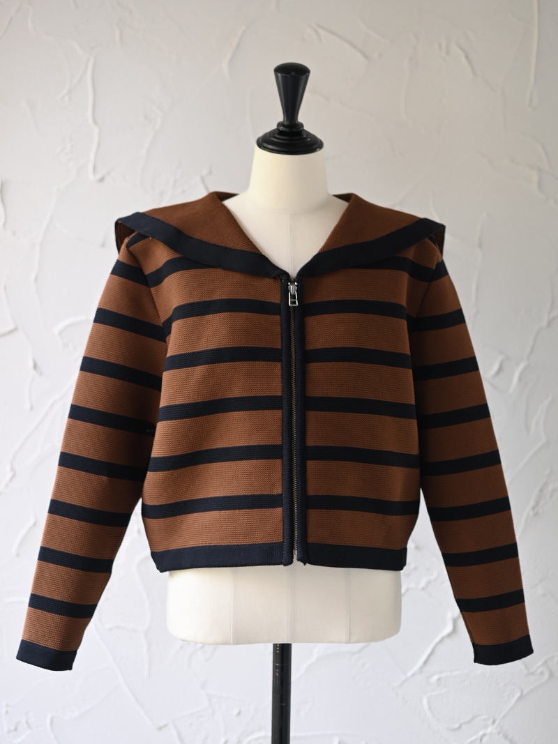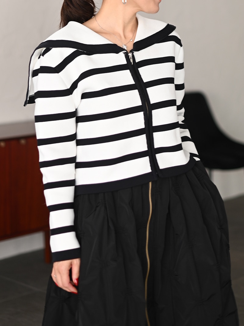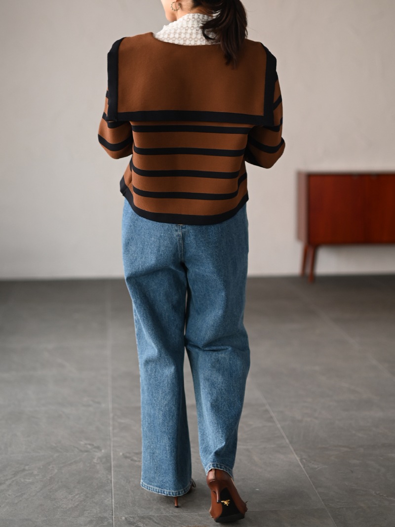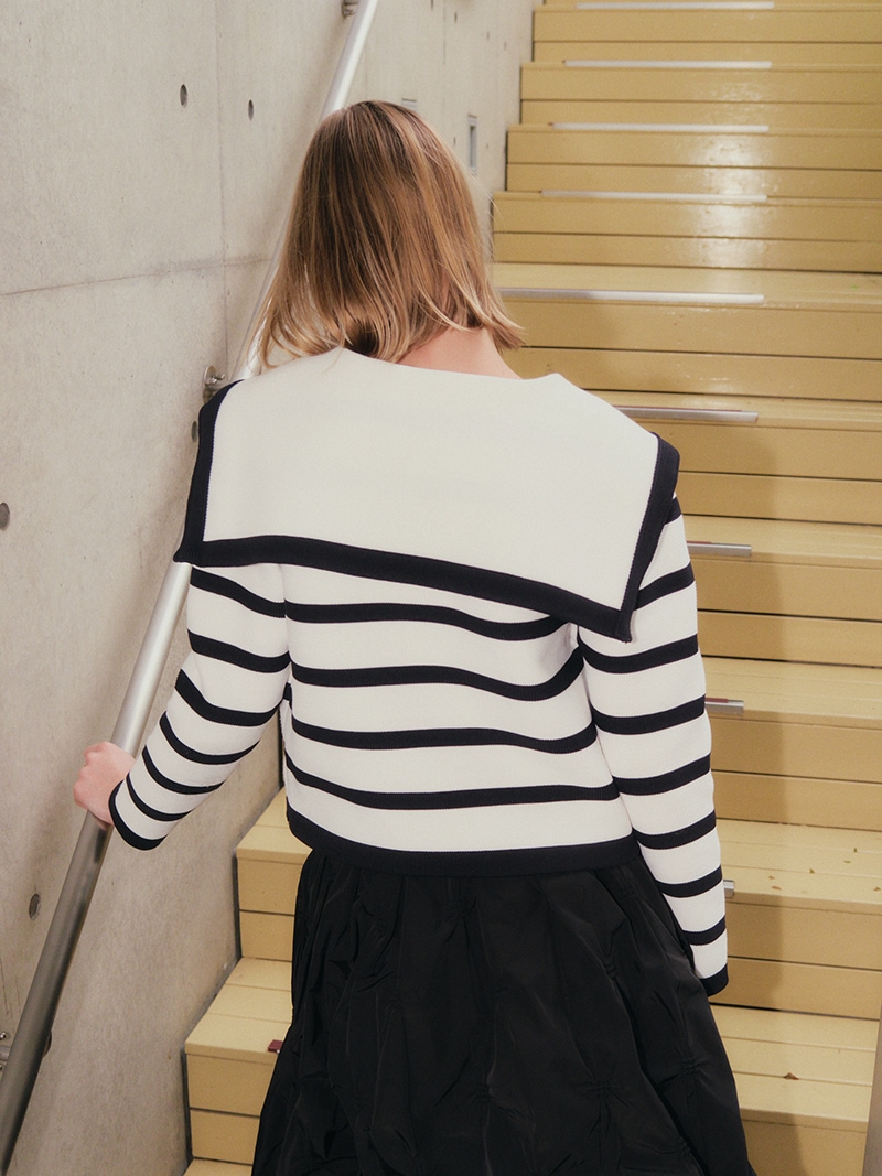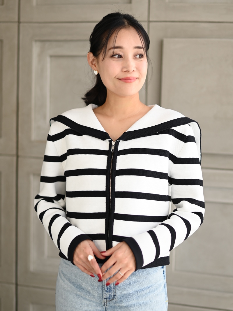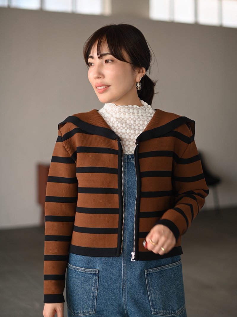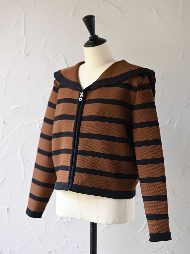 フレンチシックなセーラーカラーに立体的に編み立てたボーダーがポイント。Vネックラインですっきりとさせ、着丈はコンパクトに仕上げました。