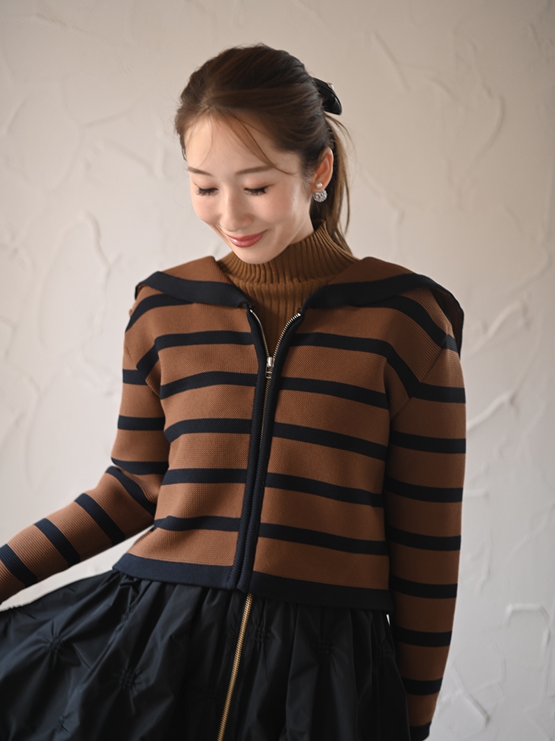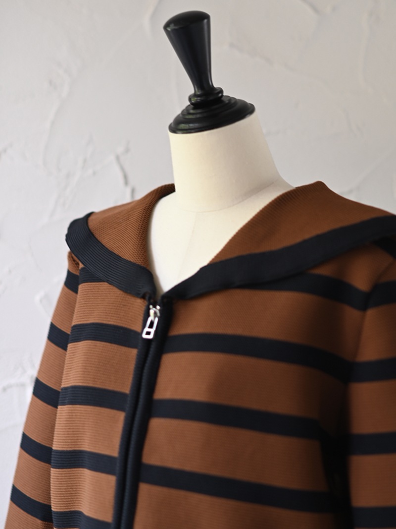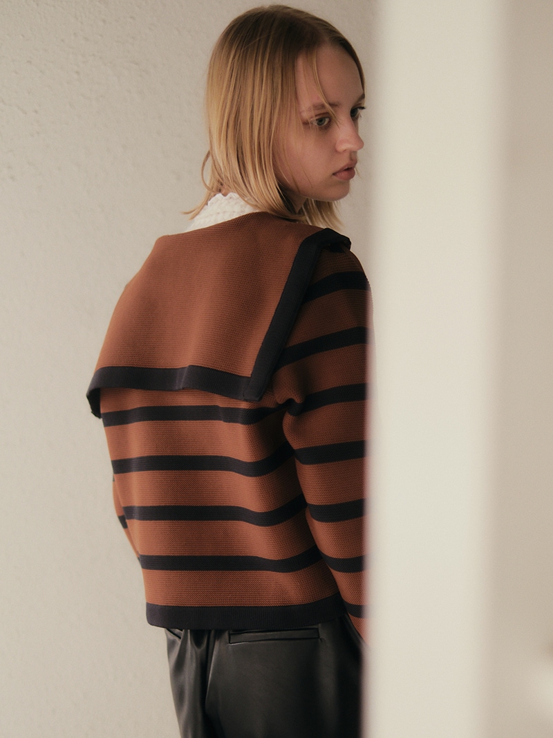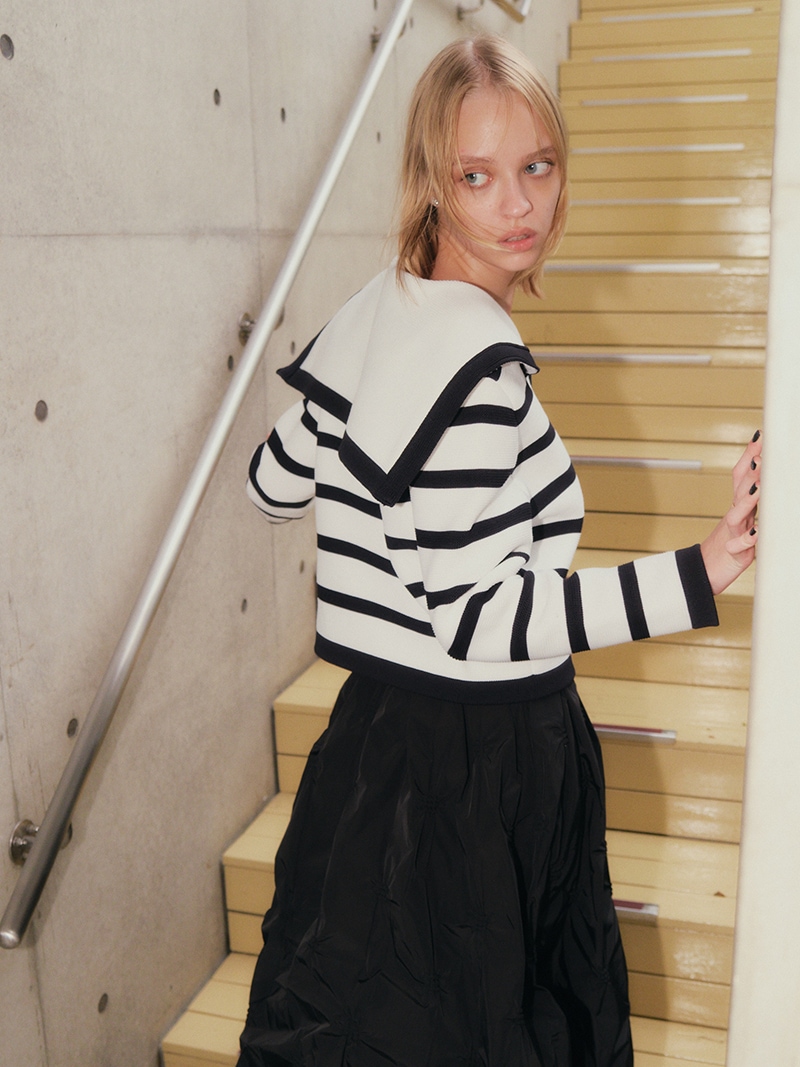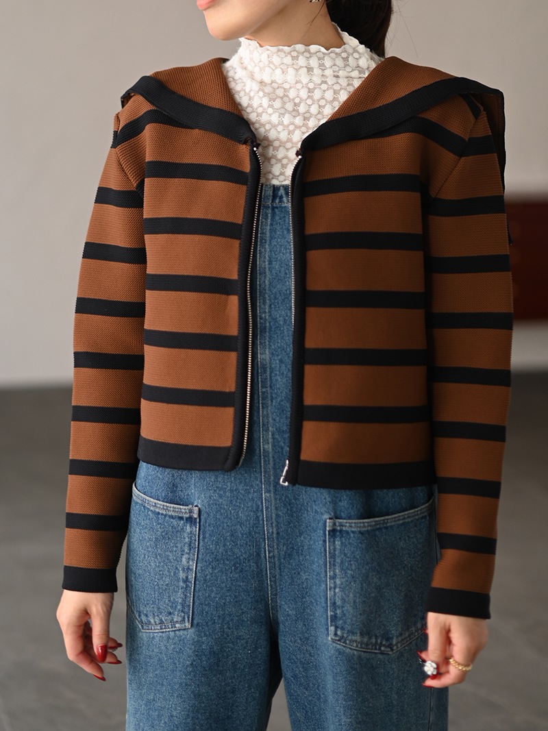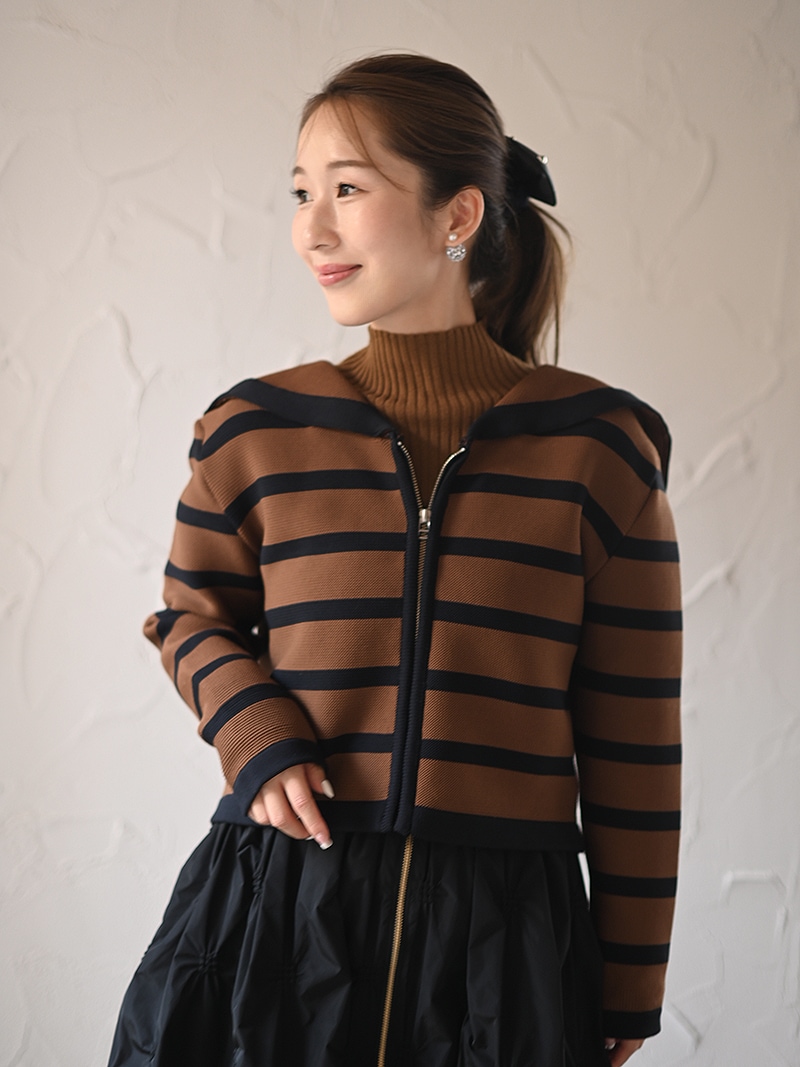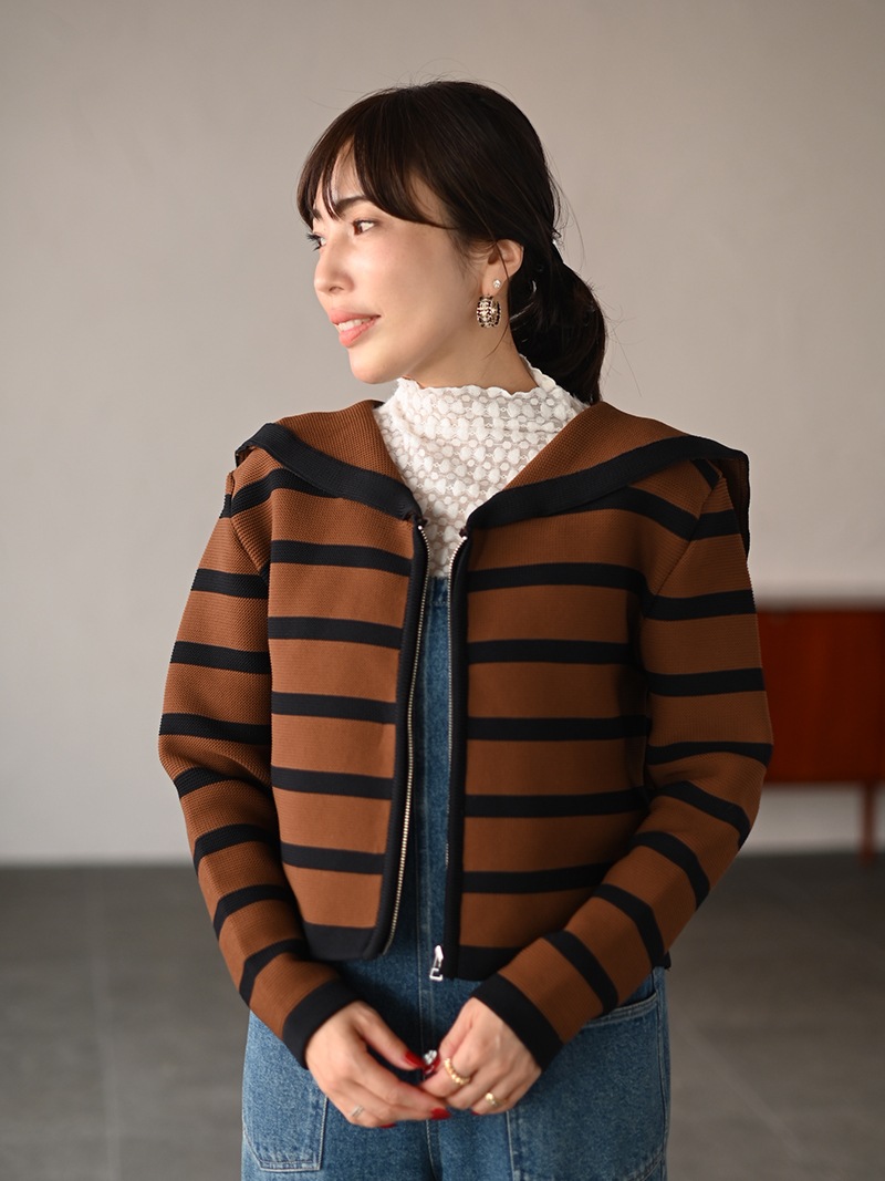 フレンチシックなセーラーカラーに立体的に編み立てたボーダーがポイント。Vネックラインですっきりとさせ、着丈はコンパクトに仕上げました。