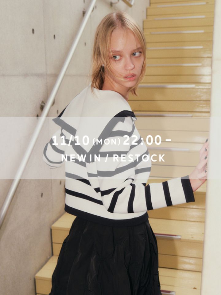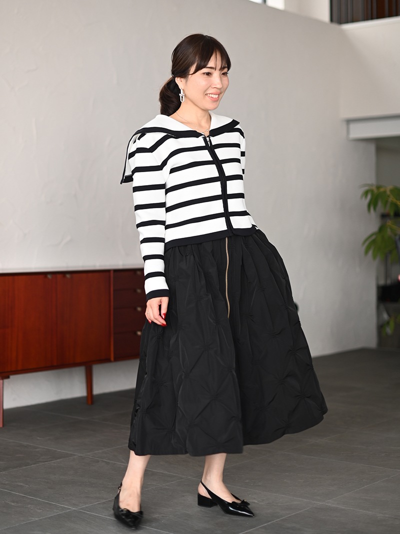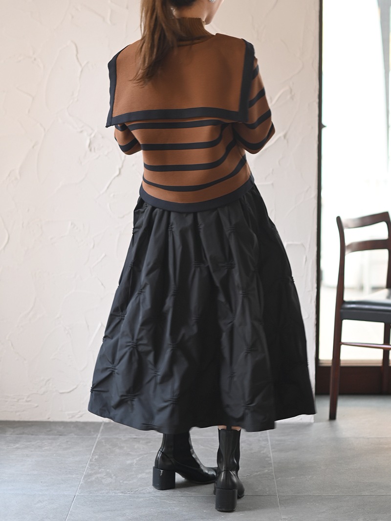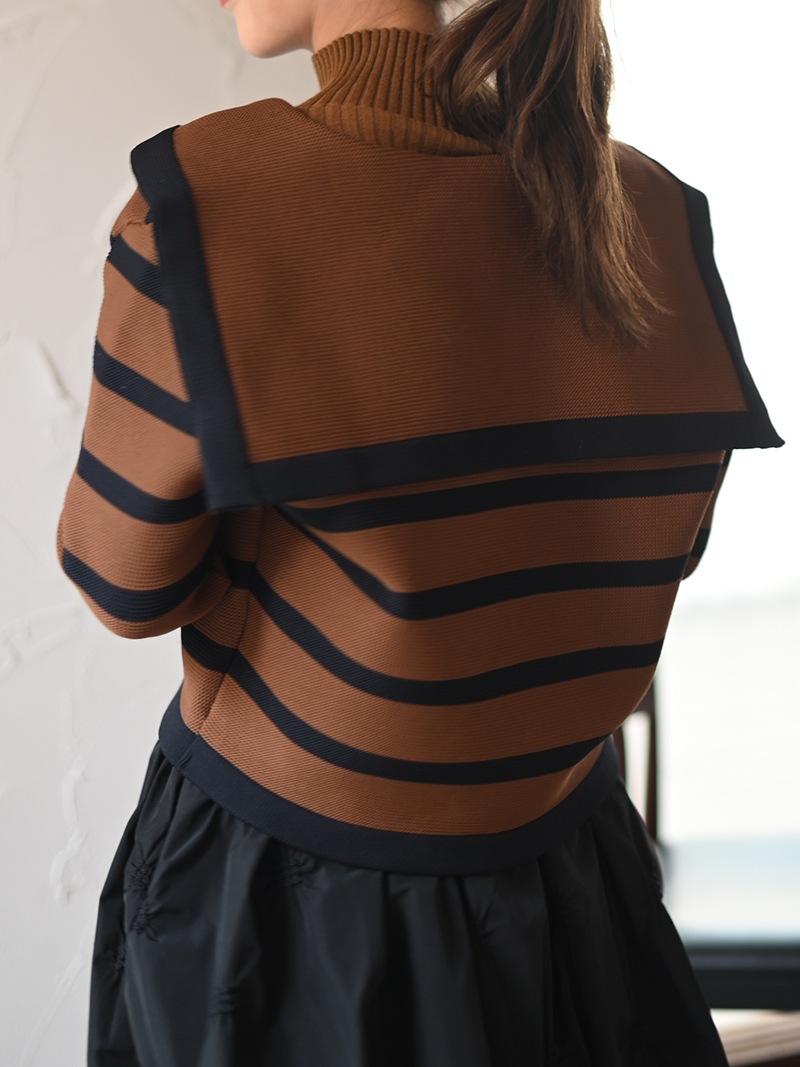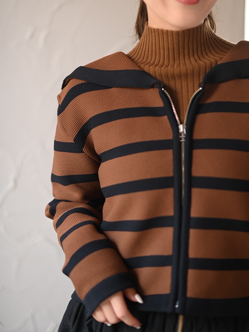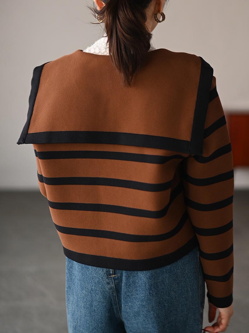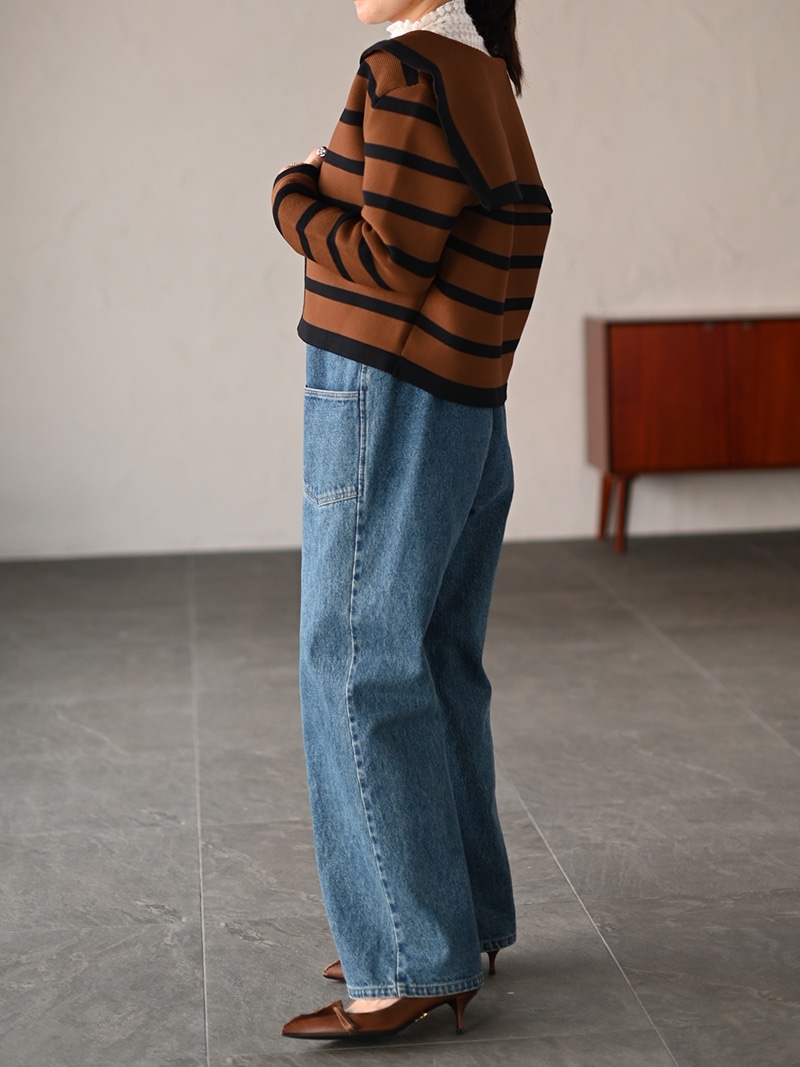フレンチシックなセーラーカラーに立体的に編み立てたボーダーがポイント。Vネックラインですっきりとさせ、着丈はコンパクトに仕上げました。