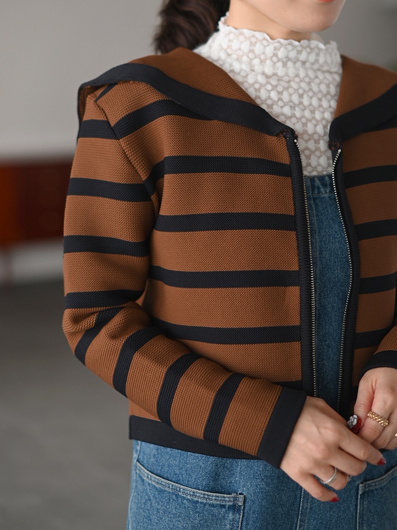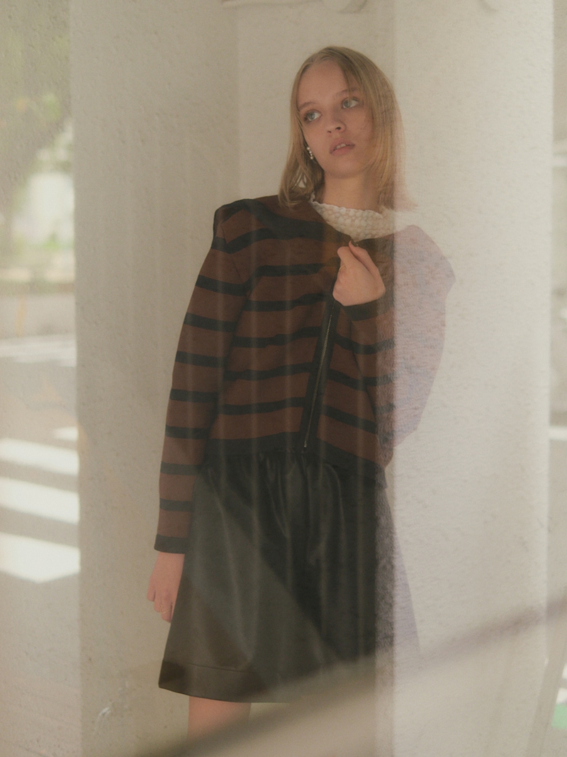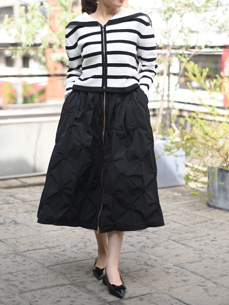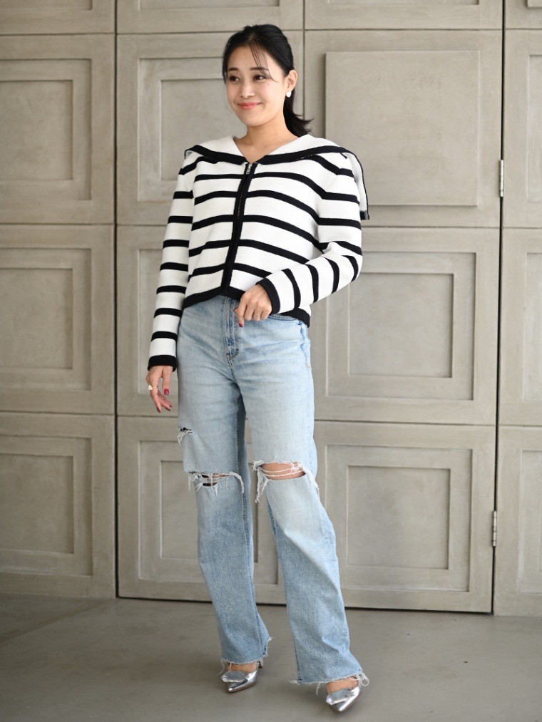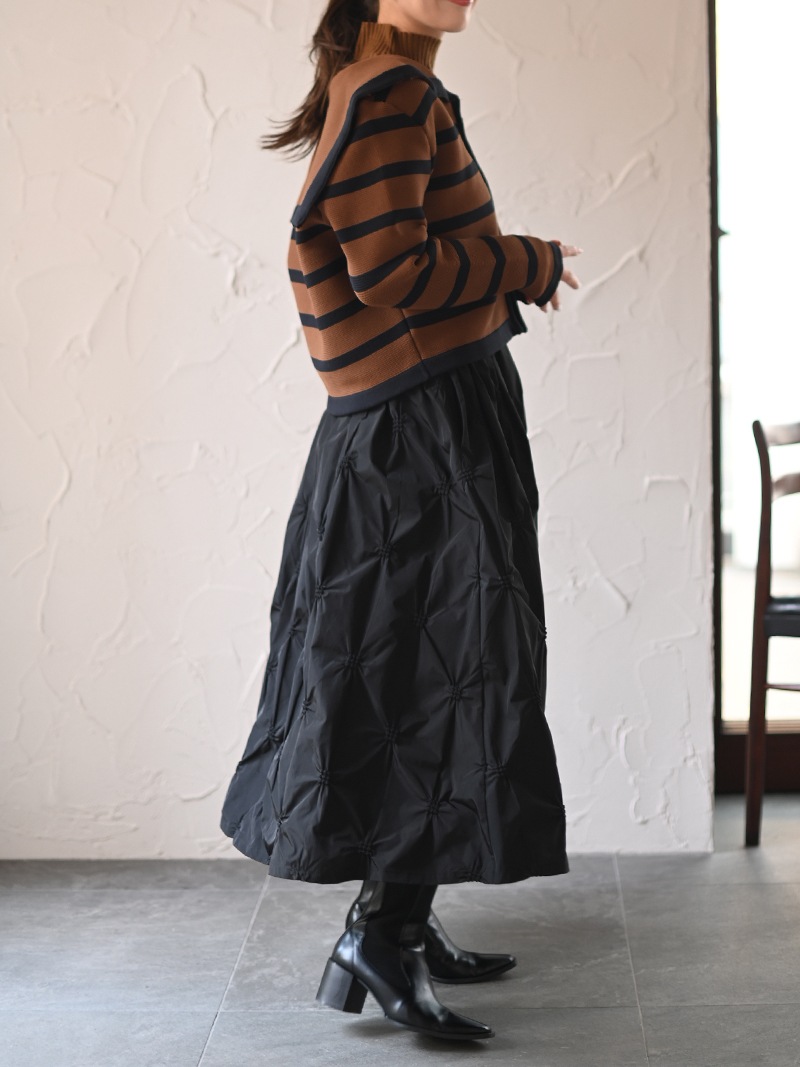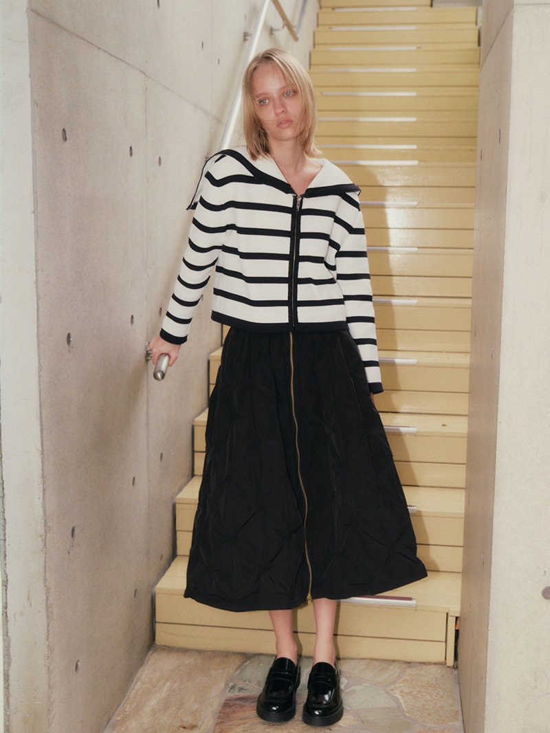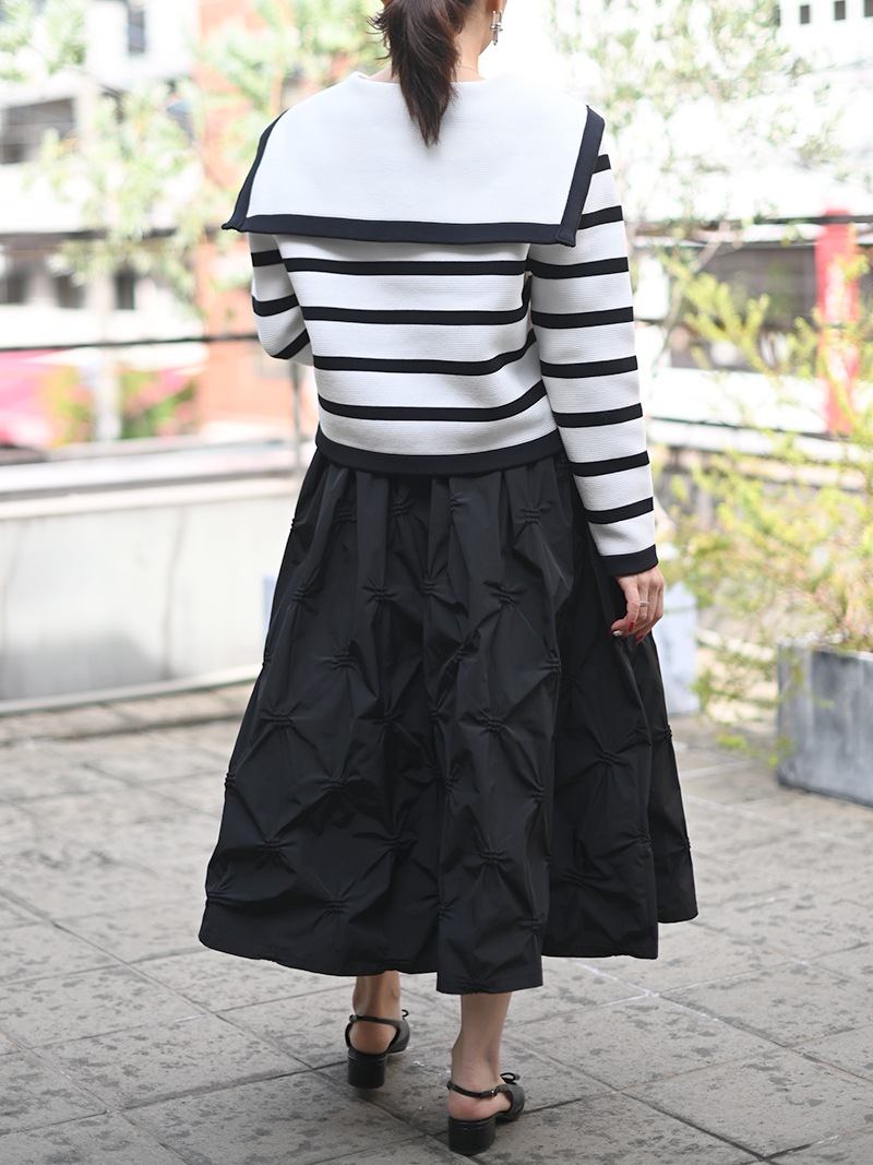 フレンチシックなセーラーカラーに立体的に編み立てたボーダーがポイント。Vネックラインですっきりとさせ、着丈はコンパクトに仕上げました。