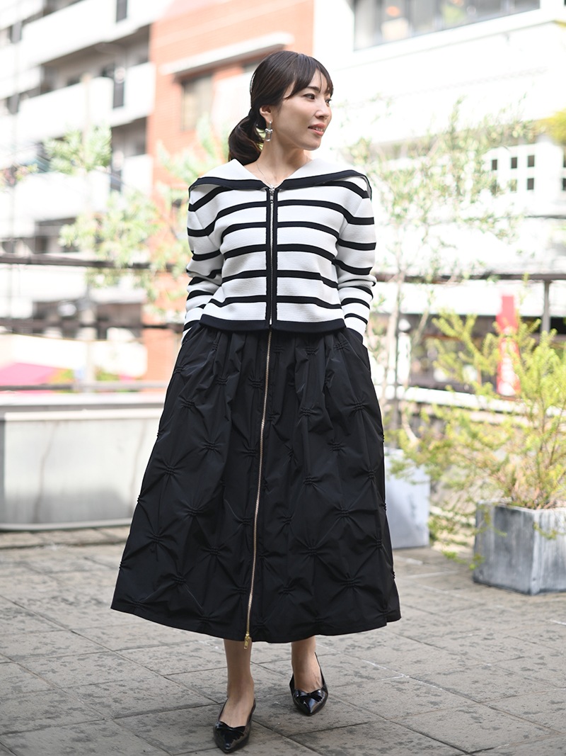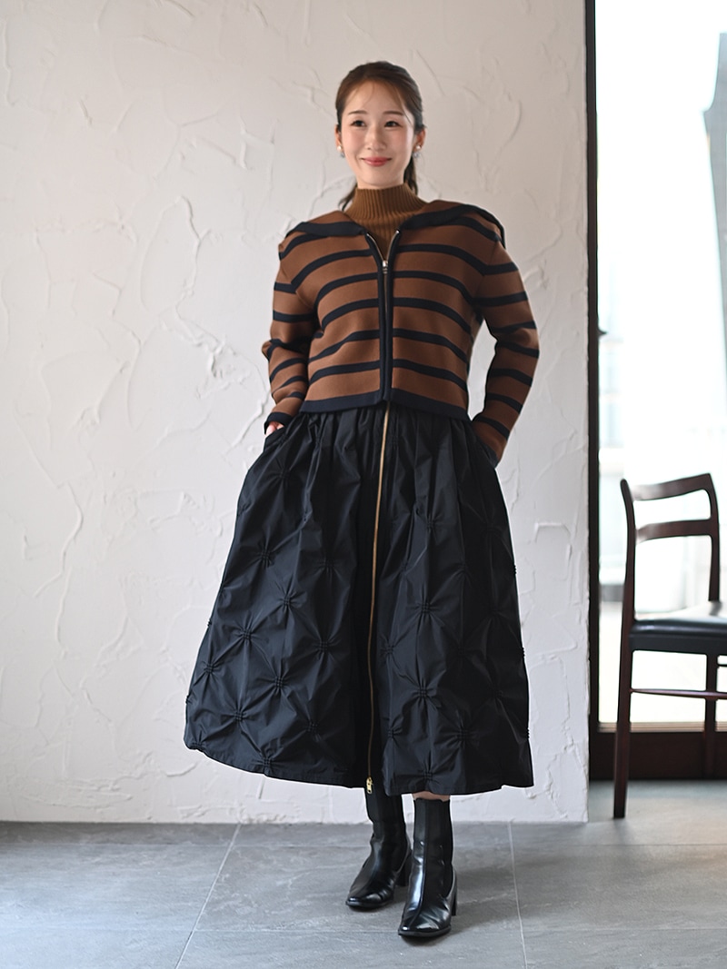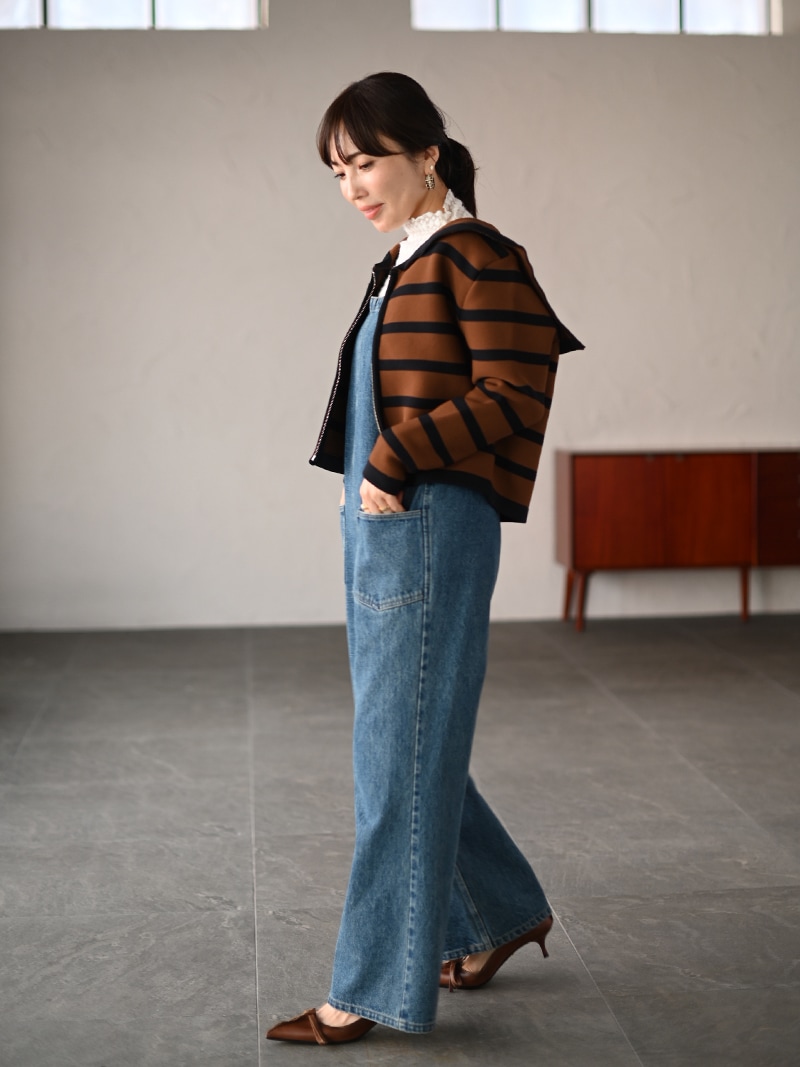 季節に合わせてニットやカットソーなどをインしてレイヤードスタイルをお楽しみいただけます。